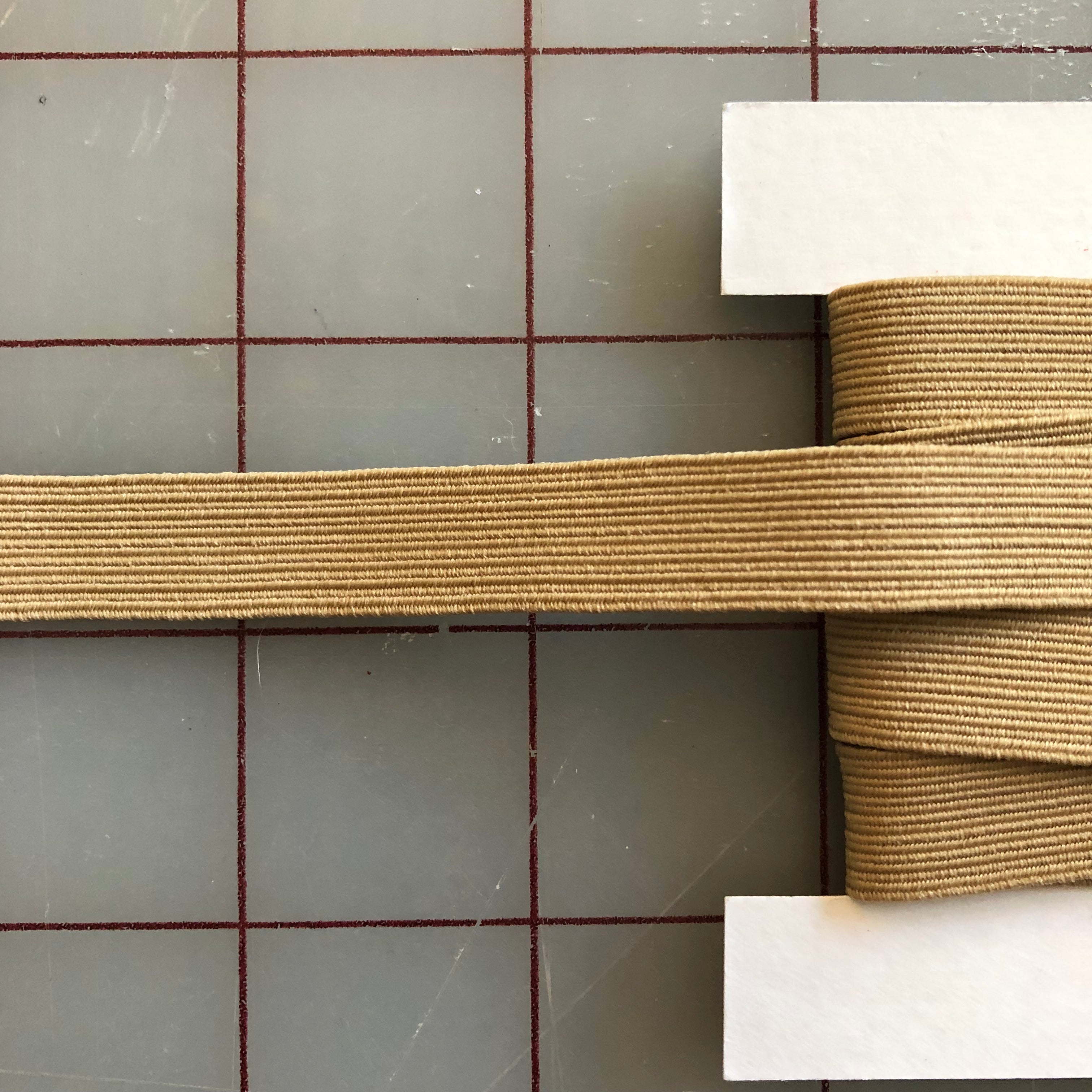Priced per yard. Beige skintone braided elastic, 1/2-inch wide. Strong, but comfortable for shoulder straps on bodices.