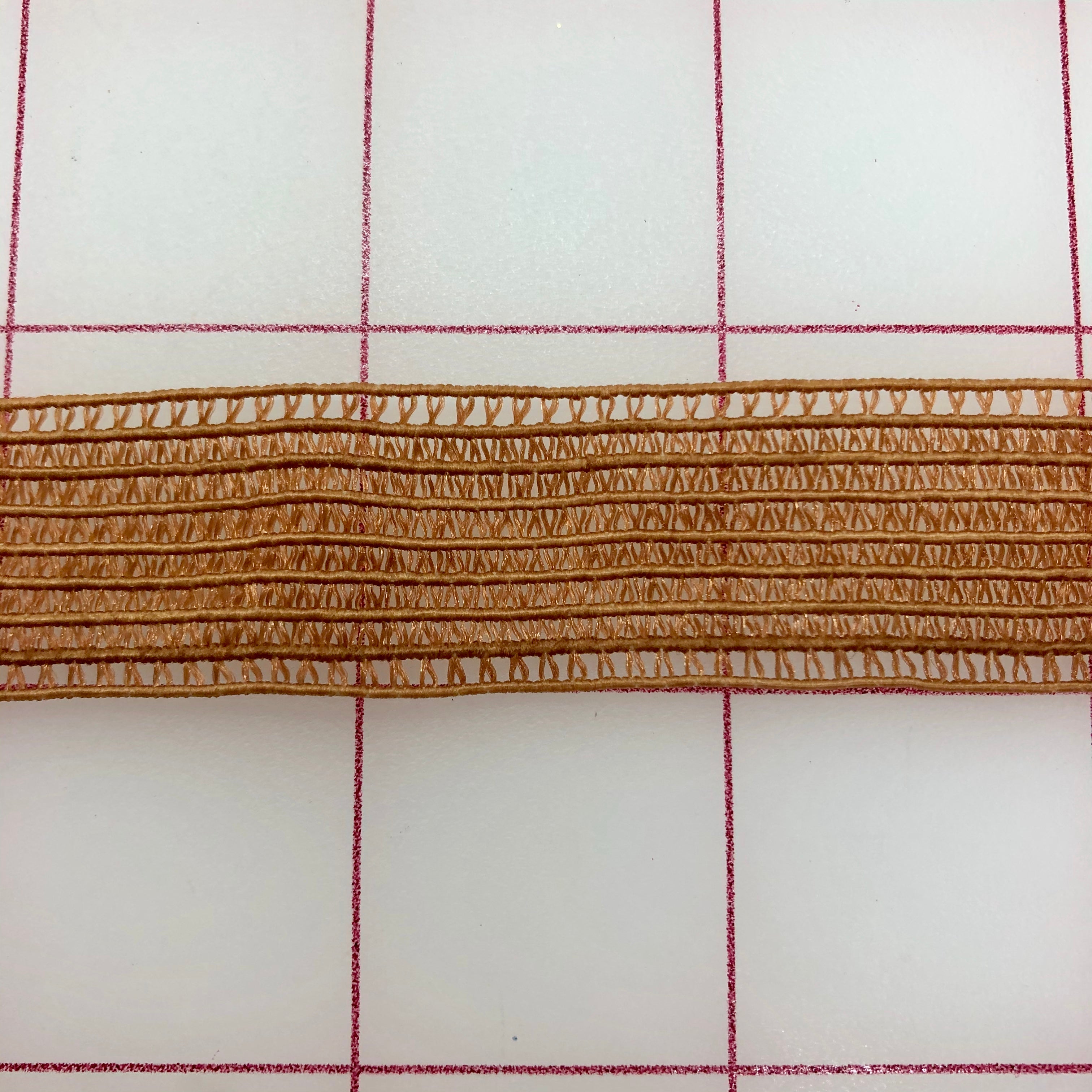 Priced per yard. Mocha Latte invisible mesh elastic. 7/8-inch wide. Perfect for bodice shoulder straps for medium brown skintones.  Lighting shines through the small holes in the mesh and helps the elastic to blend with various skintones.