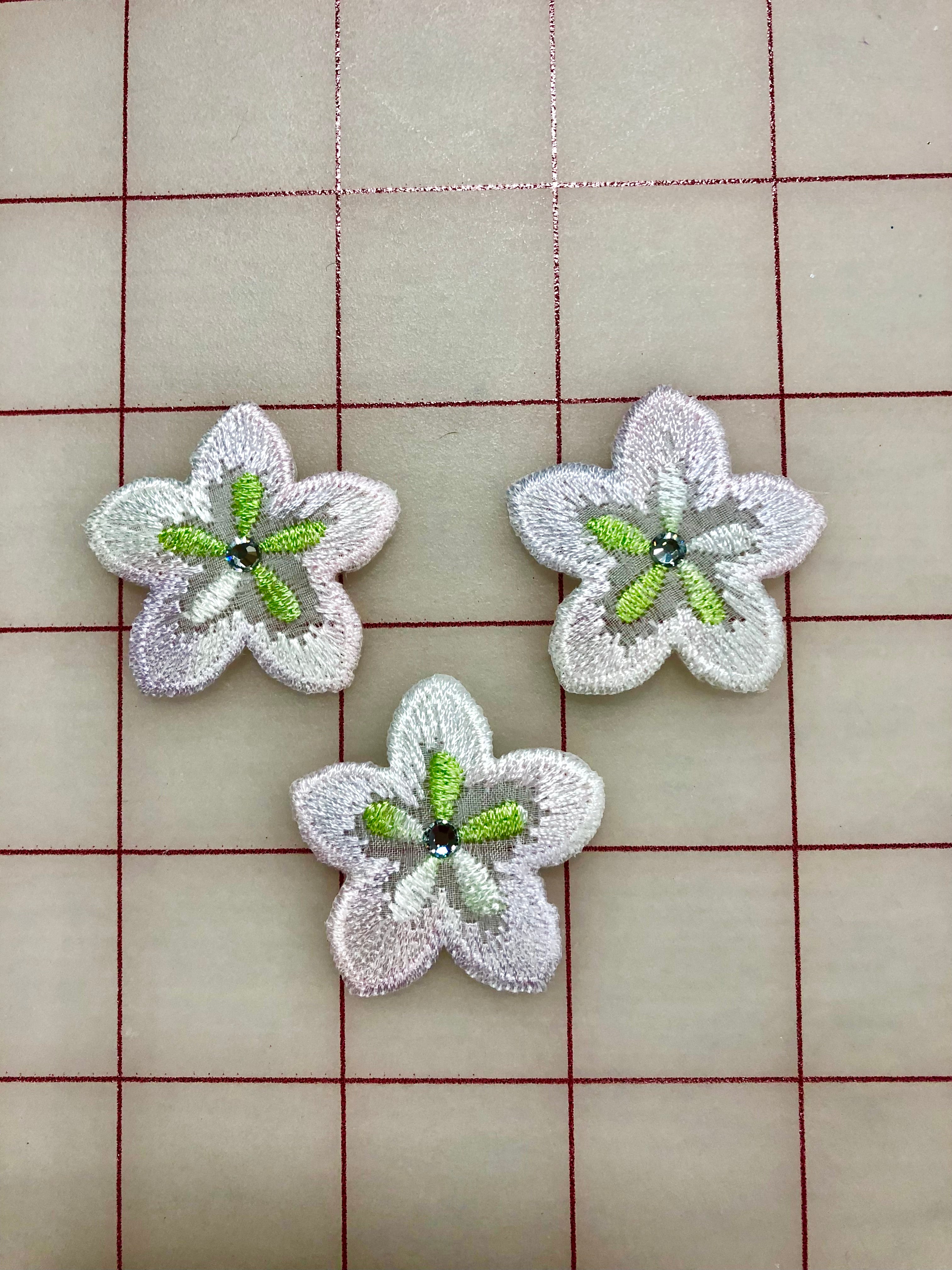 Priced per 3-pack. White, shading to palest pink, vintage iron-on flowers. Great added touch to the embellishments of many costumes and headpieces.
