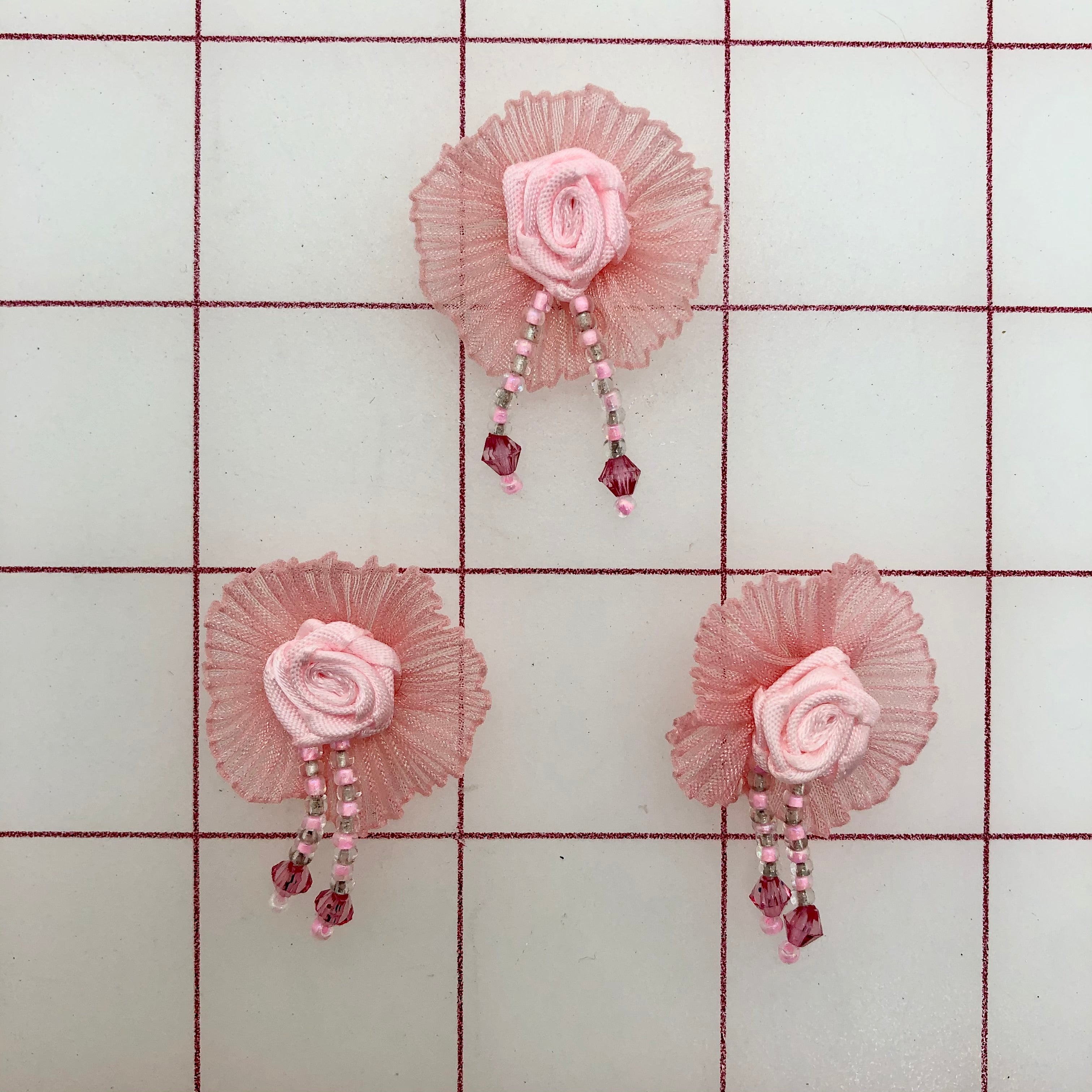 Priced per 3-pack. Pink/coral rosette with ruffle and beads. Great added touch to the embellishments of many costumes and headpieces. 20% discount per dozen. For size: One square equals one inch.