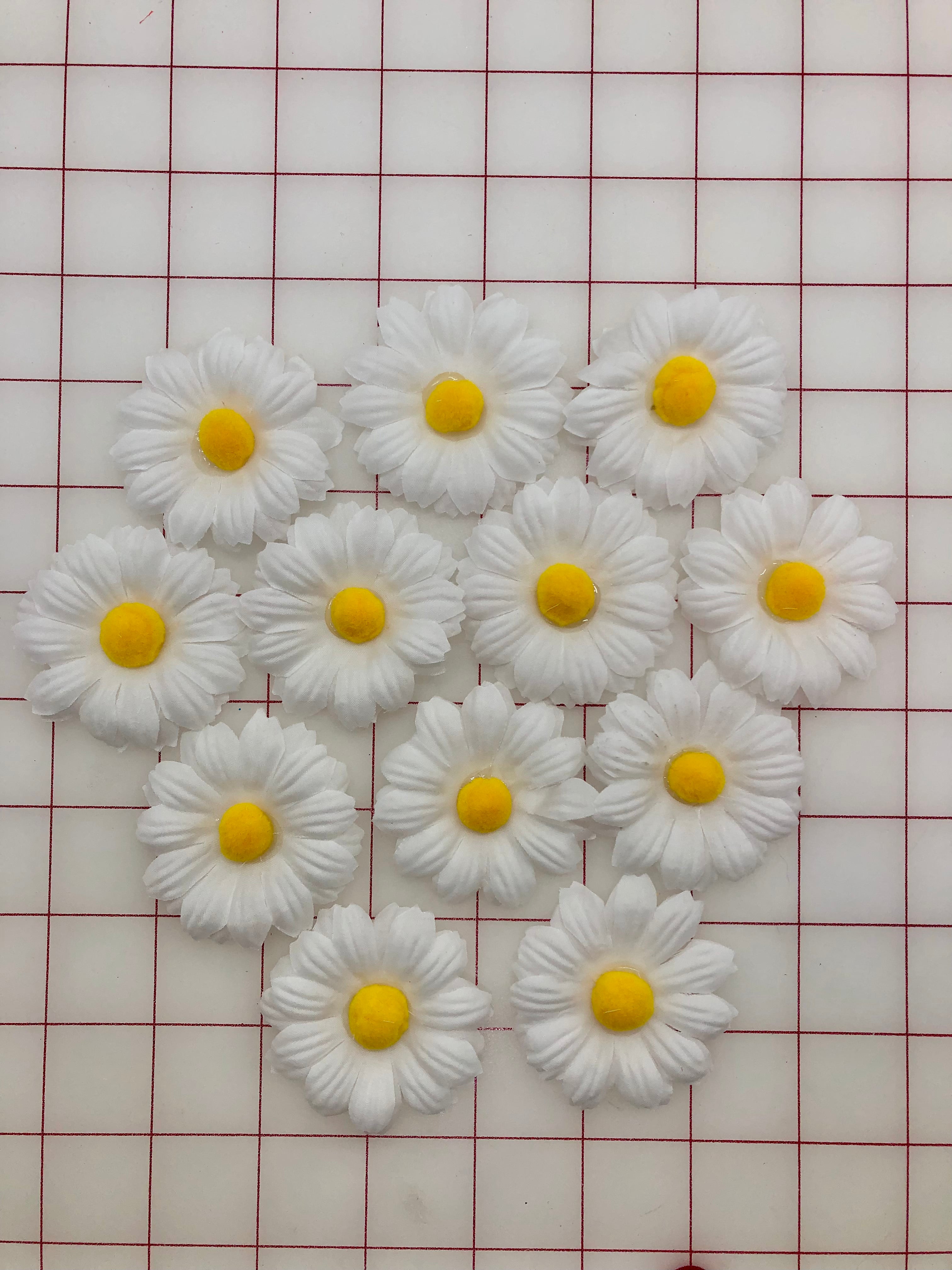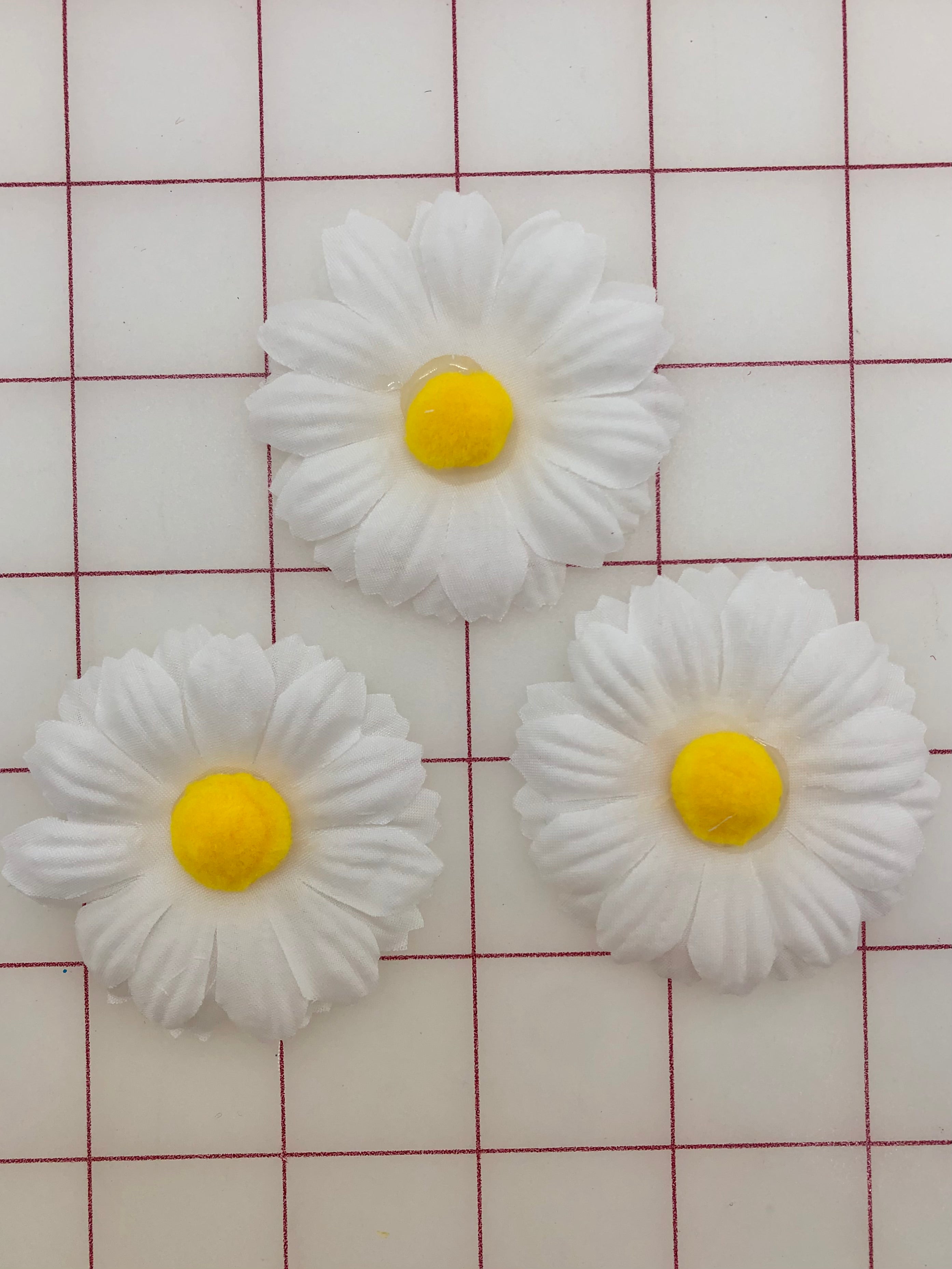 Priced per 3-pack. White and yellow daisy flower applique. A lovely added touch to a peasant costume, headpieces, and many other costumes. For size: One square equals one inch.