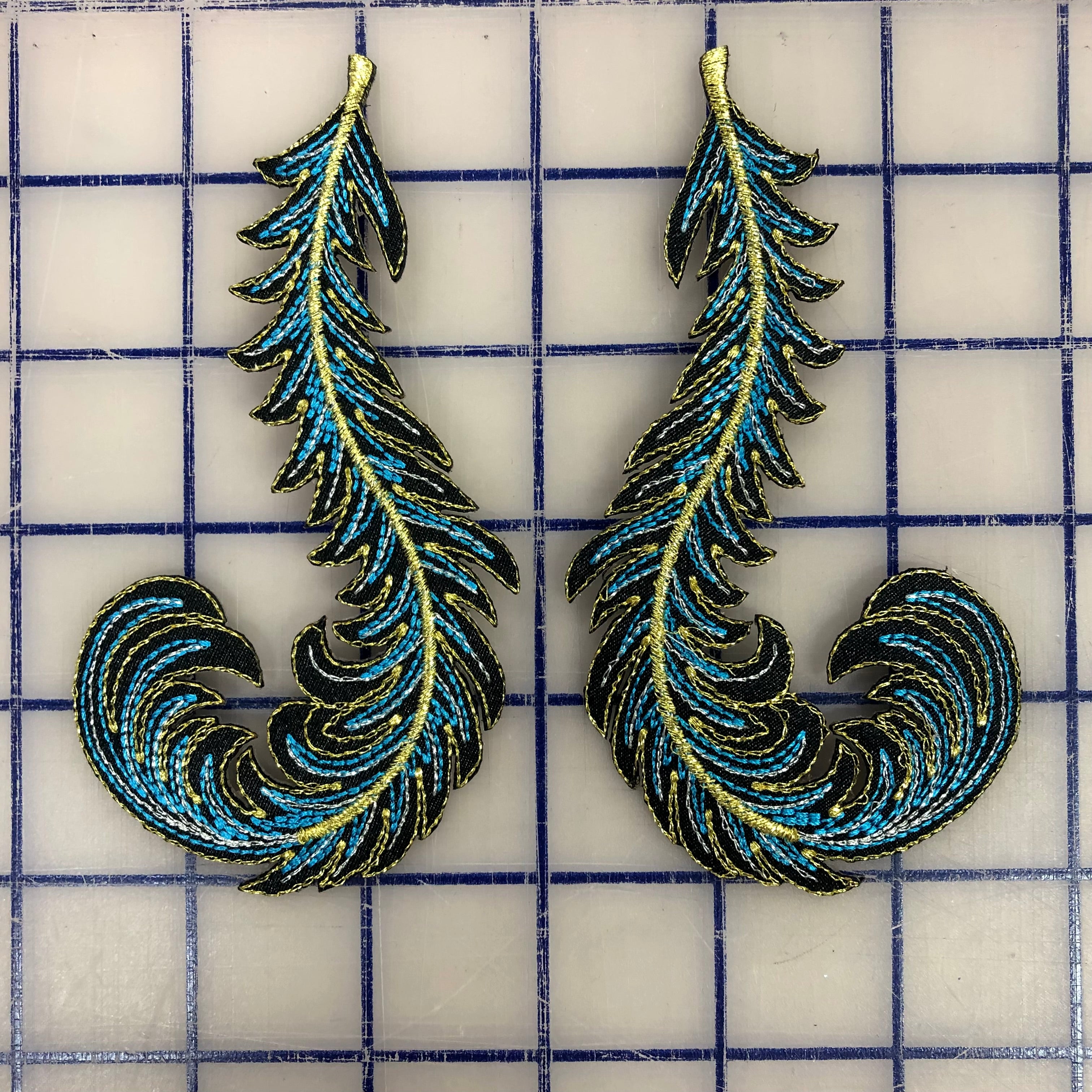 Priced per pair. Black/ Blue/ Gold. Iron-On. Embroidered feather applique pairs.