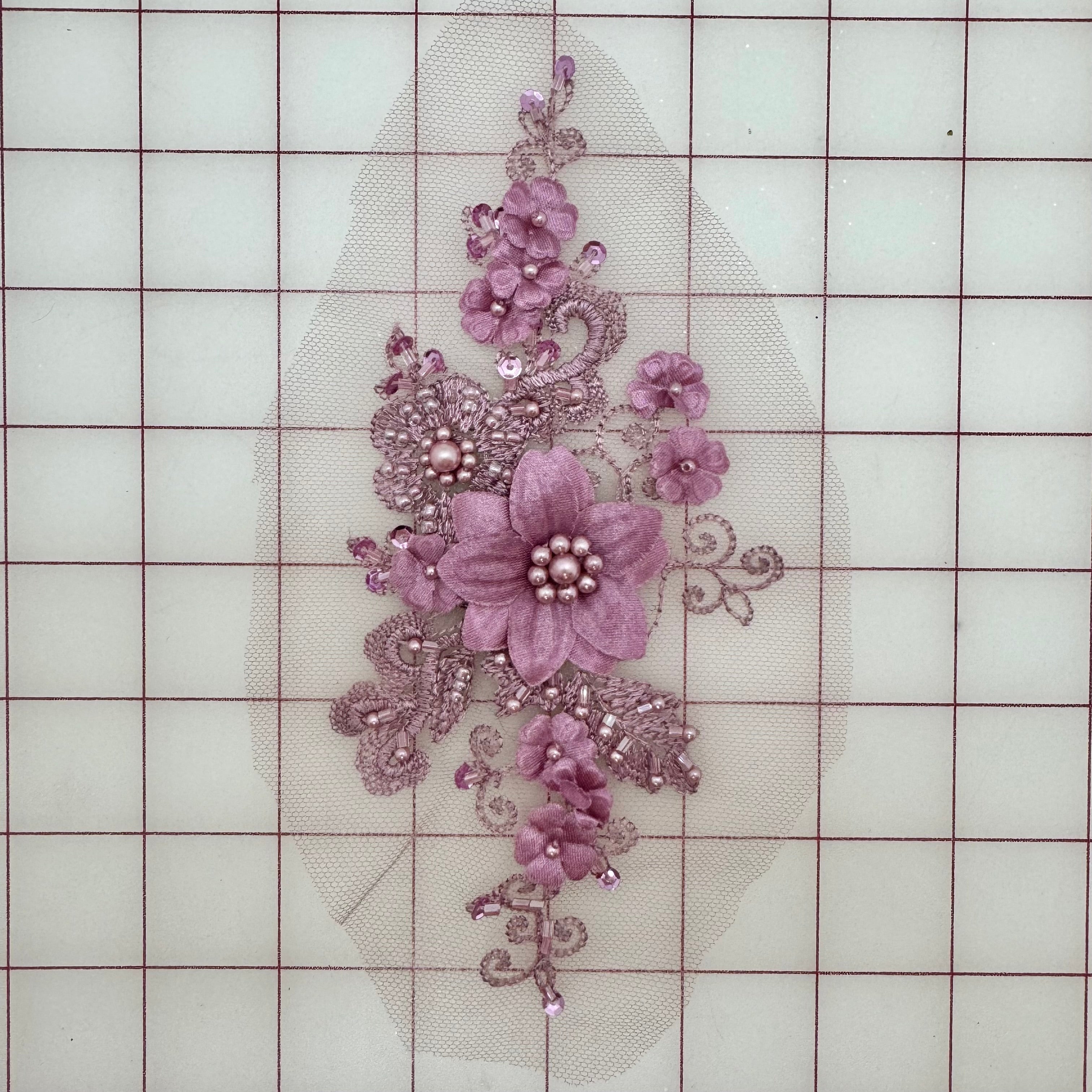 Priced per piece. Dusty Mauve, 3D flower, beaded, embroidered lace appliques.