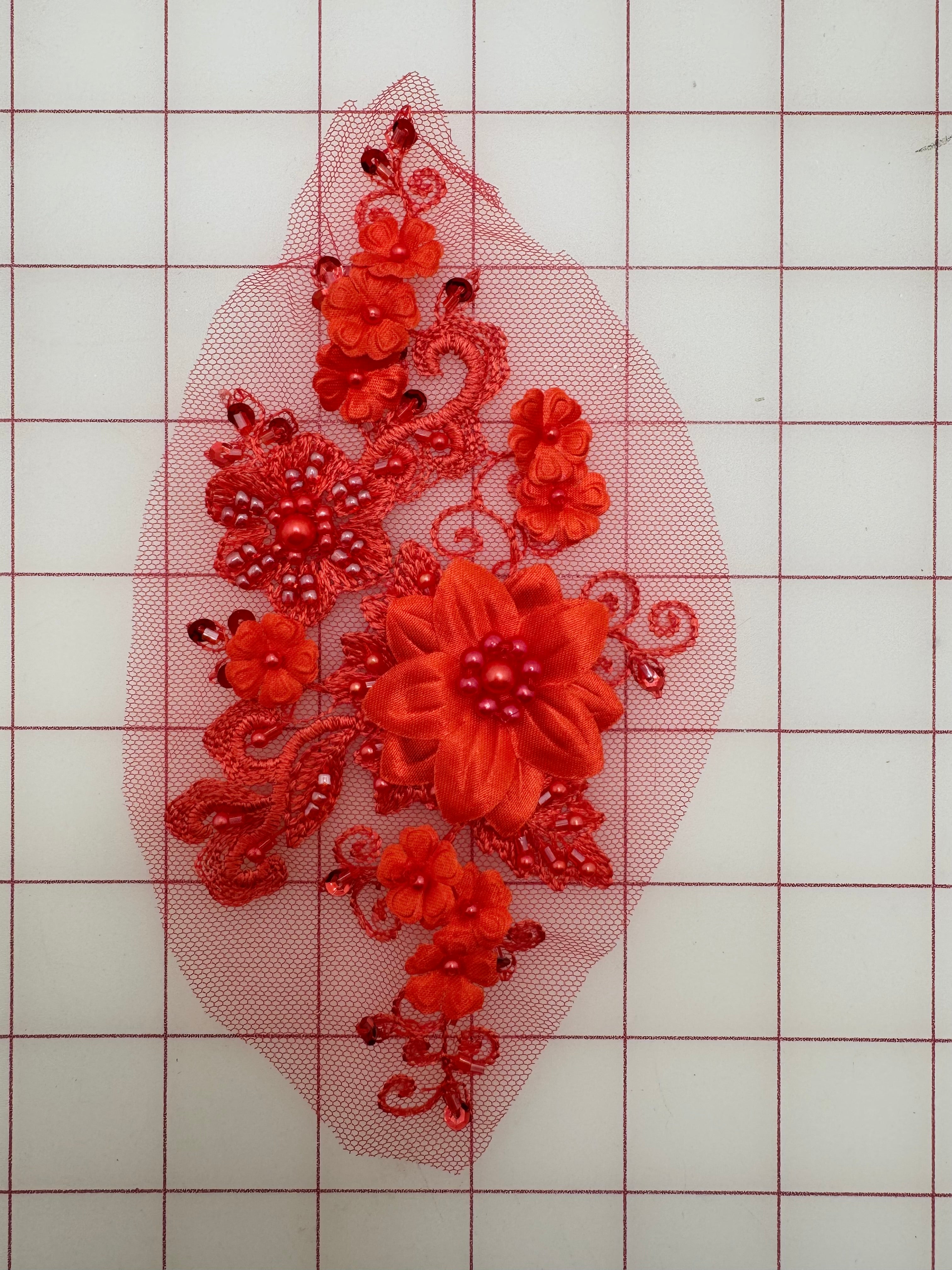 Priced per piece. Stunning, red, beaded, embroidered lace.