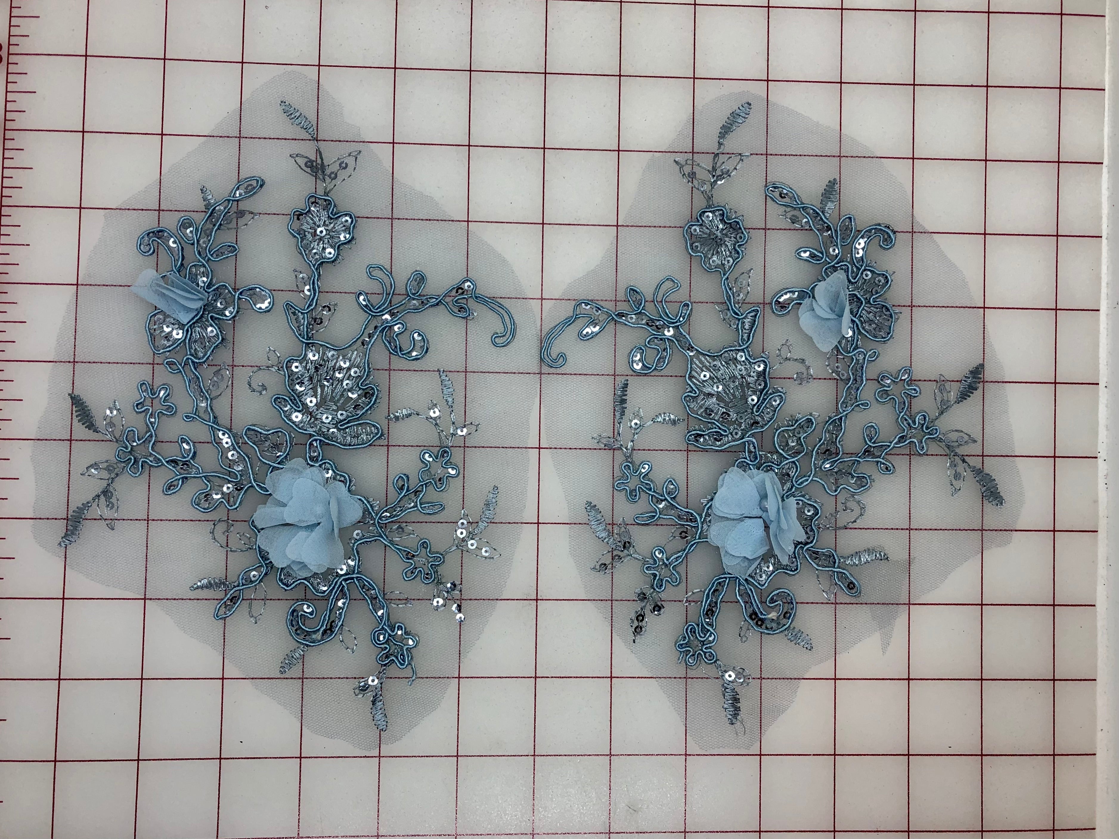 Priced per pair. 3D sequined lace flower motif pairs. Light Blue. Lightweight. Perfect for tutu embellishment - Princess Florine, Snow Queen, etc. For size: one square equals one inch.