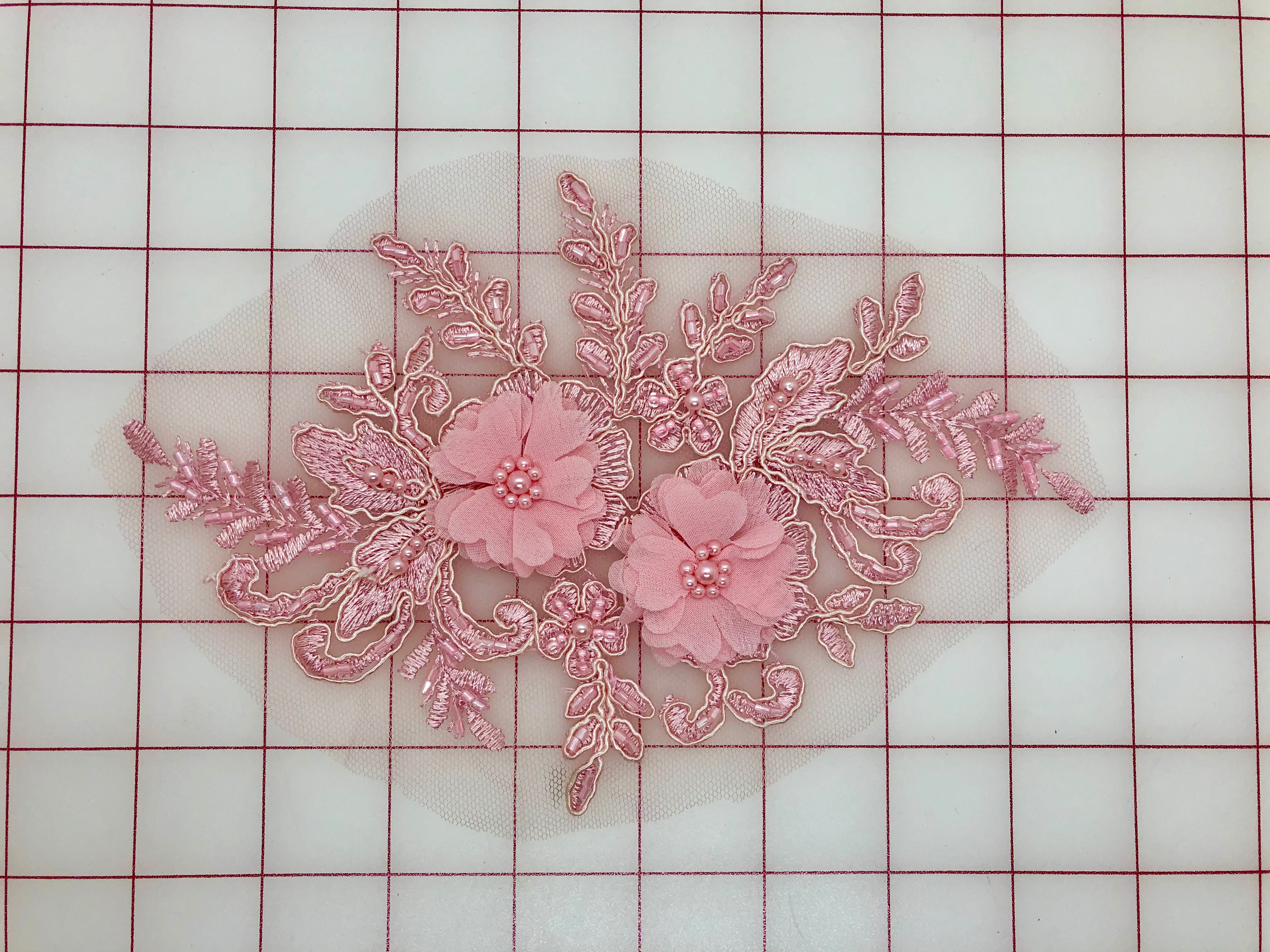 Priced per piece. Beautiful beaded lace 3D flower motif. Soft Rose Pink. Lightweight.