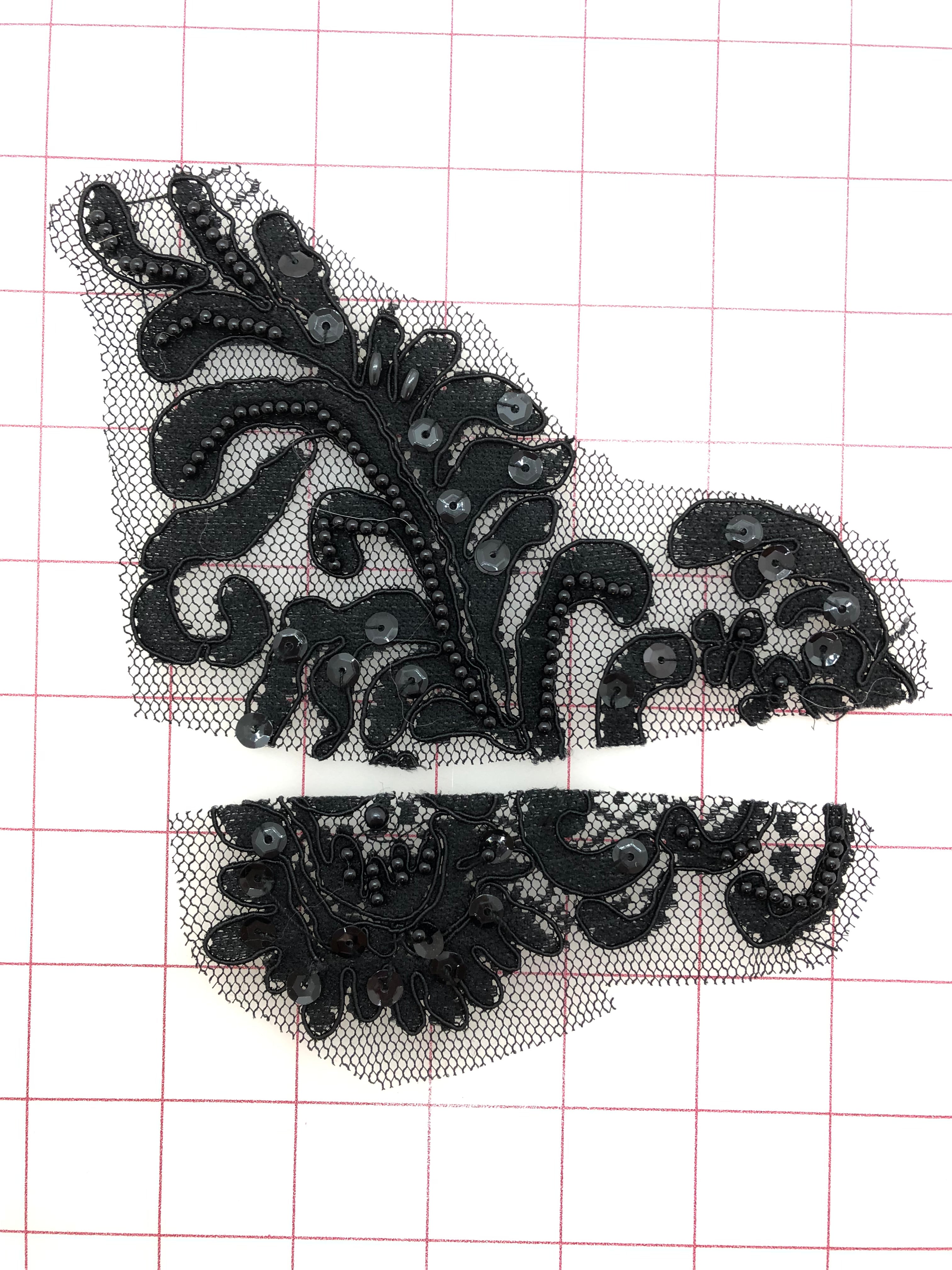 Priced each set. Set of 4 (A), or 2 (B), or 2 (C) or 3 (D) beaded and sequined lace motifs. Black.