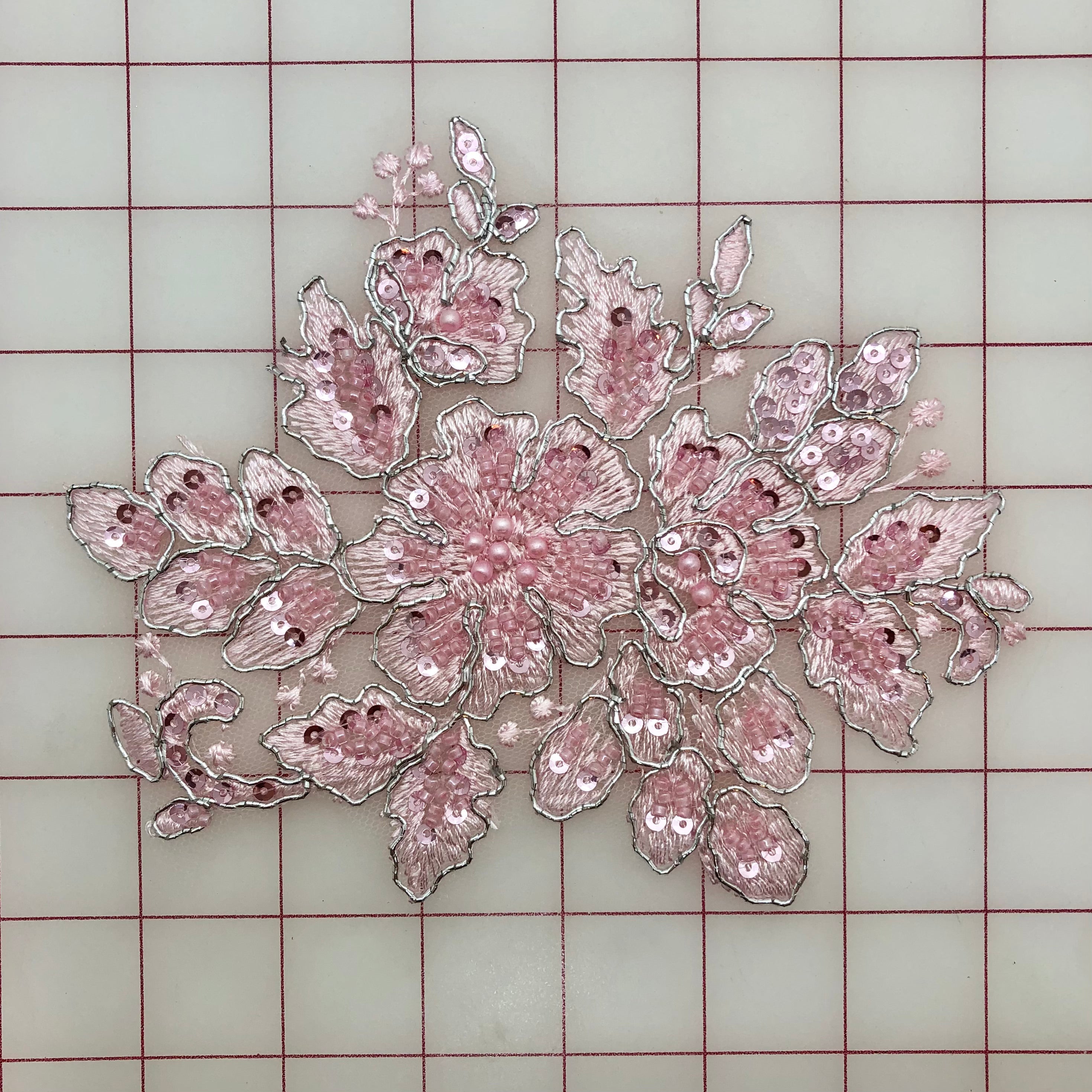 Priced per pair. Beautiful light pink and silver-corded and sequined lace motif pairs. Can be used many different ways! Easy to cut into smaller motifs.