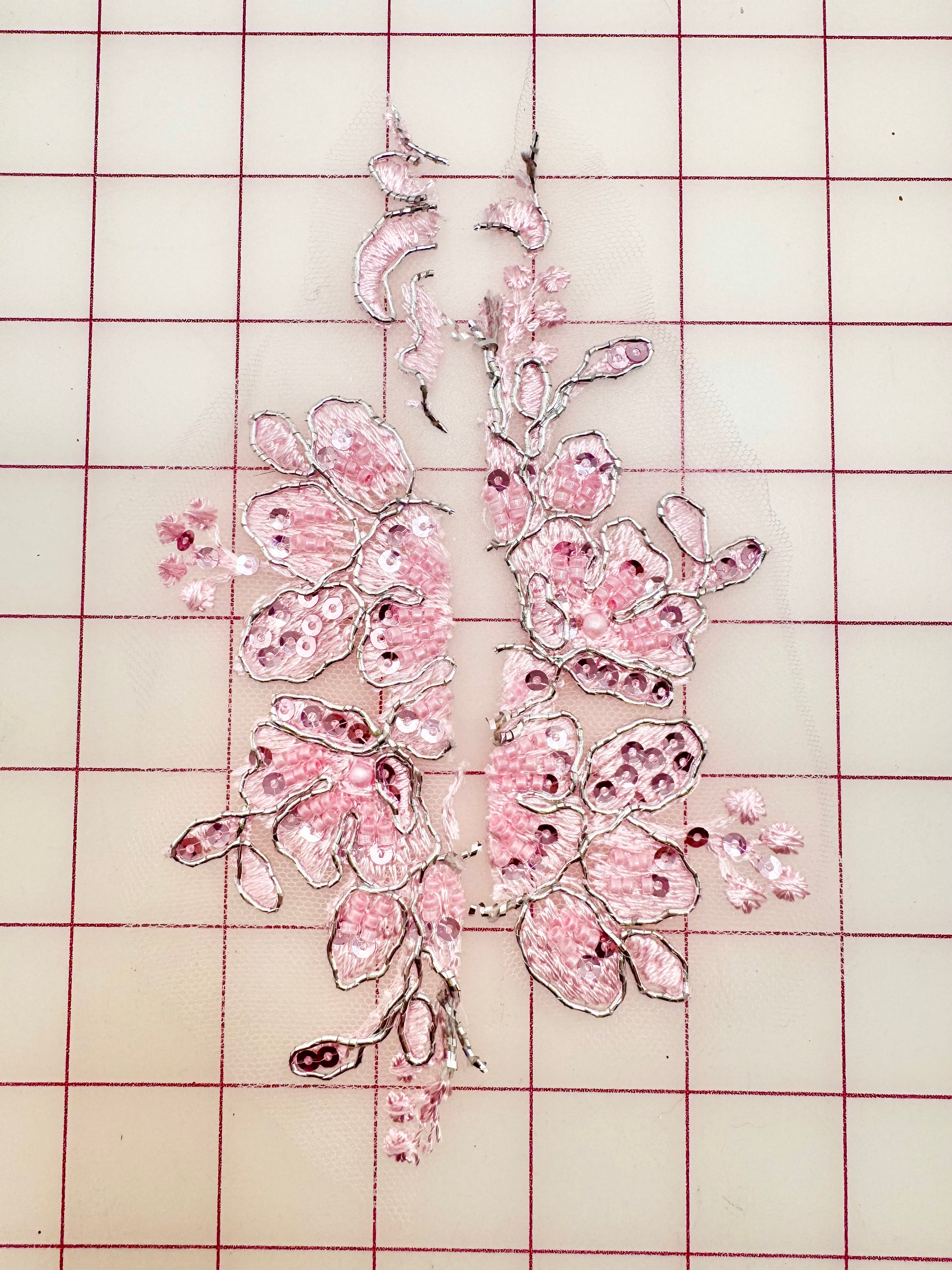 Priced per 2-piece set Beautiful light pink and silver-corded and sequined lace motif.s Can be used many different ways! Easy to cut into smaller motifs.