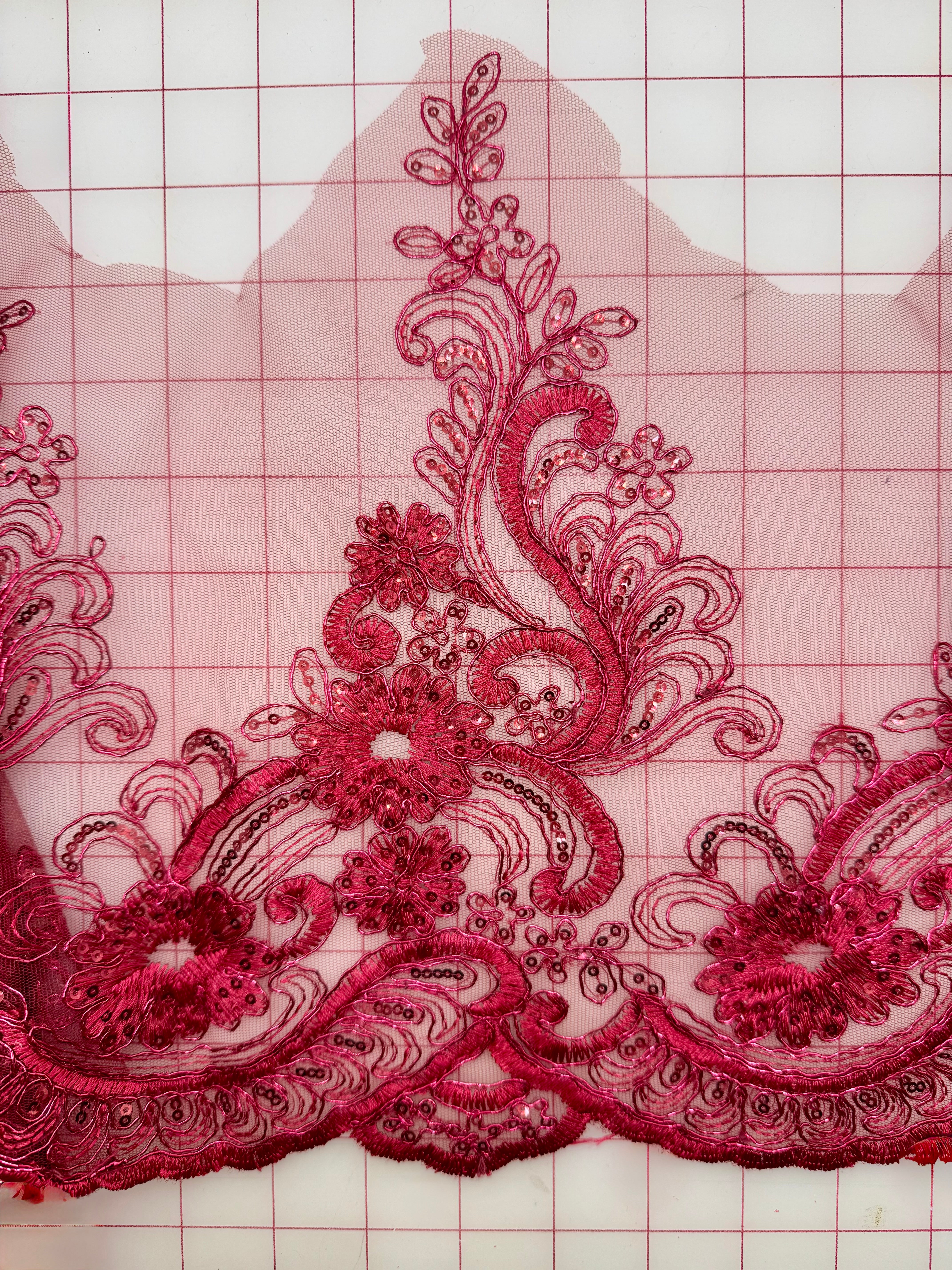 Priced per one-yard piece. Beautiful burgundy sequined border lace. Lightweight. Can be easily cut into smaller motifs.