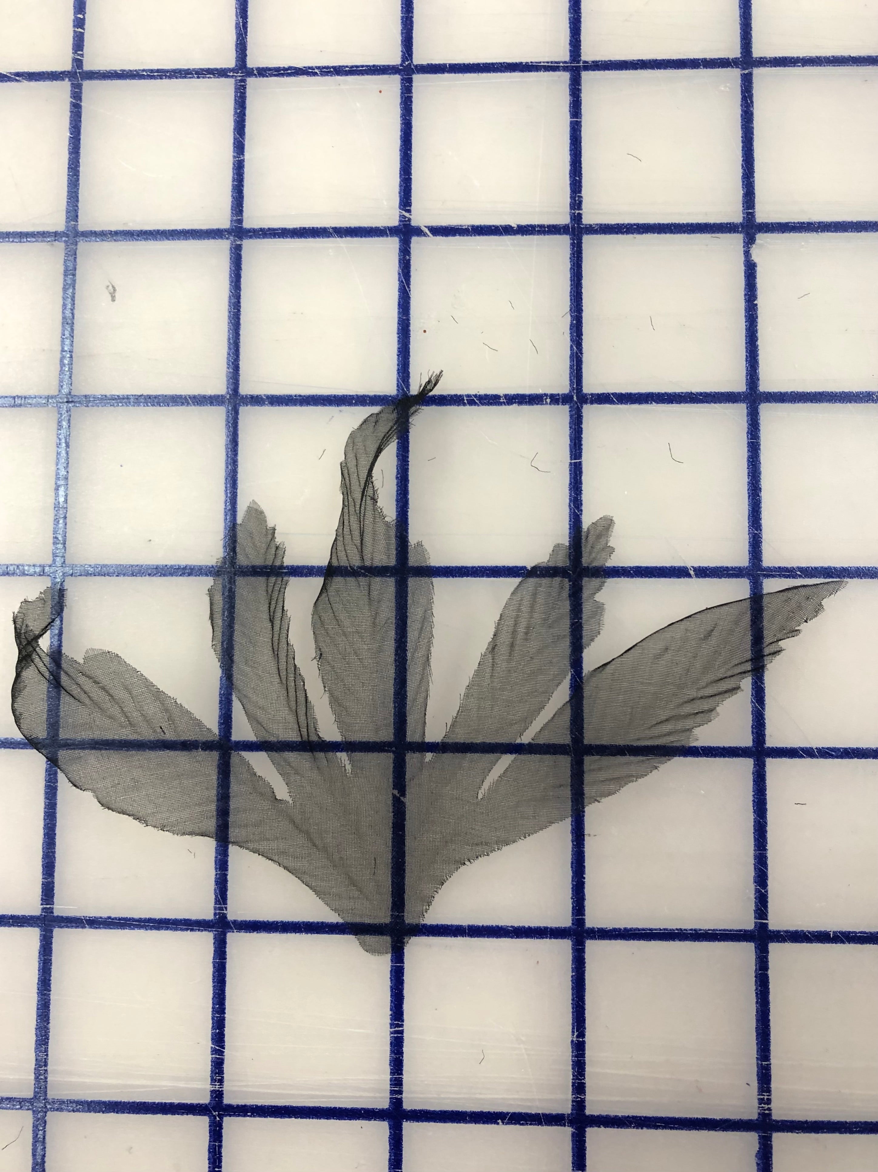 Priced per five-feather piece. Black organza feather applique. Great for use in Swan Lake - Odile embellishments. 20% discount Gross (12 dozen) of one color. For size: One square equals one inch.