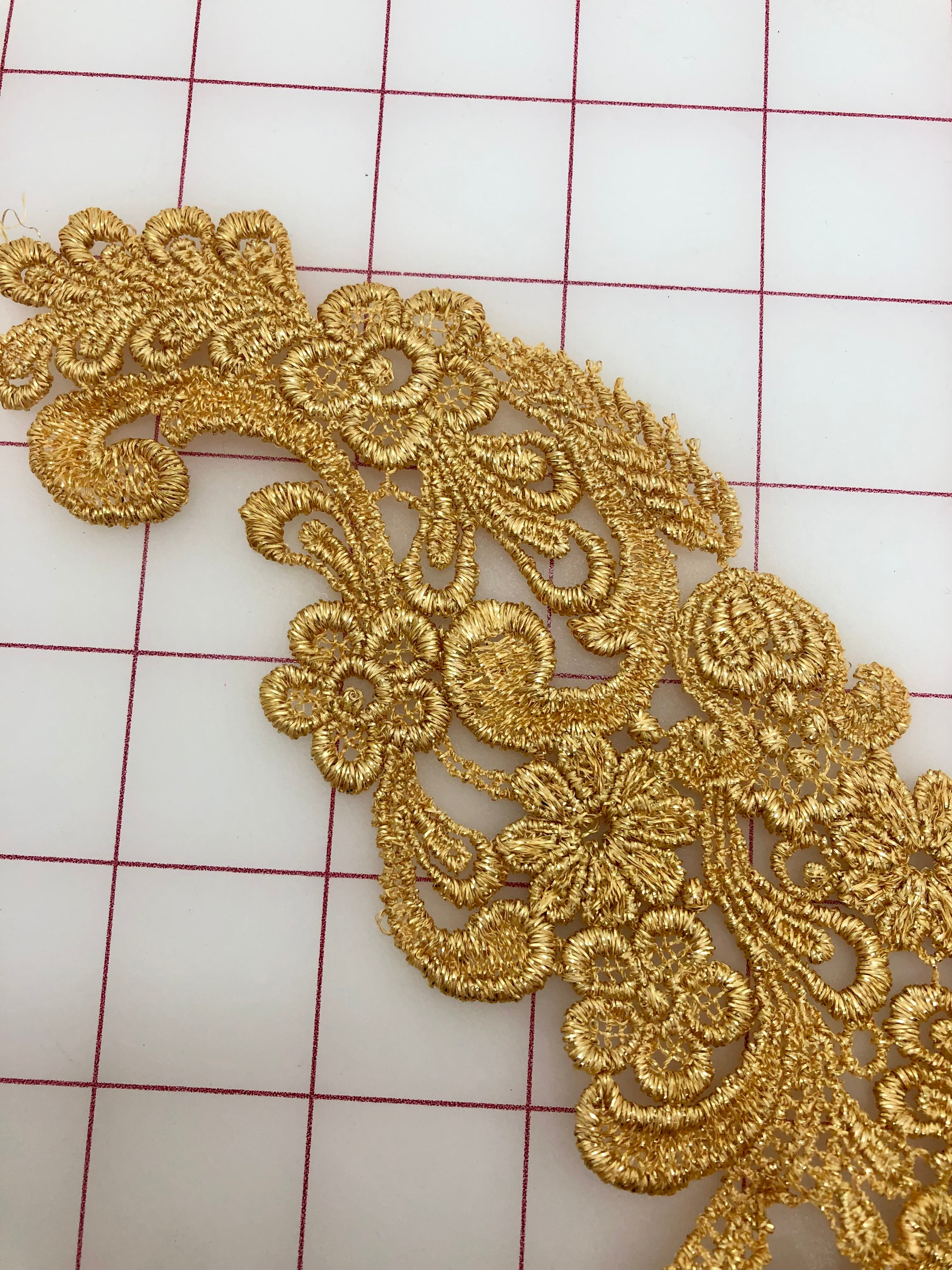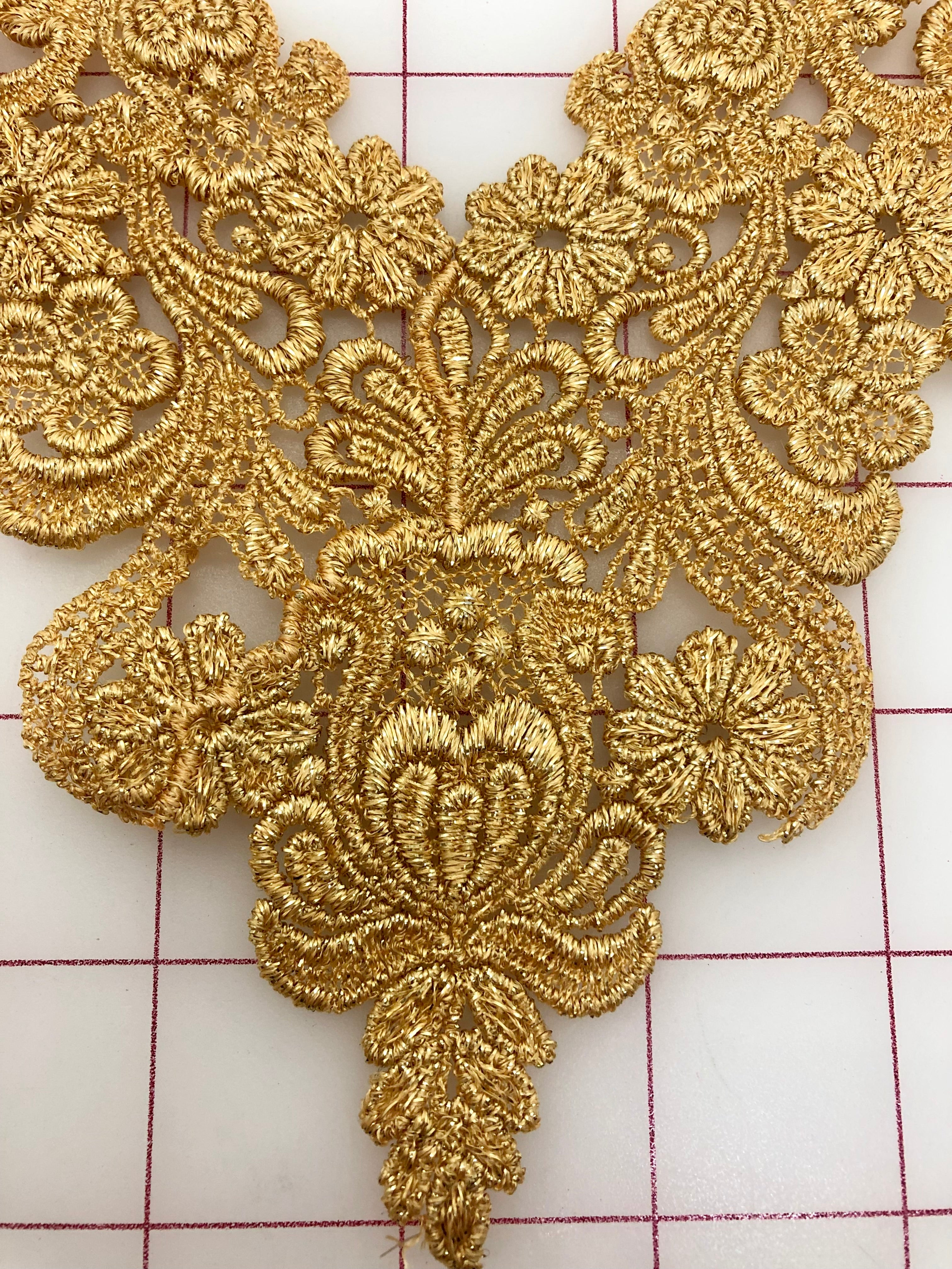 Priced each. Bright Gold Venise Lace. This applique can be easily cut down into many beautiful motifs and rearranged to make a one-of-a-kind design!