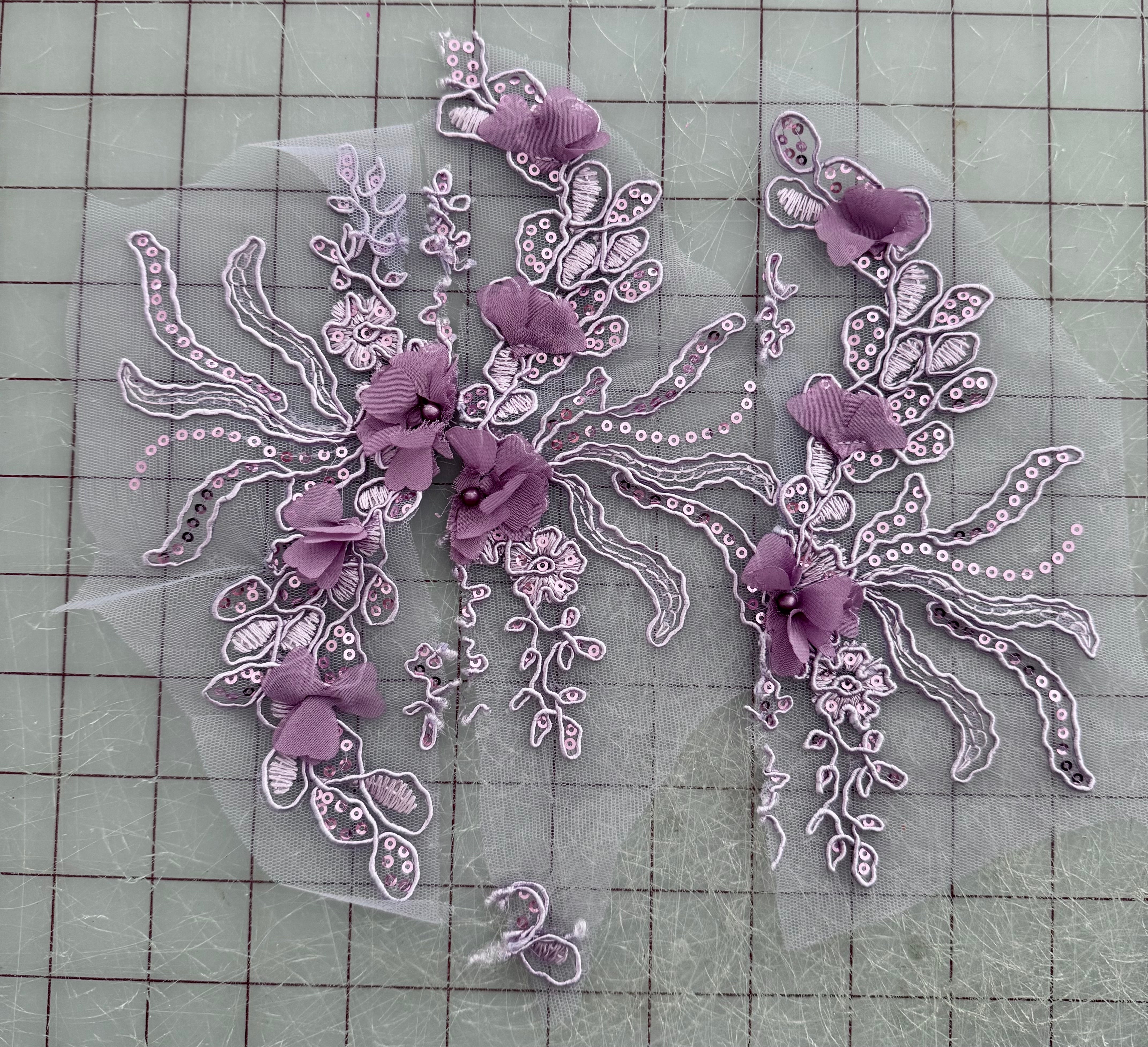 Priced per 3 pieces. Lavender, corded, sequined, embroidered 3D lace.