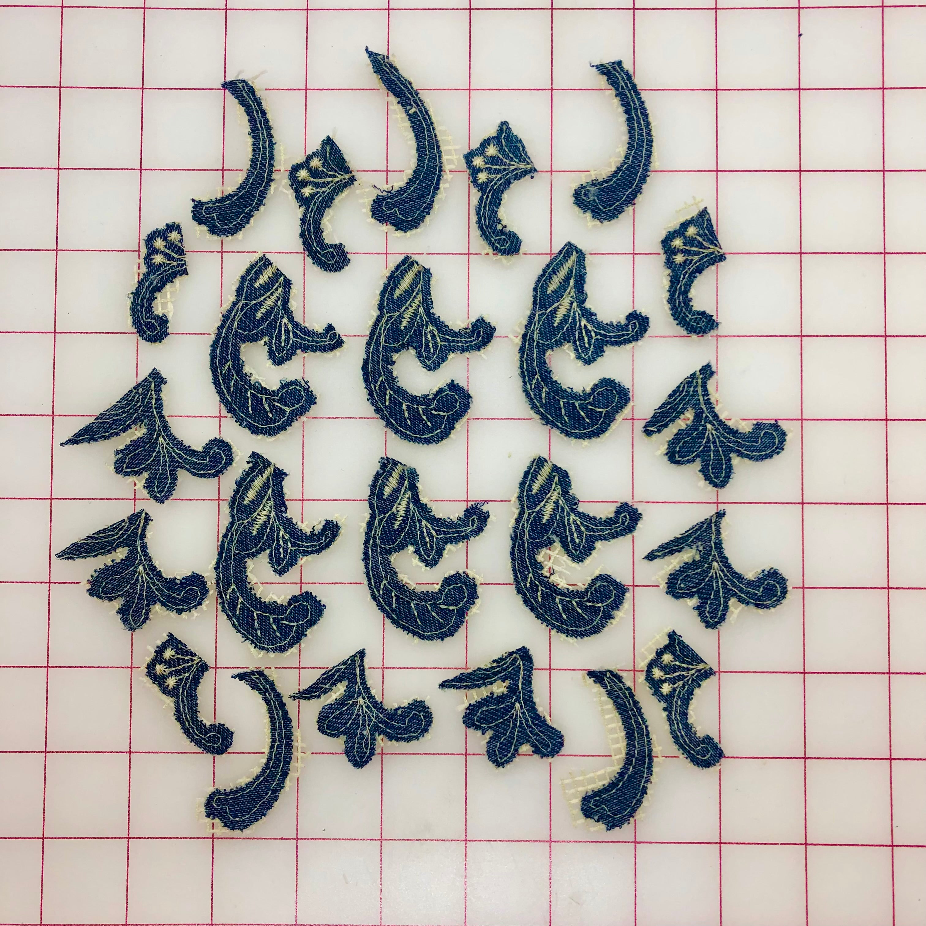 Priced per 23-piece pack. Beautiful Denim blue swirl appliques.