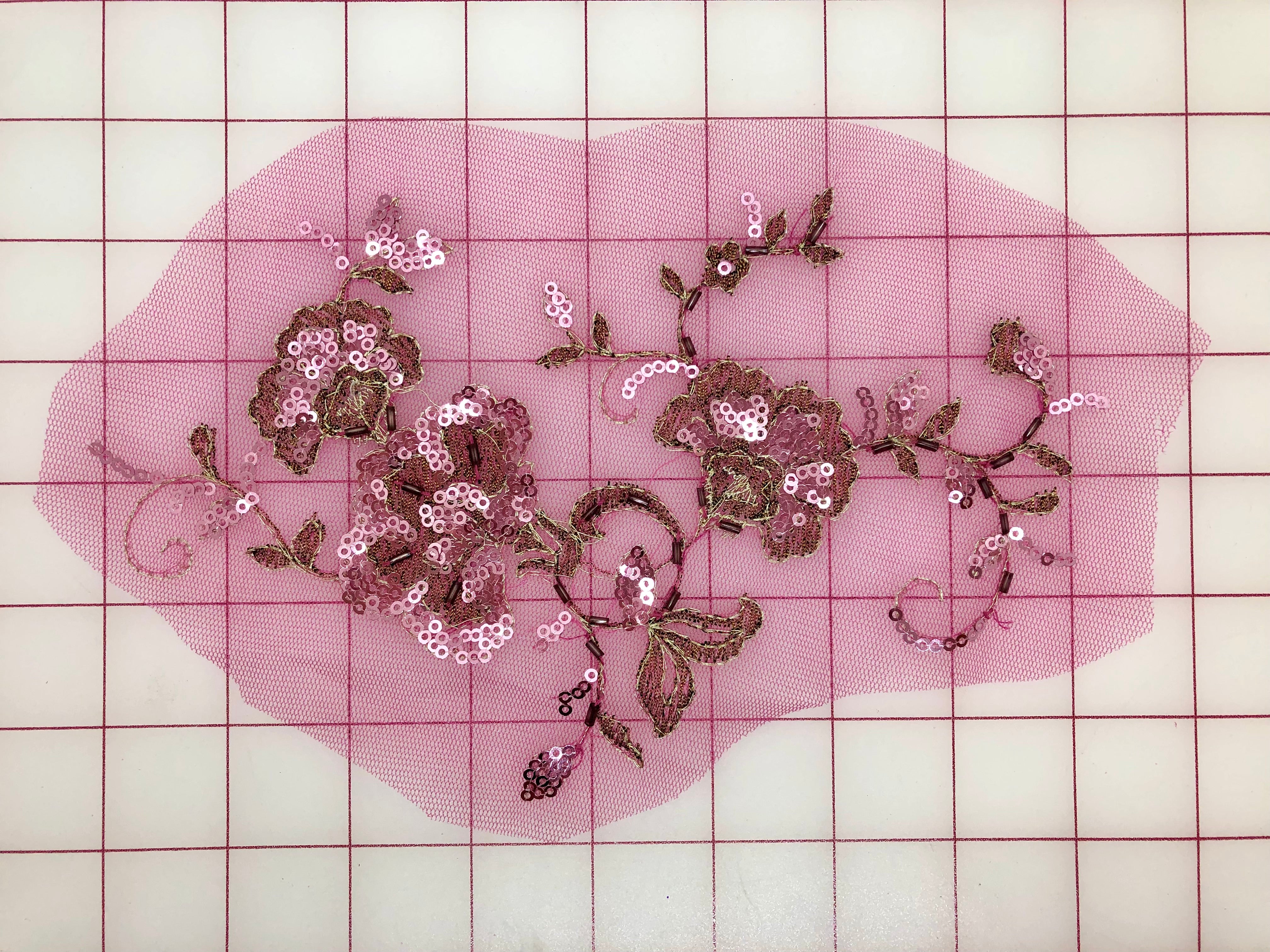 Priced per piece. Delicate large embroidered and sequined, pink and copper flower-design motif set on rose-colored tulle. Lightweight.