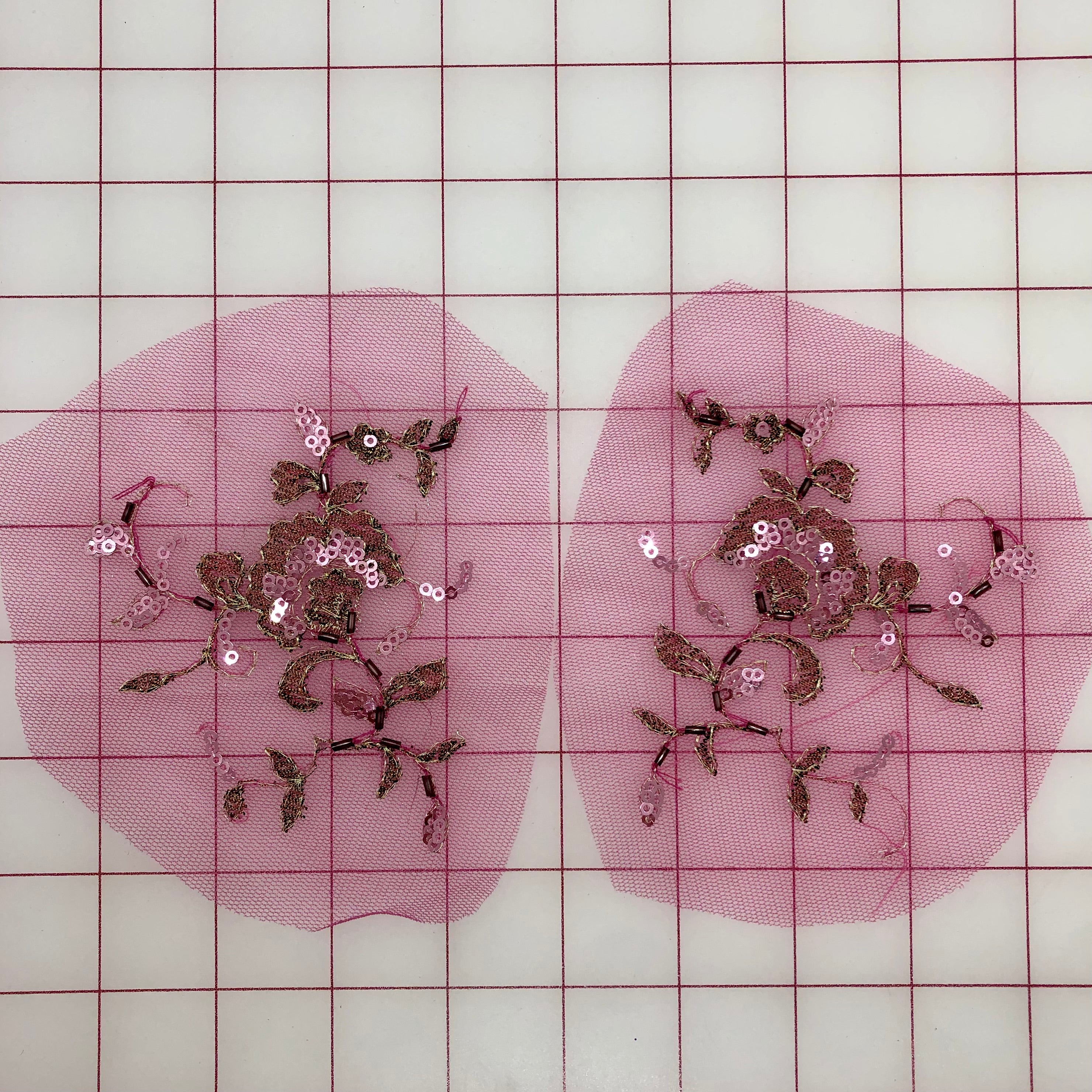Priced per pair. Delicate embroidered and sequined, pink and copper flower-design motif set on rose-colored tulle. Lightweight. Perfect for use on many pink shades for tutu embellishment. For size: one square equals one inch.