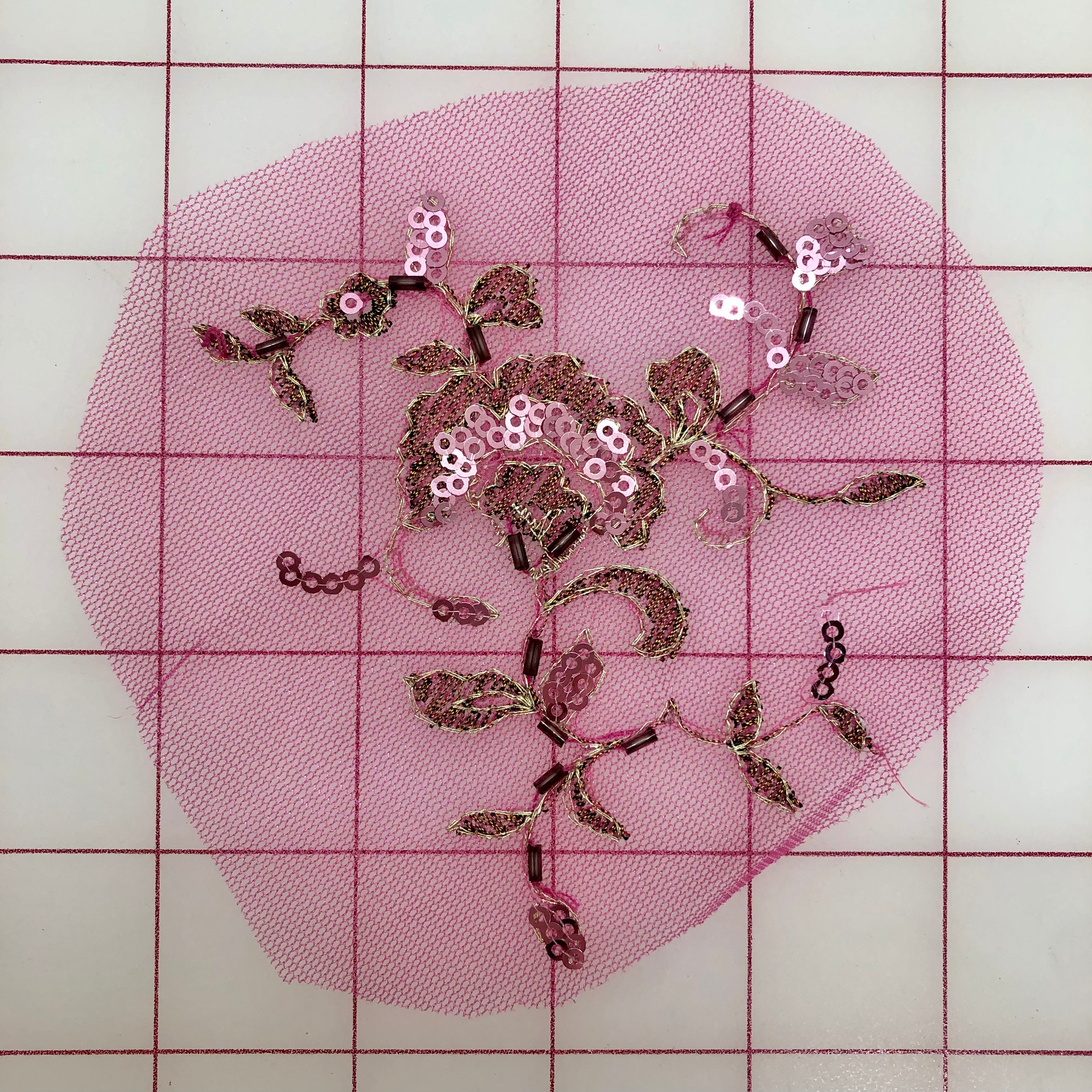 Priced per piece. Delicate embroidered and sequined, pink and copper flower-design motif set on rose-colored tulle. Lightweight. Perfect for use on many pink shades for tutu embellishment. For size: one square equals one inch.