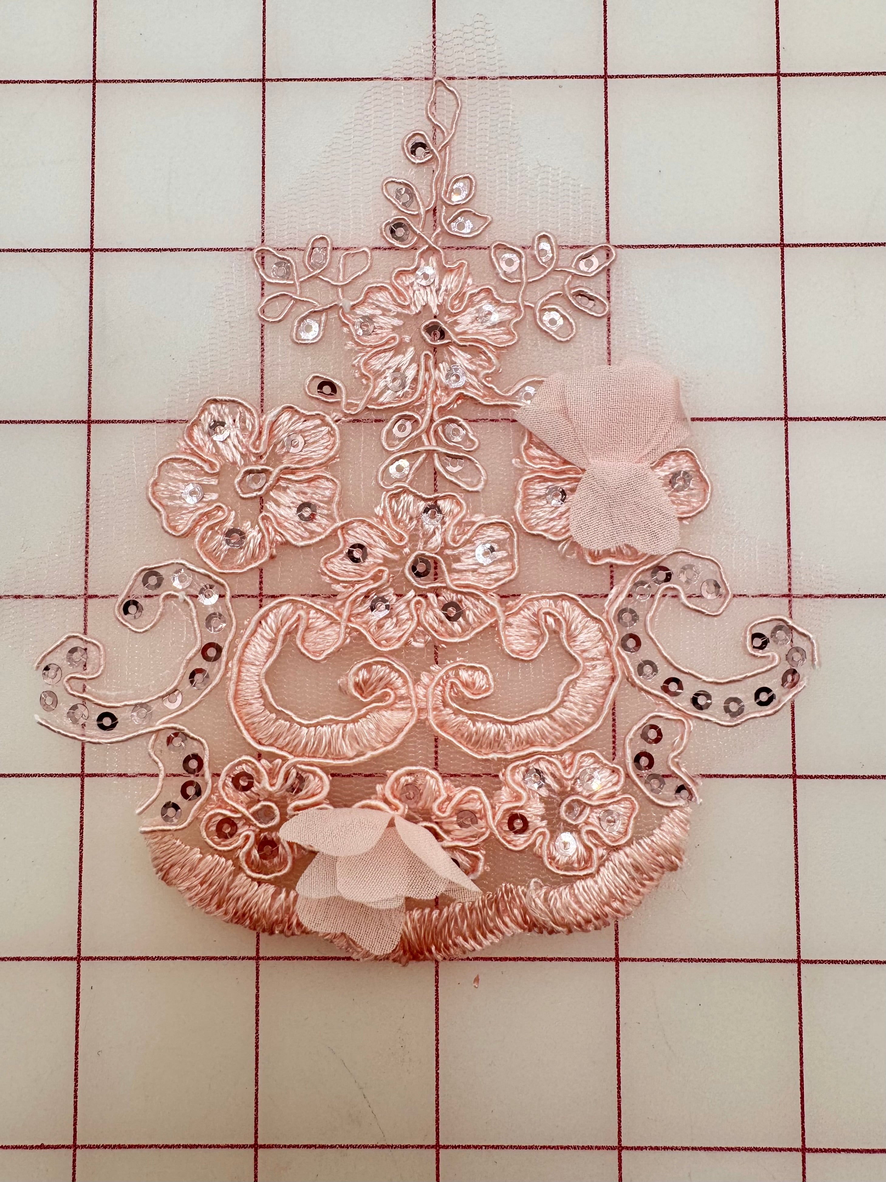 Priced per piece. Pink, corded, sequined, embroidered 3D lace.