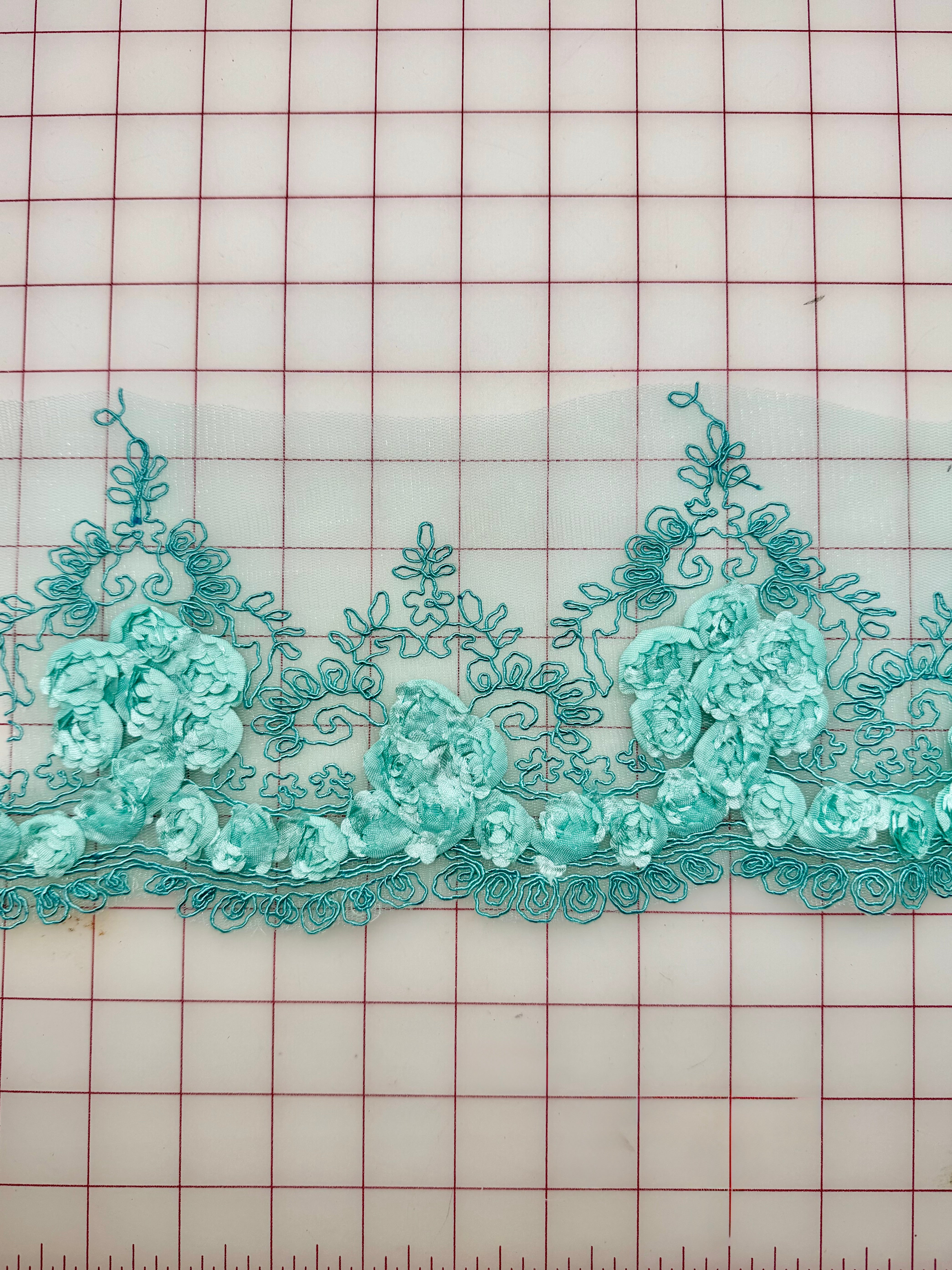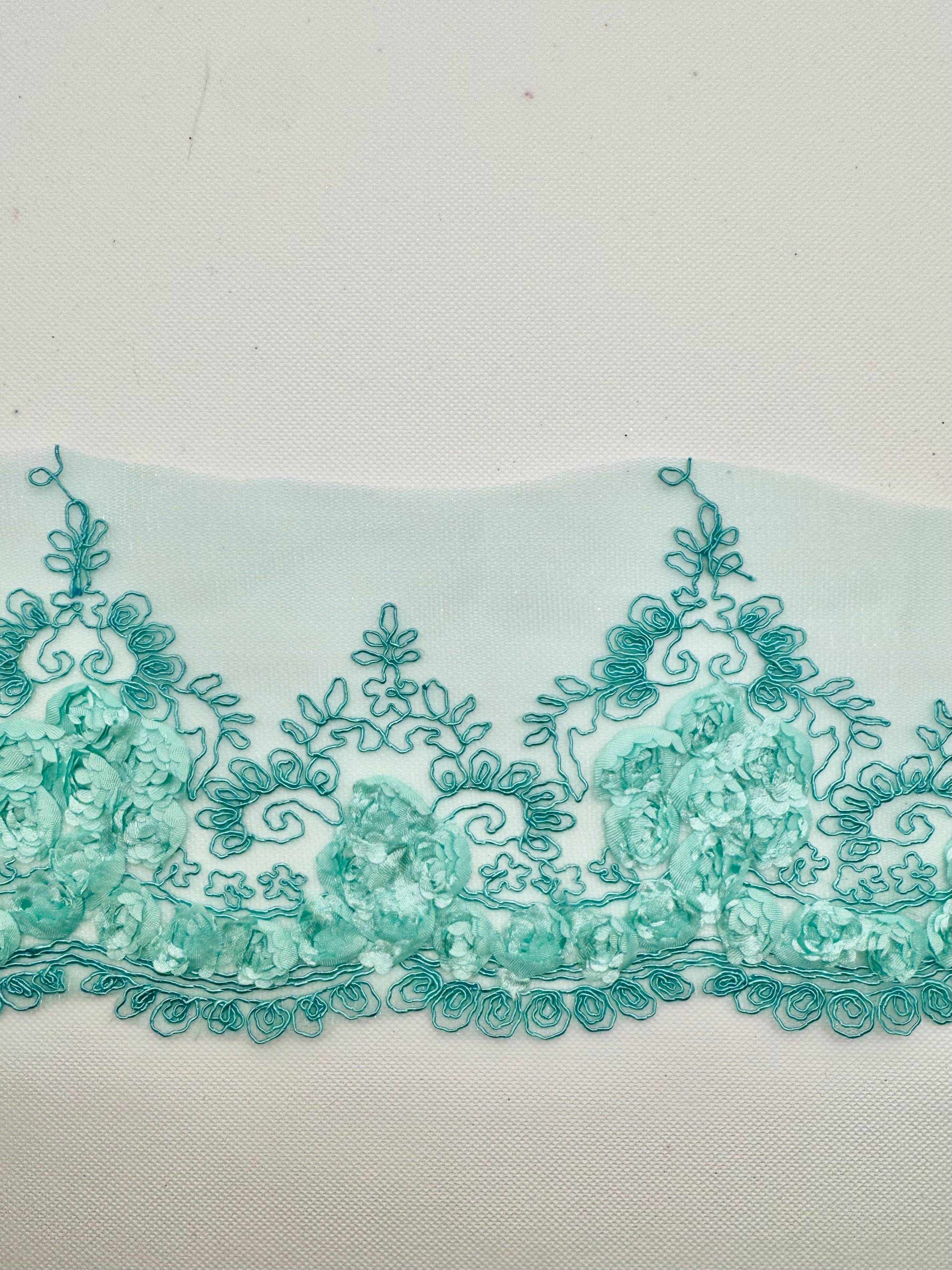 Priced per one-yard piece. Beautiful mint lace with 3D flowers border trim. Very lightweight.