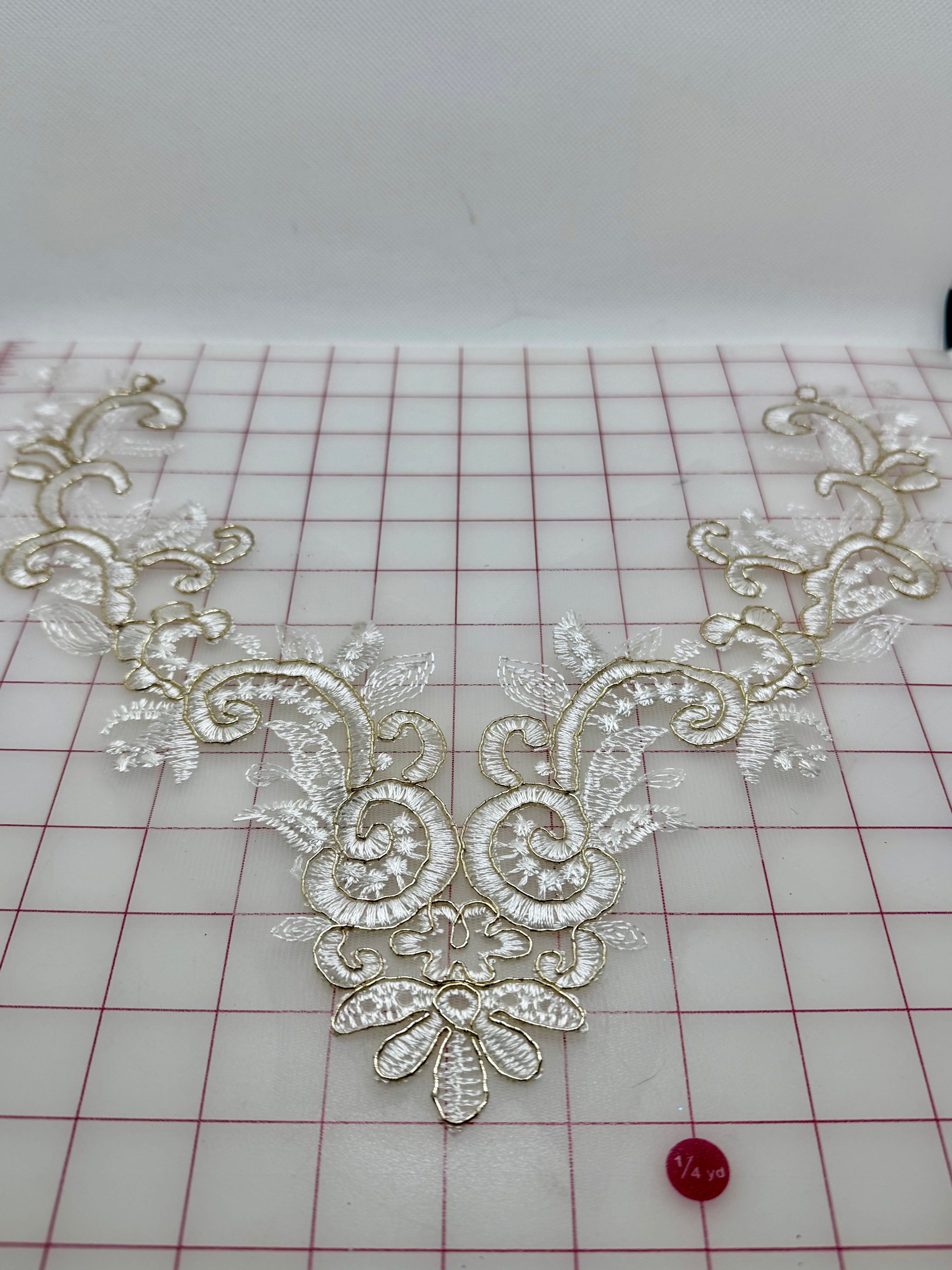 Priced per piece. This stunning, V-shaped, ivory, gold-corded applique is a lightweight applique, perfect for embellishing. classical tutu plates and the center front of ballet bodices.