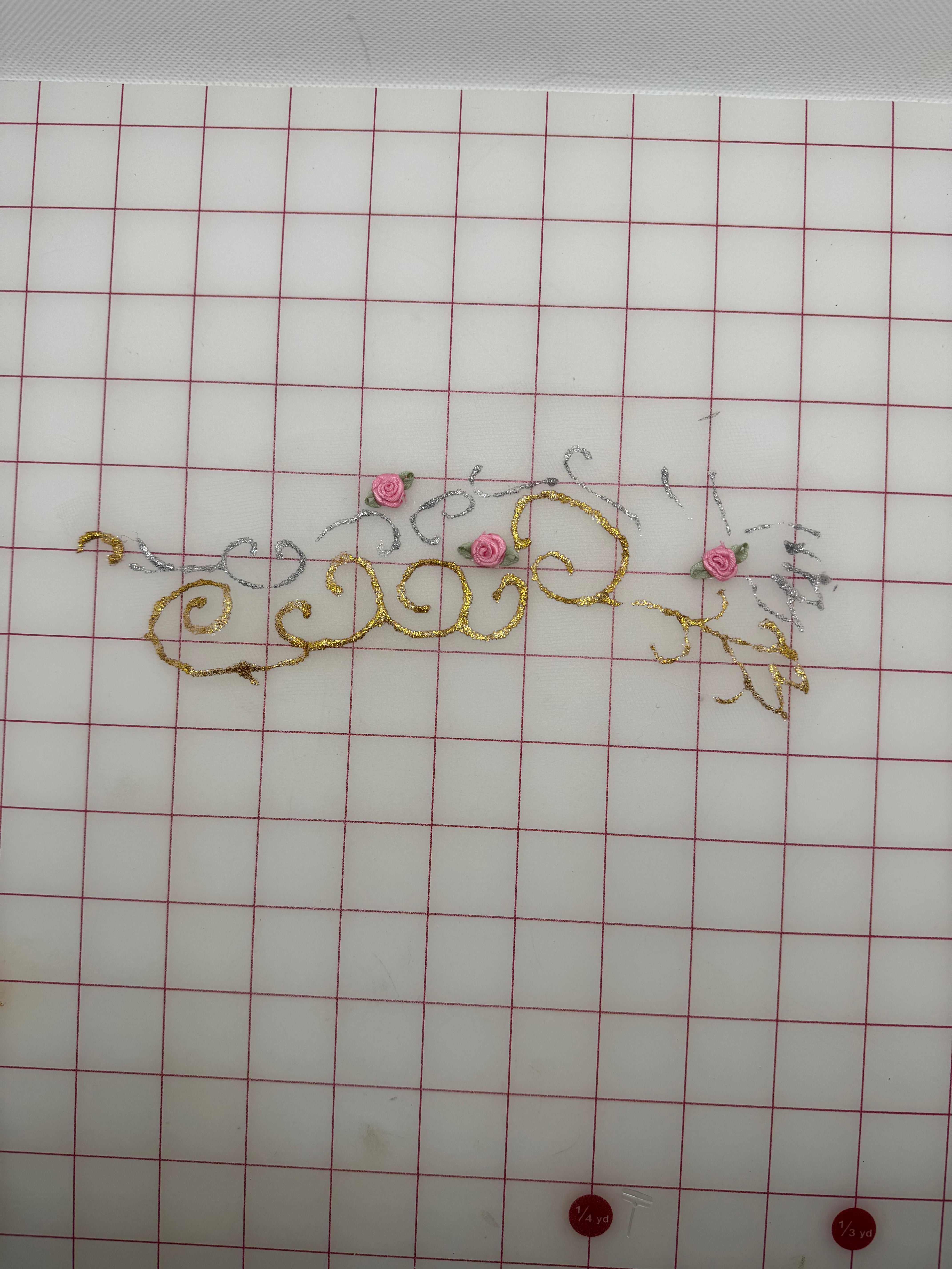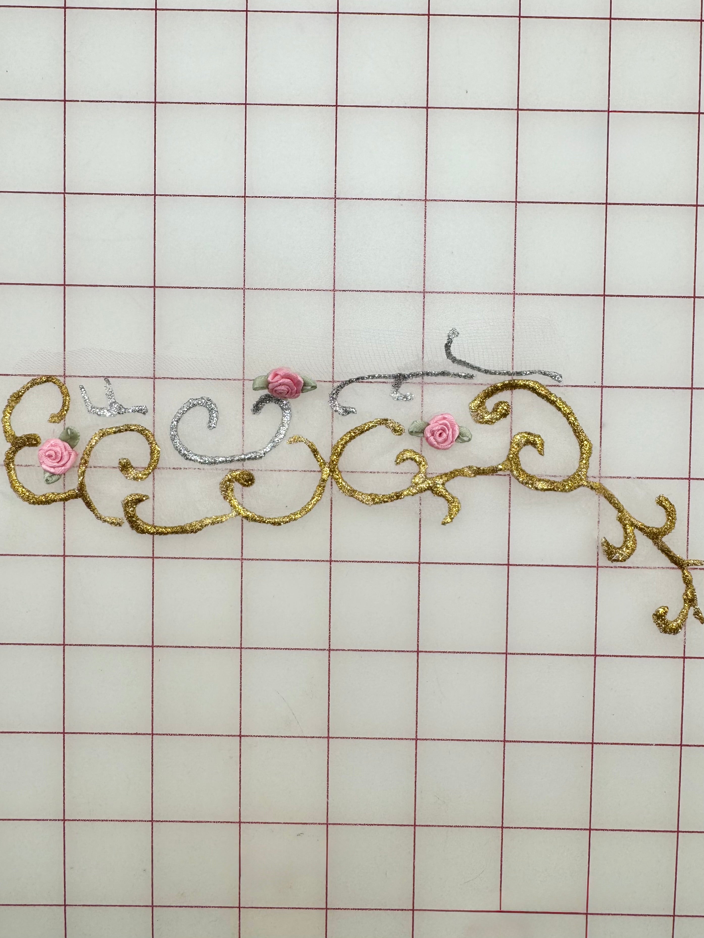 Priced per piece. Stunning motifs of pink, gold, and silver hand-painted appliques.