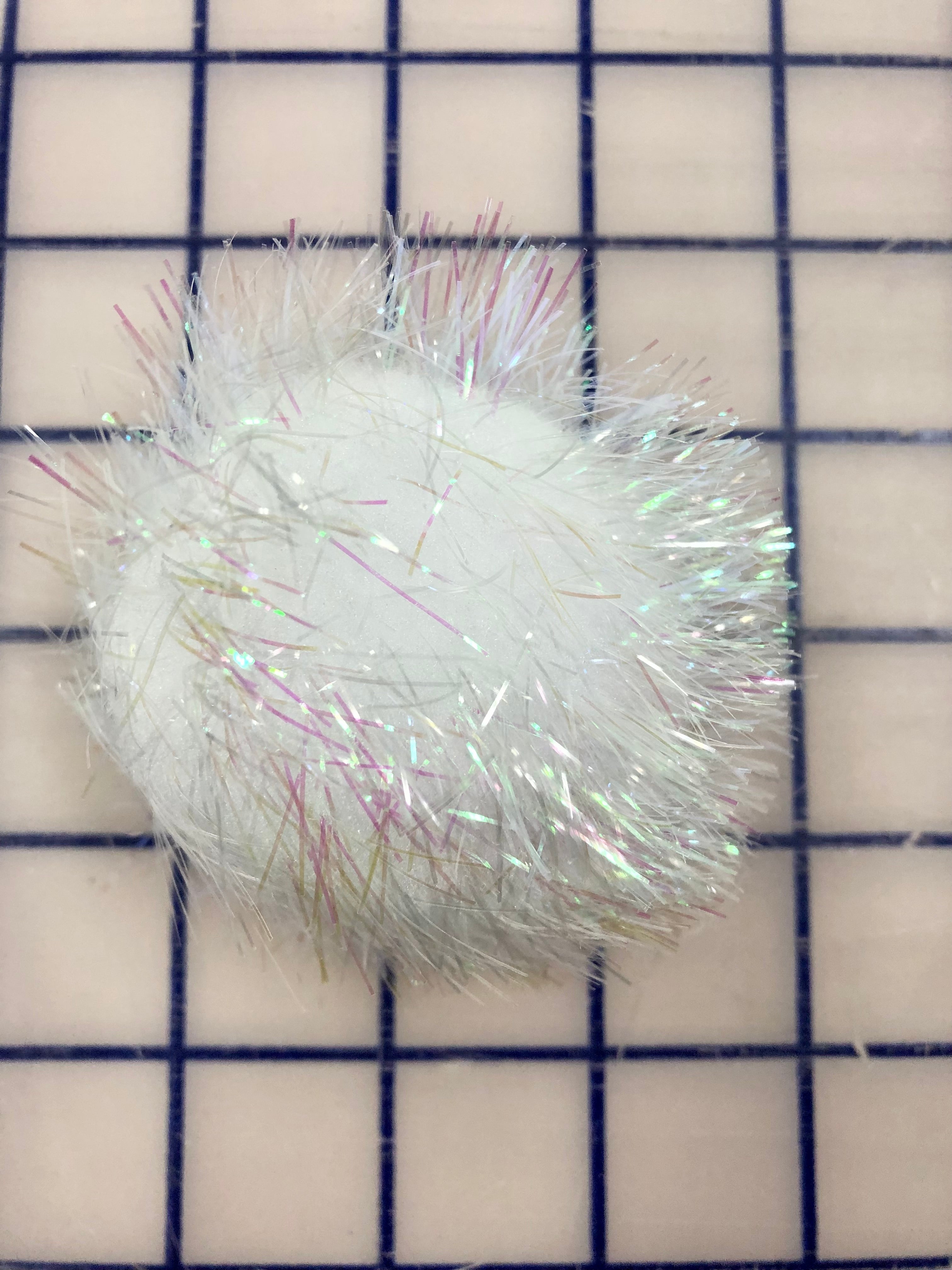 Priced per piece. 3-inch white (including edge of iridescent tinsel) pom poms. Perfect to use as "snowballs" when making props, headpieces, and seasonal decorations.