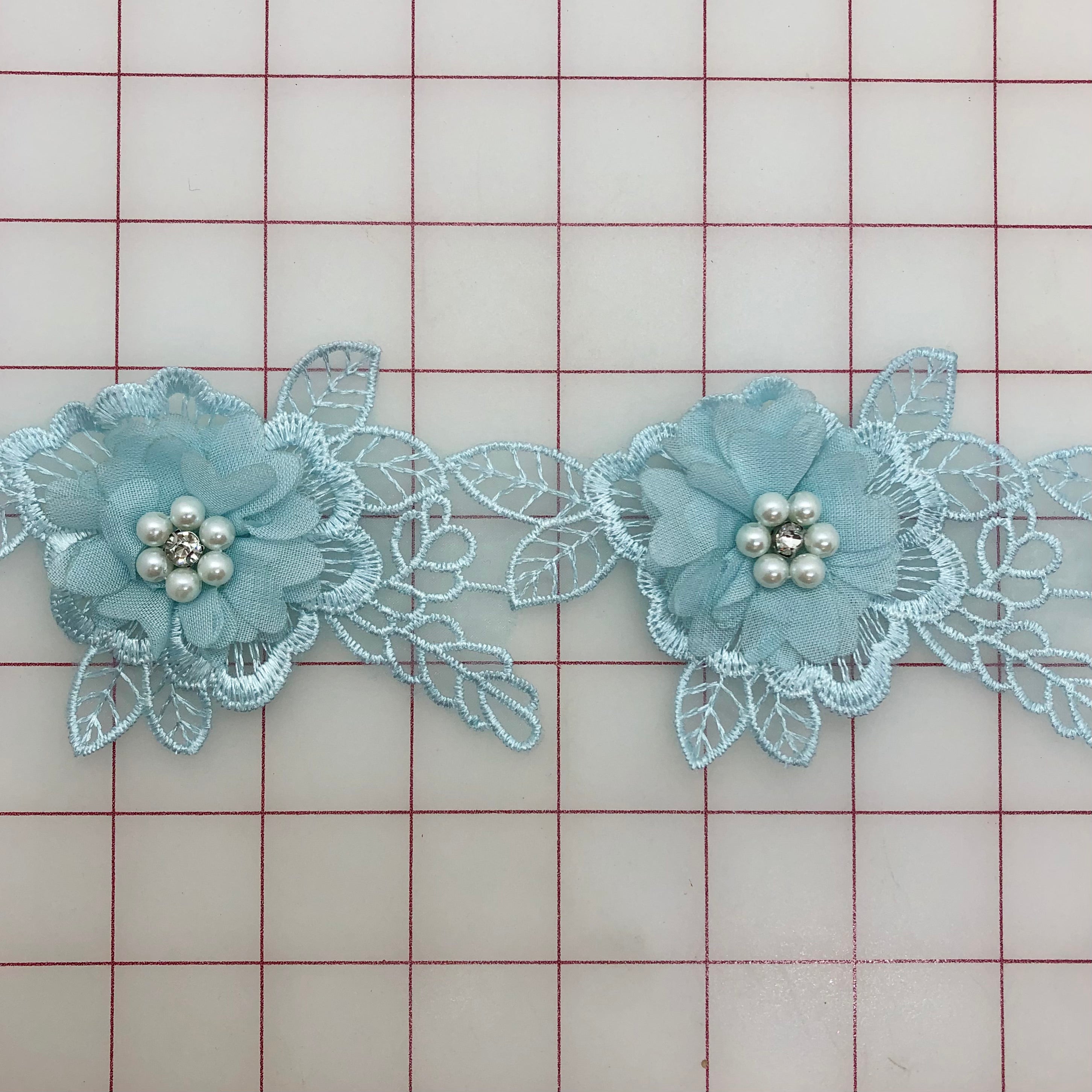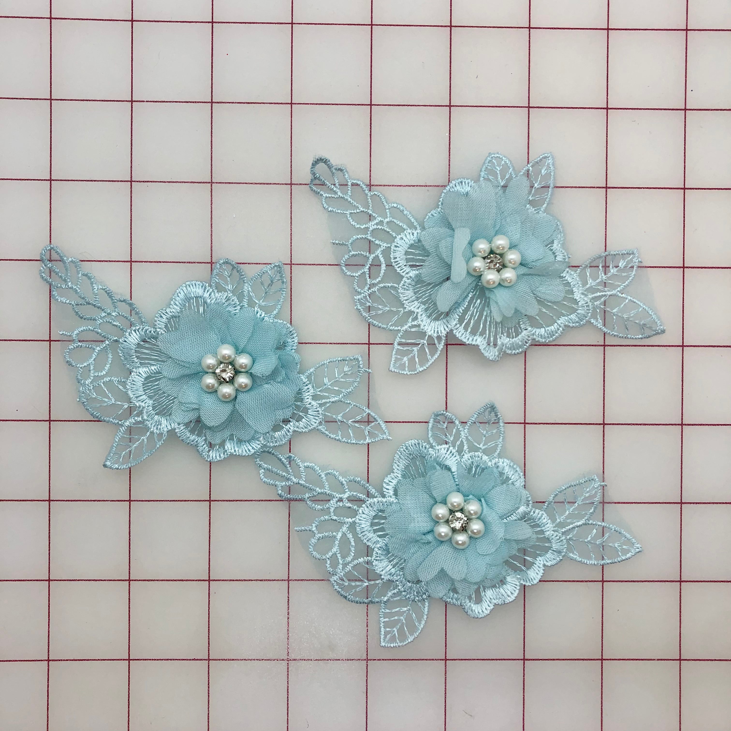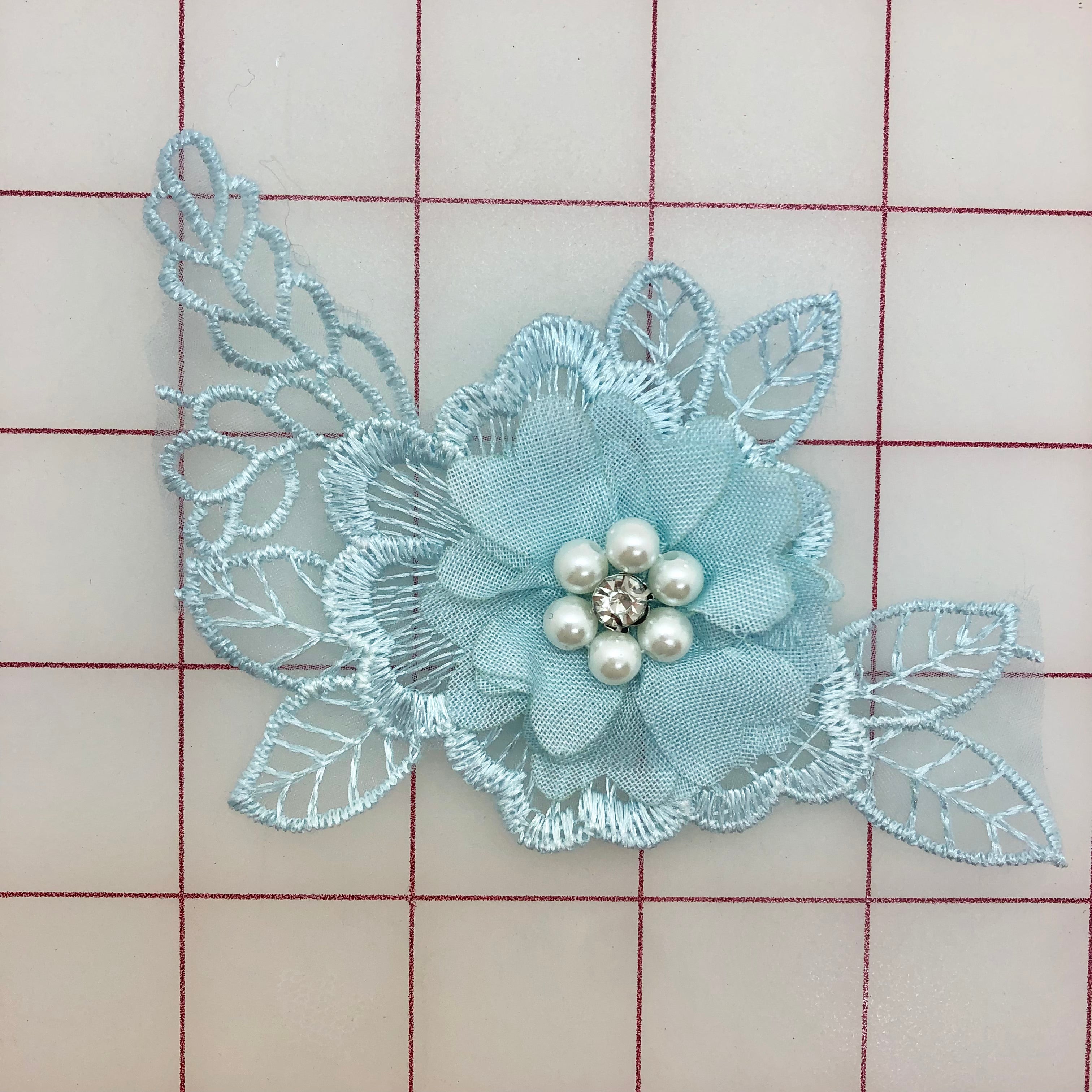 Priced per piece. Beautiful light blue 3D applique flower motifs. 4-inches long and 2.75-inches wide at widest point. Embellished with a beautiful-quality crystal rhinestone and six pearls in the center of the 3D flower.
