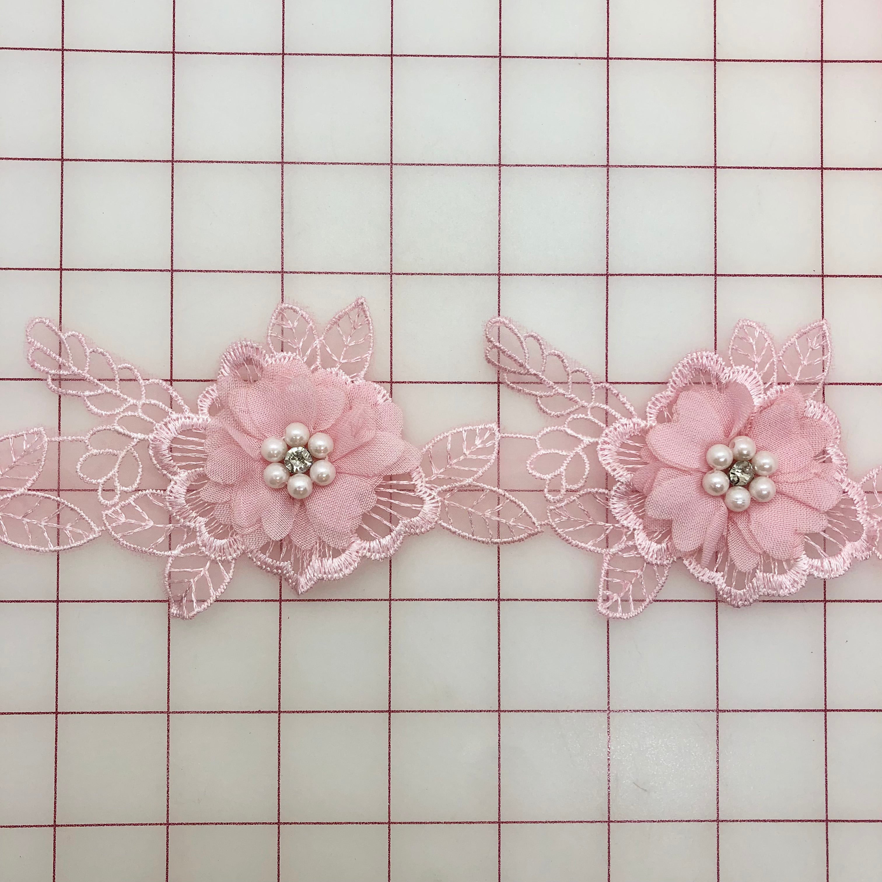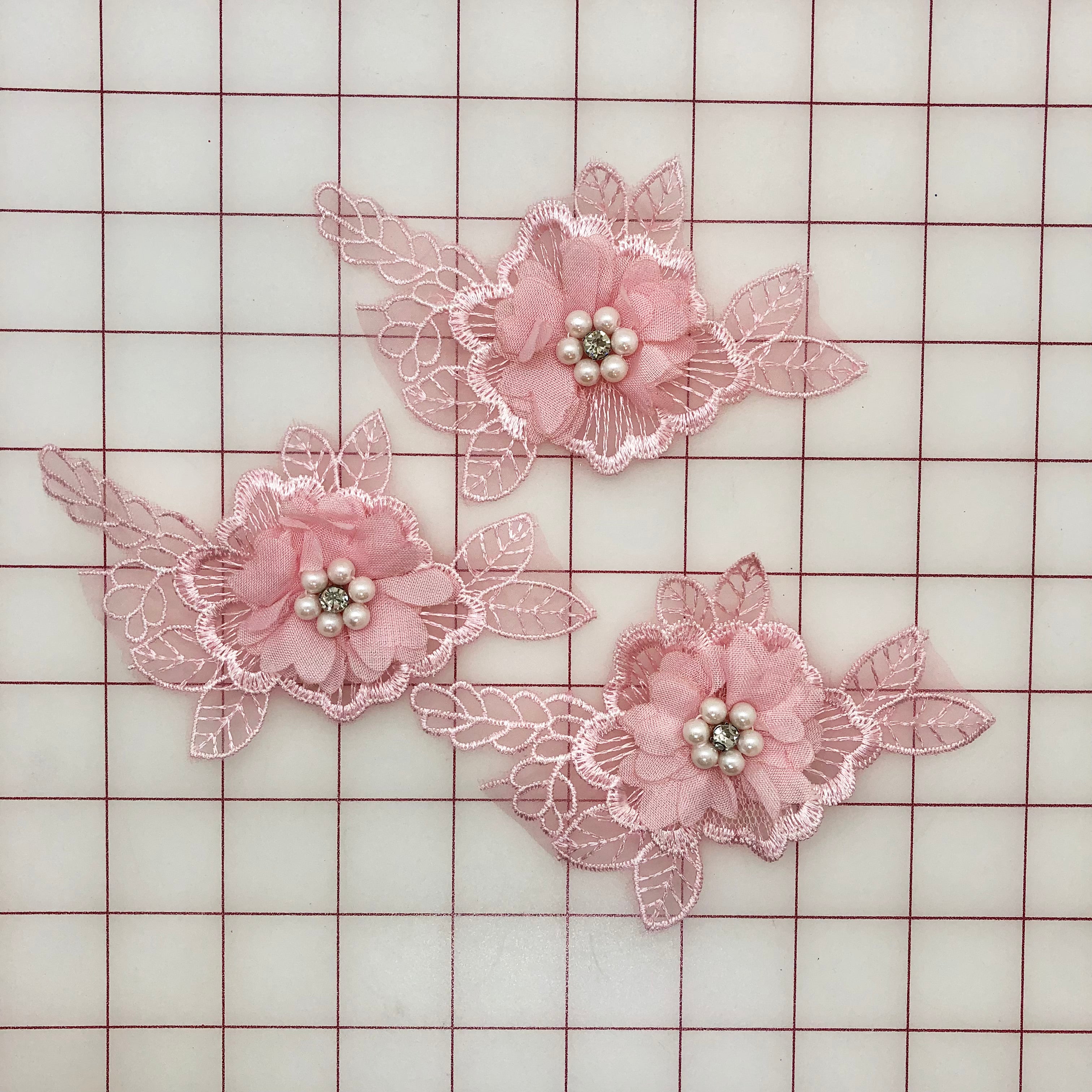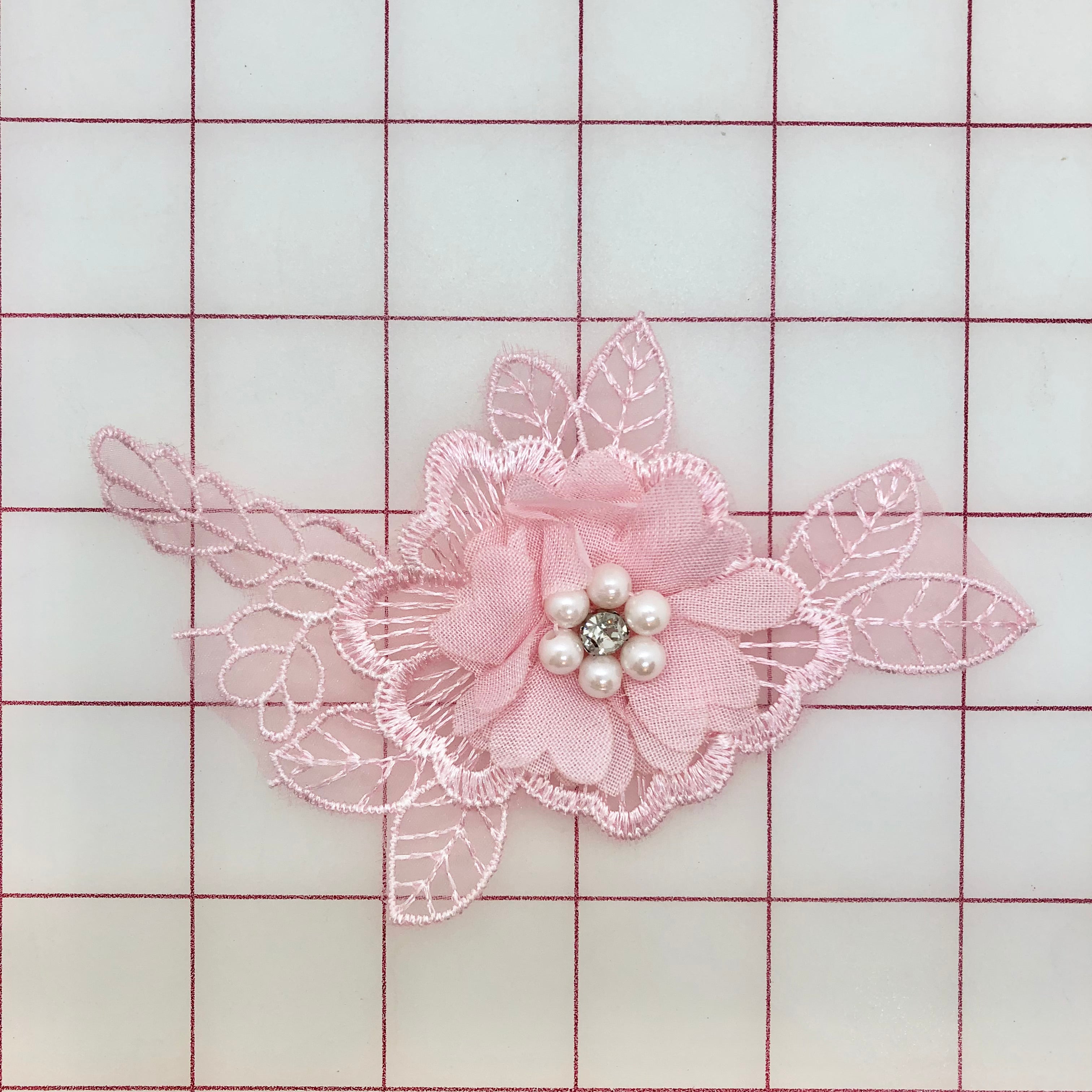 Priced per piece. Beautiful light pink 3D applique flower motifs. 4-inches long and 2.75-inches wide at widest point. Embellished with a beautiful-quality crystal rhinestone and six pearls in the center of the 3D flower.