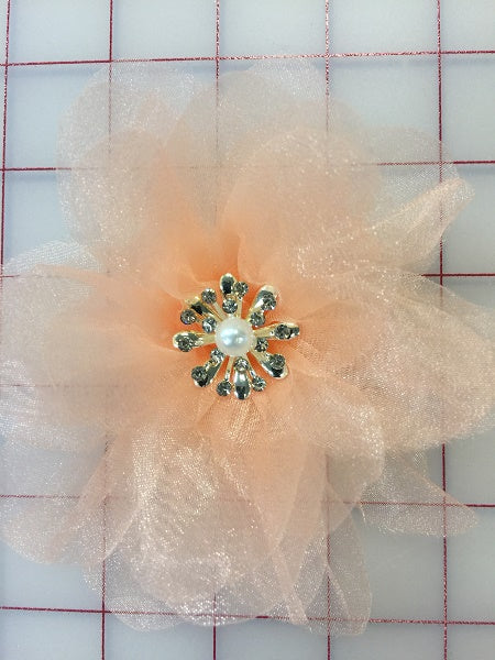 Priced per piece. Peach organza flowers with crystal center. Two-inches wide.