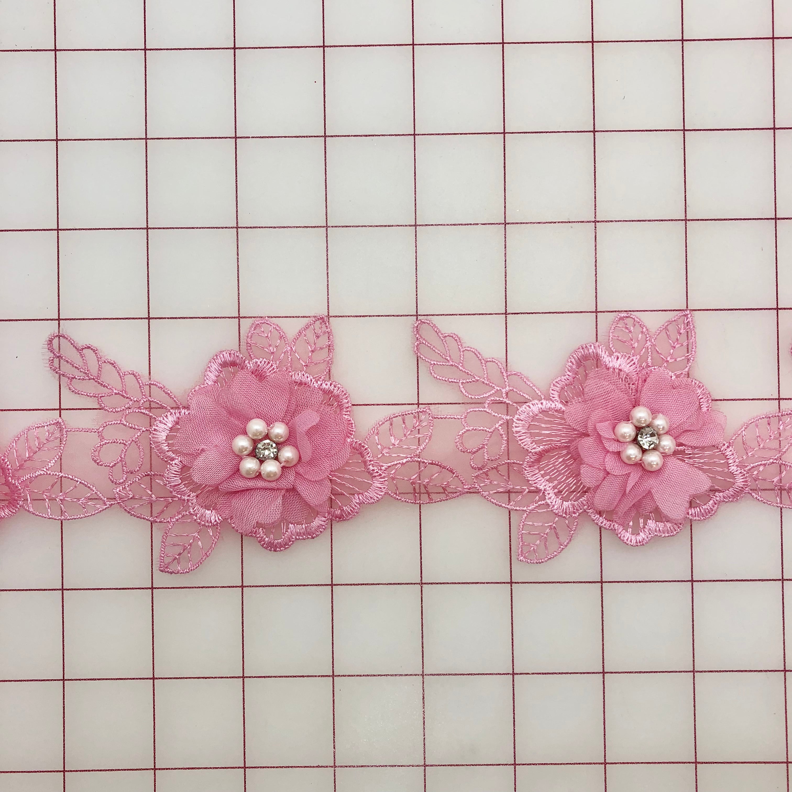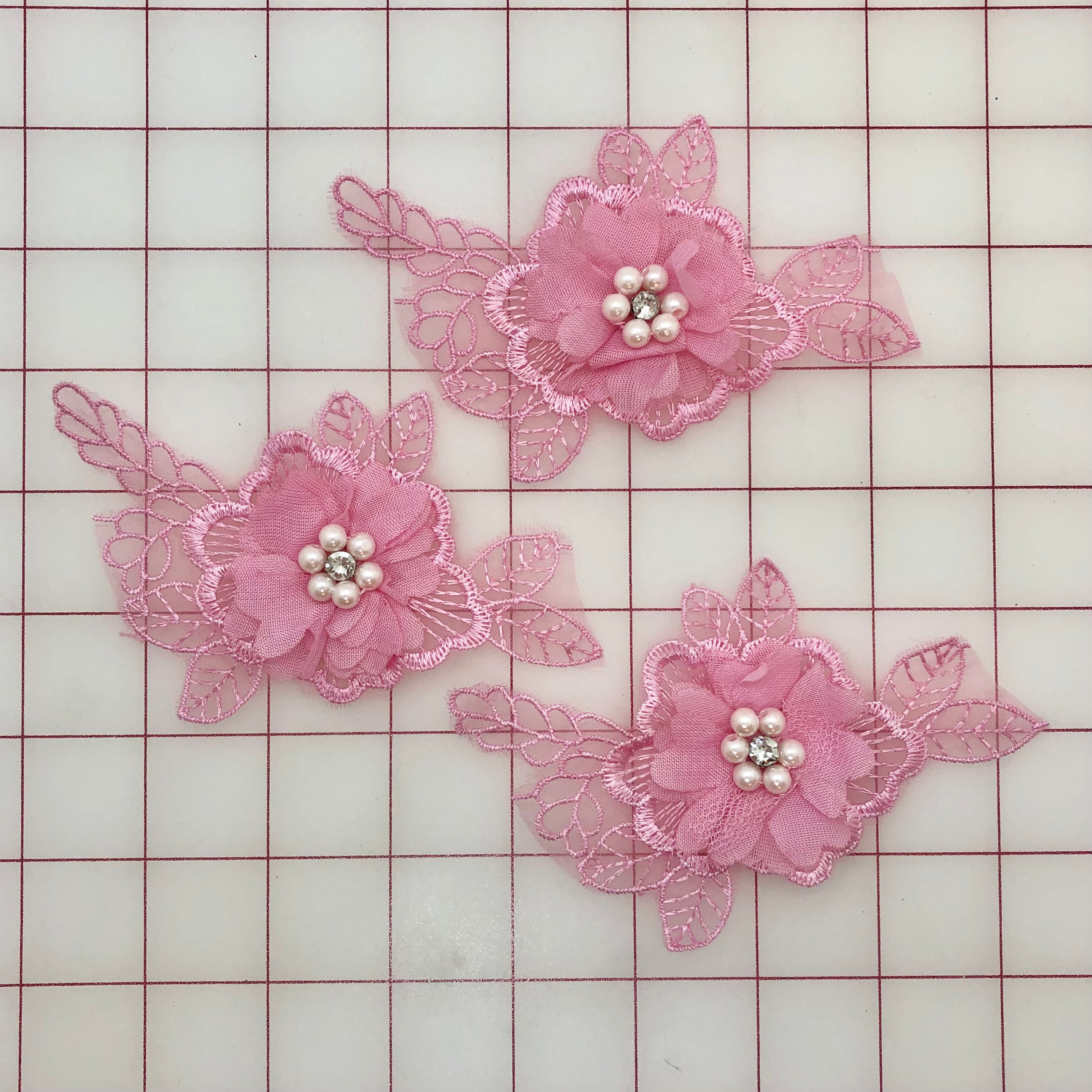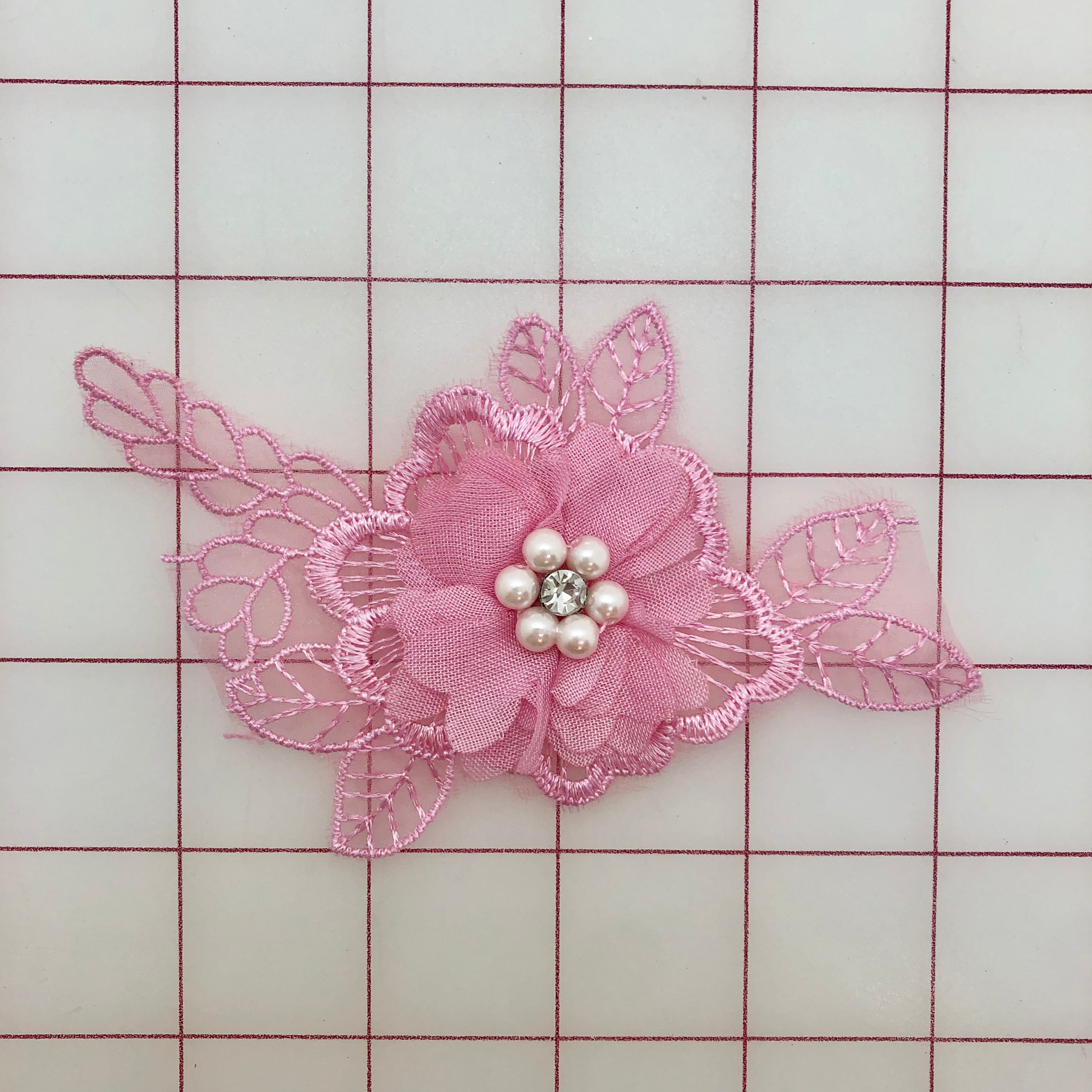Priced per piece. Beautiful rose pink 3D applique flower motifs. 4-inches long and 2.75-inches wide at widest point. Embellished with a beautiful-quality crystal rhinestone and six pearls in the center of the 3D flower.