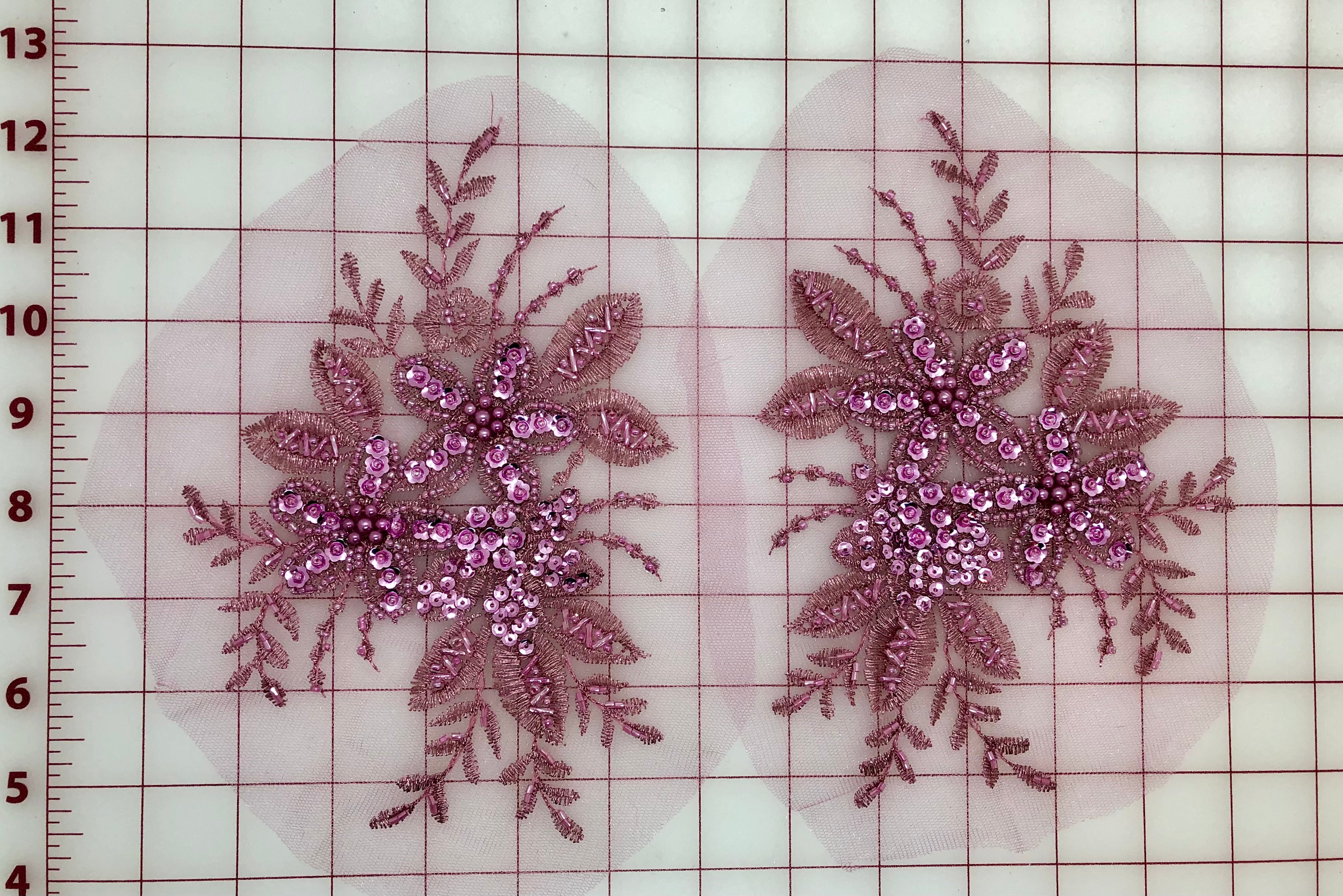 Priced per pair. Beautiful sequined and beaded lace flower pairs. Dusty Rose. Lightweight. Perfect for tutu embellishment. For size: one square equals one inch. Approximately 8x5 inches each.