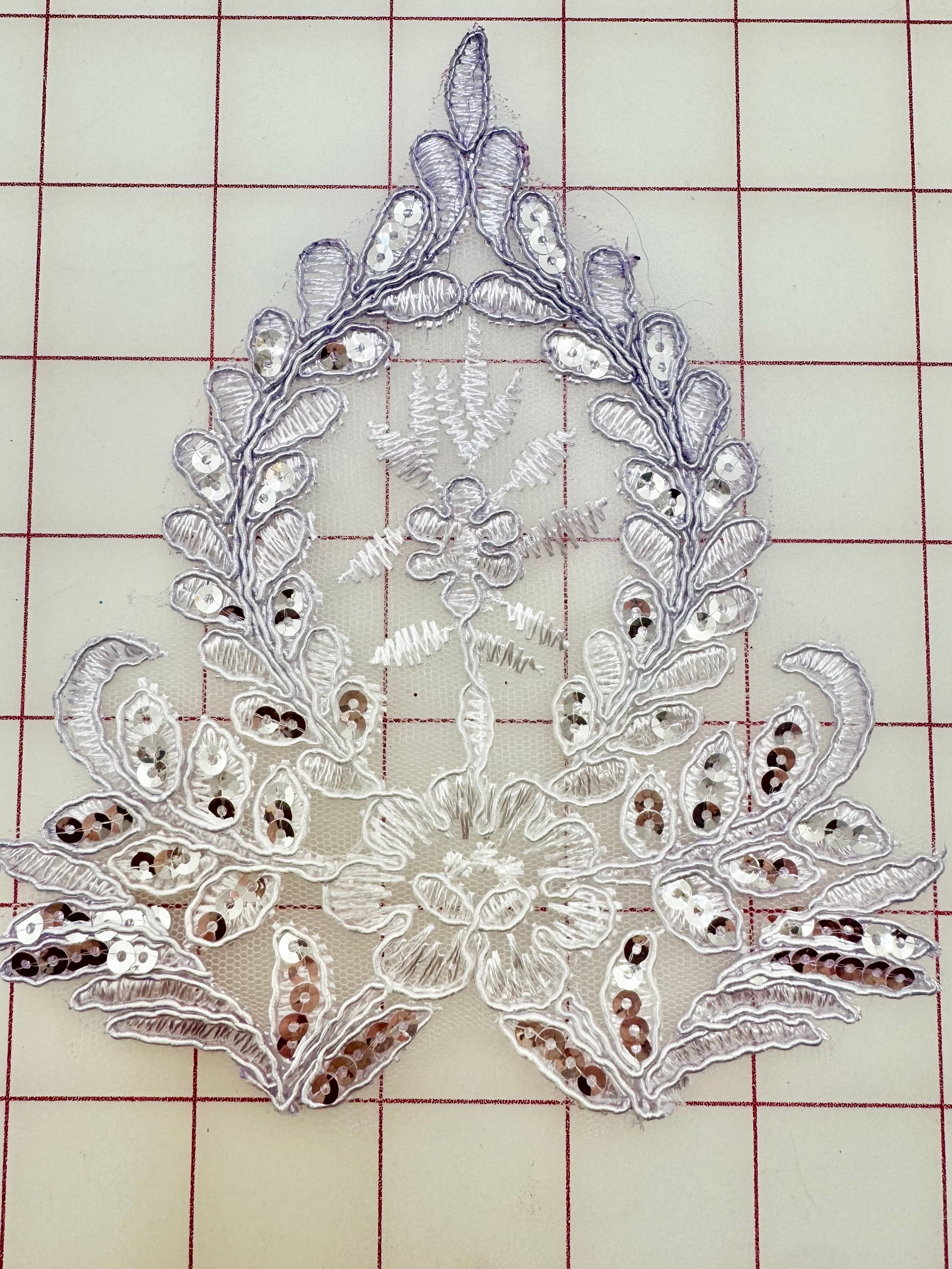 Priced per motif. White sequined, corded lace applique that has been tip-dyed lavender.
