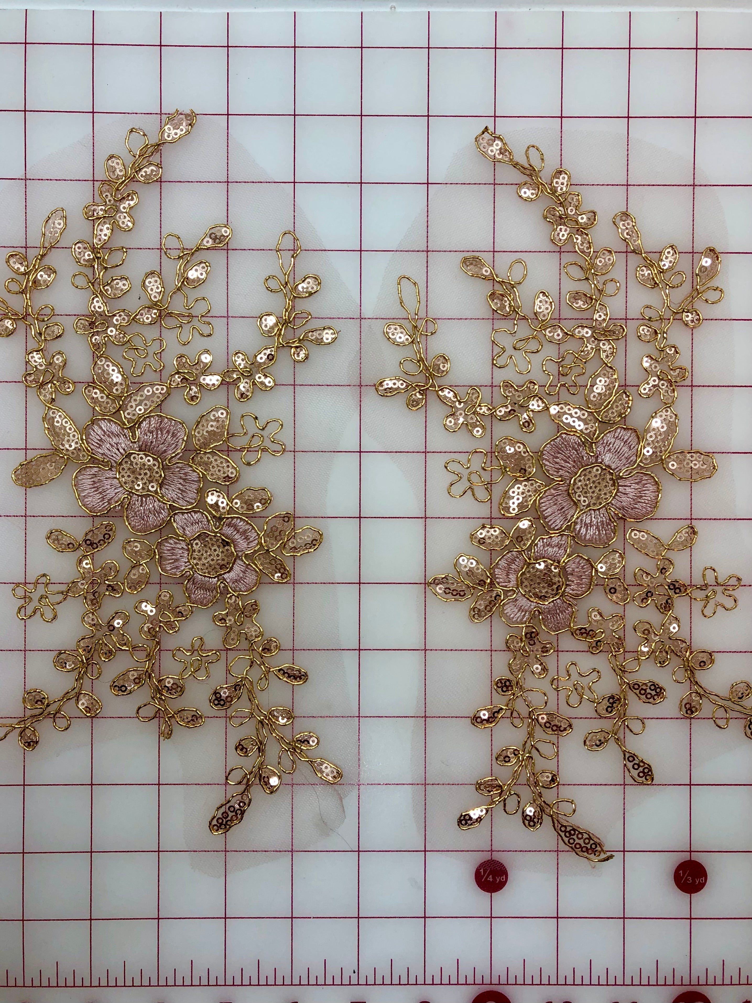 Priced per pair. Beautiful rose gold sequined lace motif pairs. Lightweight. Perfect tutu embellishment for Aurora, Sugar Plum Fairy, etc.. For size: one square equals one inch. Approximate size: 11 x 5 inches.