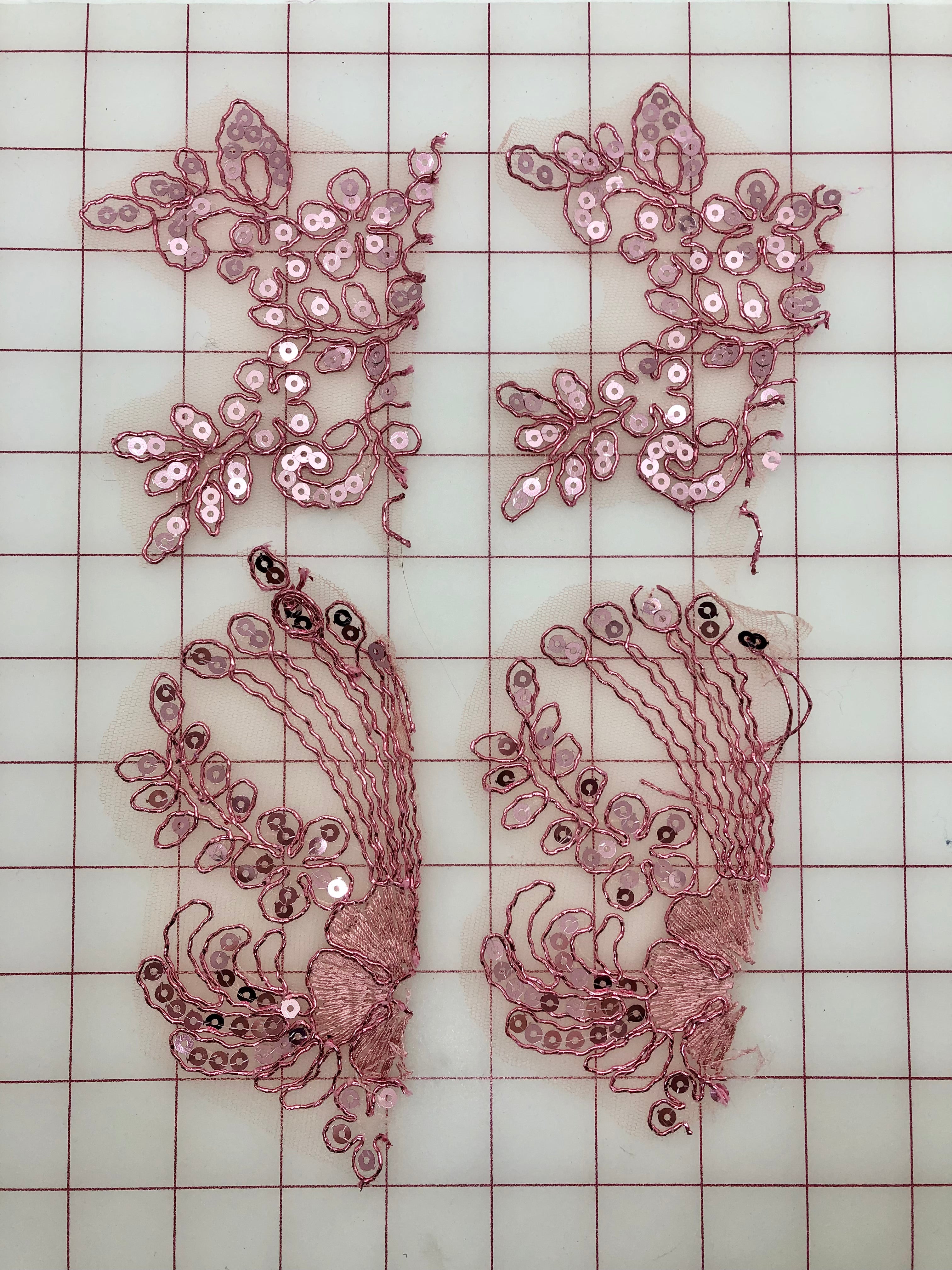 Priced per 4-piece pack. Sequined lace motifs. Dusty Rose. Can be easily cut into smaller motifs.