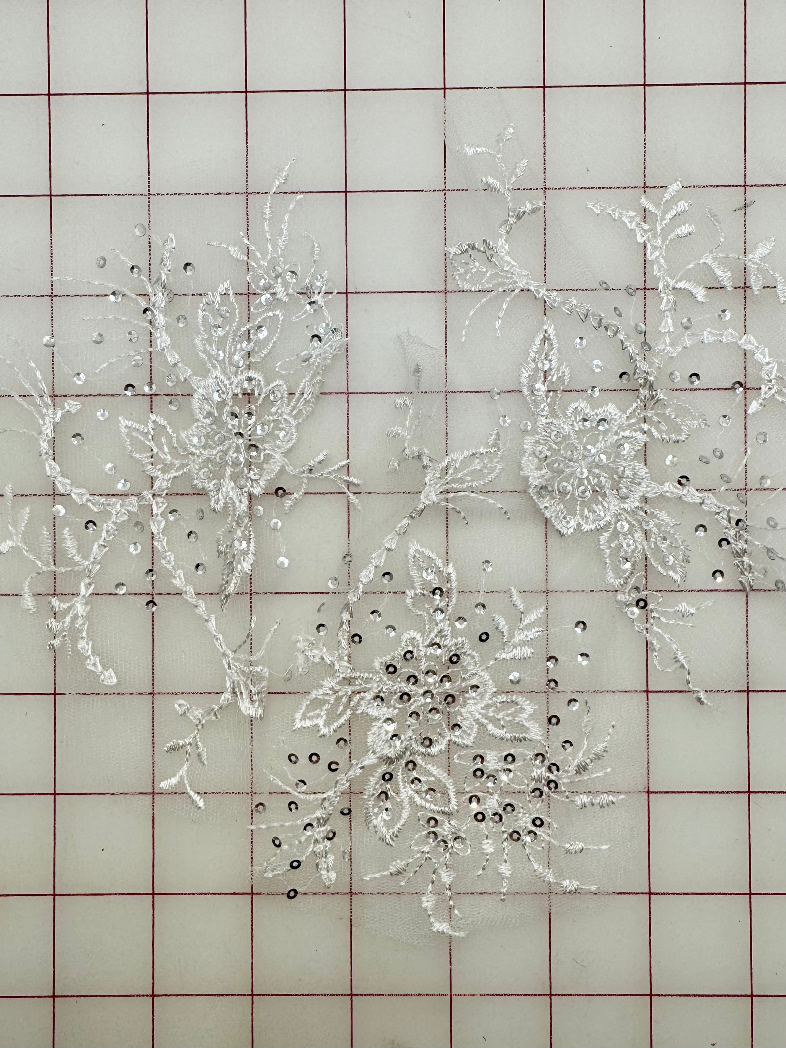 Priced per grab bag. 3 Delicate, silver-sequined white motifs. Lightweight. Perfect for a Snow Queen tutu embellishment, Sleeping Beauty Wedding tutu, and many other costumes.