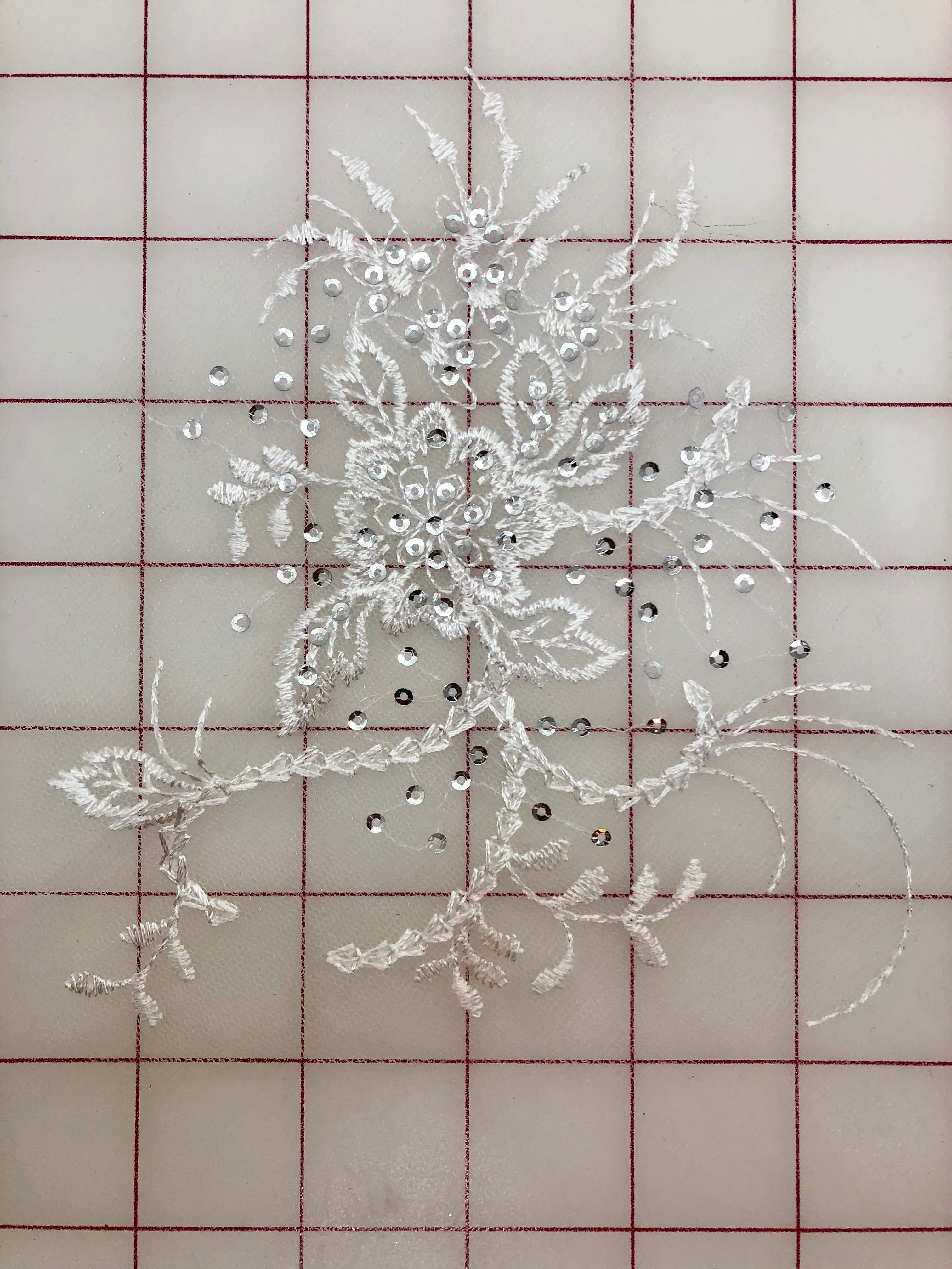 Priced per motif. Delicate, silver-sequined white motifs. Lightweight. Perfect for a Snow Queen tutu embellishment, Sleeping Beauty Wedding tutu, and many other costumes.