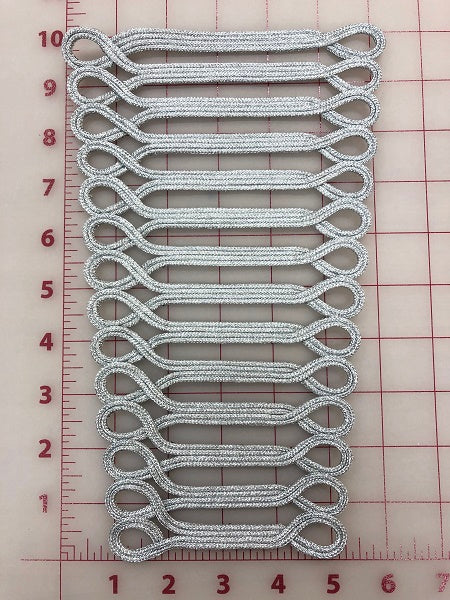 Priced per piece. Silver "Soldier Braid" appliques. Perfect for Nutcracker soldier jackets, and many other uses. For size: One square equals one inch.