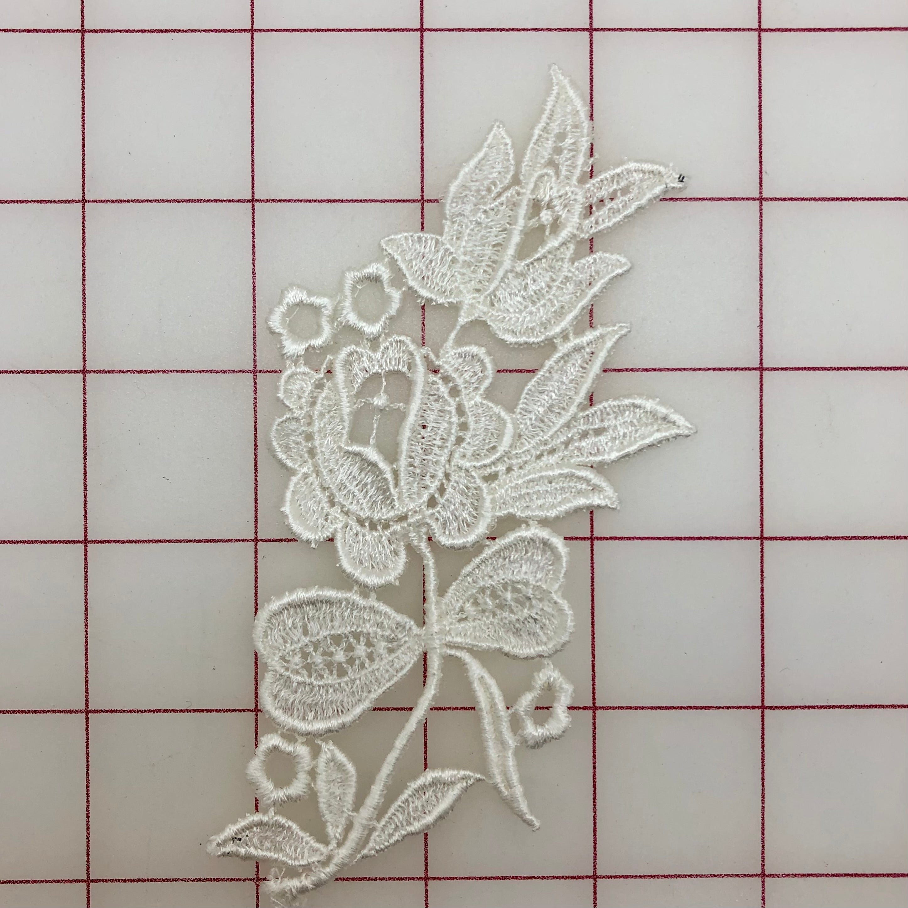 Priced per piece. White embroidered vintage flower design applique. Dyeable. See picture for size. One square equals one inch. Close-out. cannot be re-ordered.