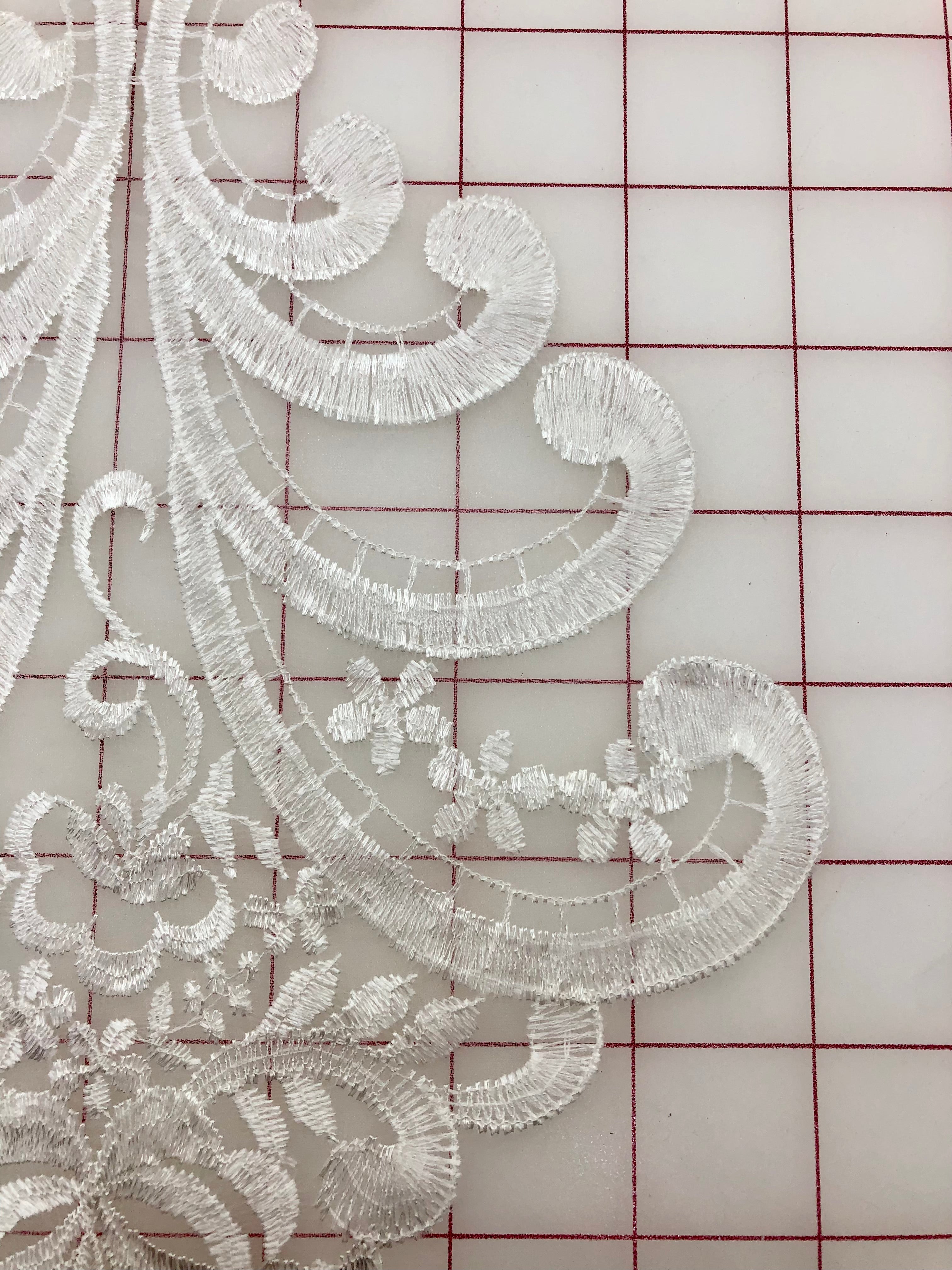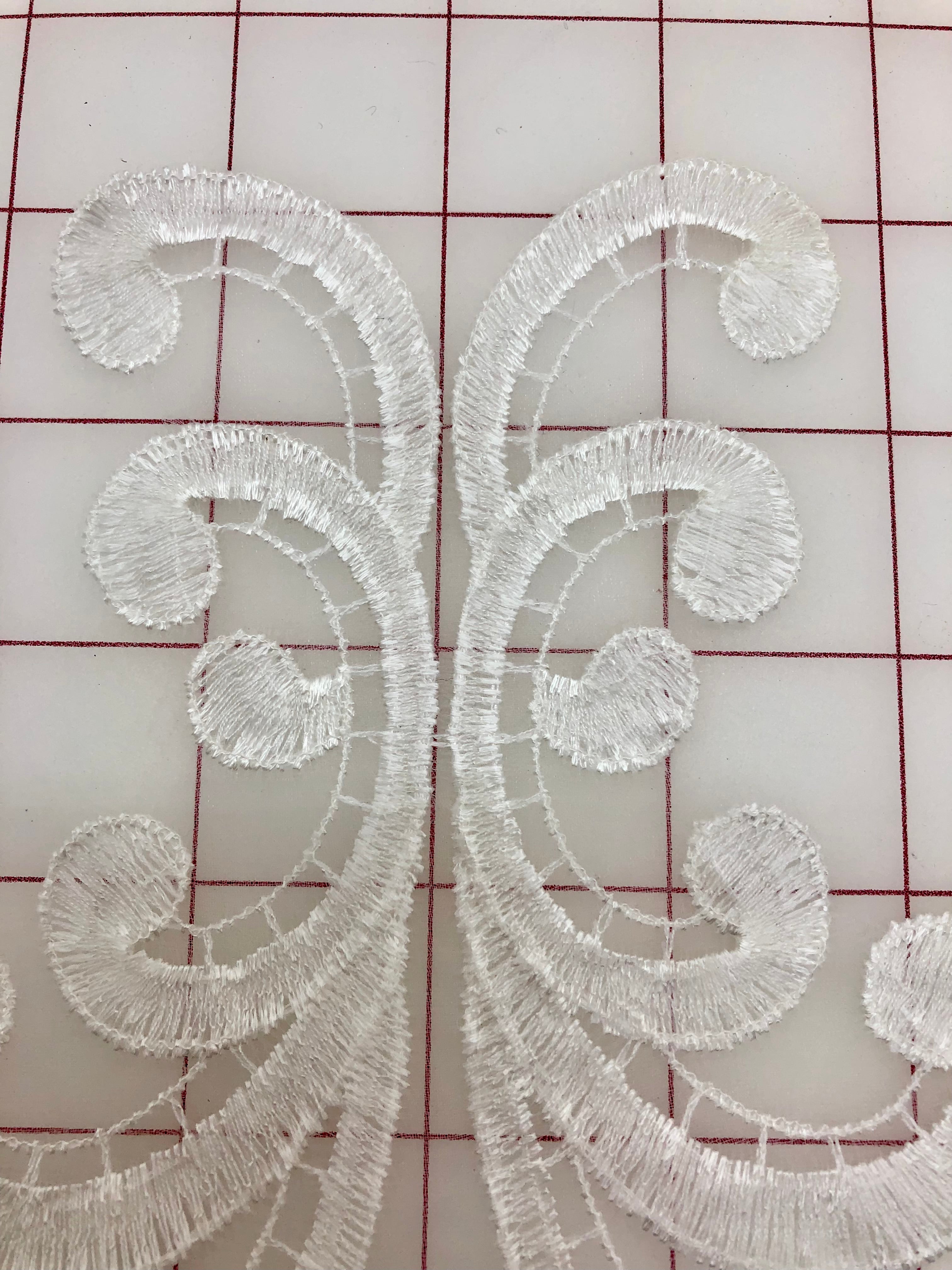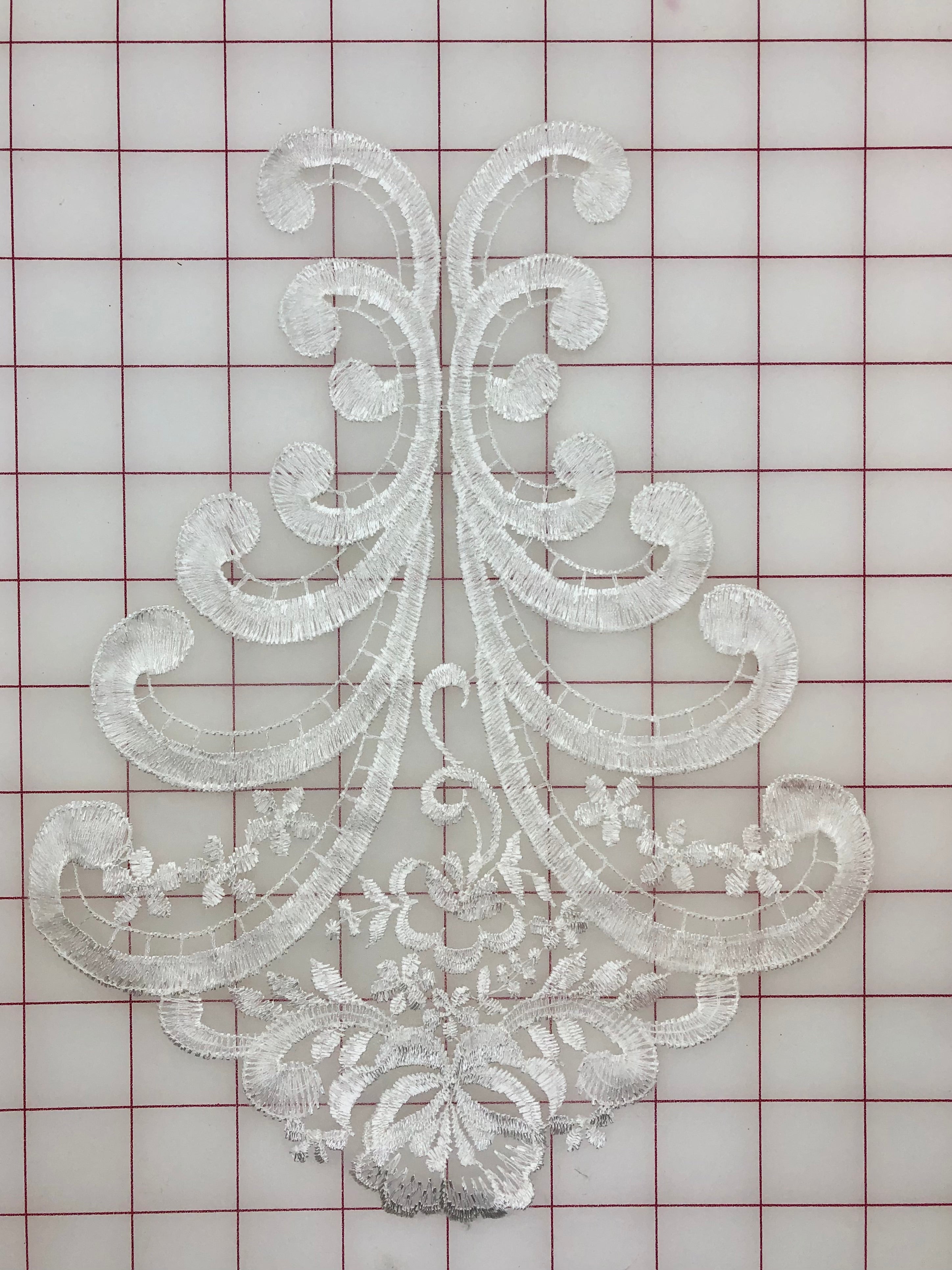 Priced per piece. White applique embroidered on organza. 10-inches long, 2 inches wide at narrowest point; 8 inches wide at widest point. Very easy to dye with regular Rit Dye. For size: One square equals one inch. Applique can be cut apart into several different motifs.