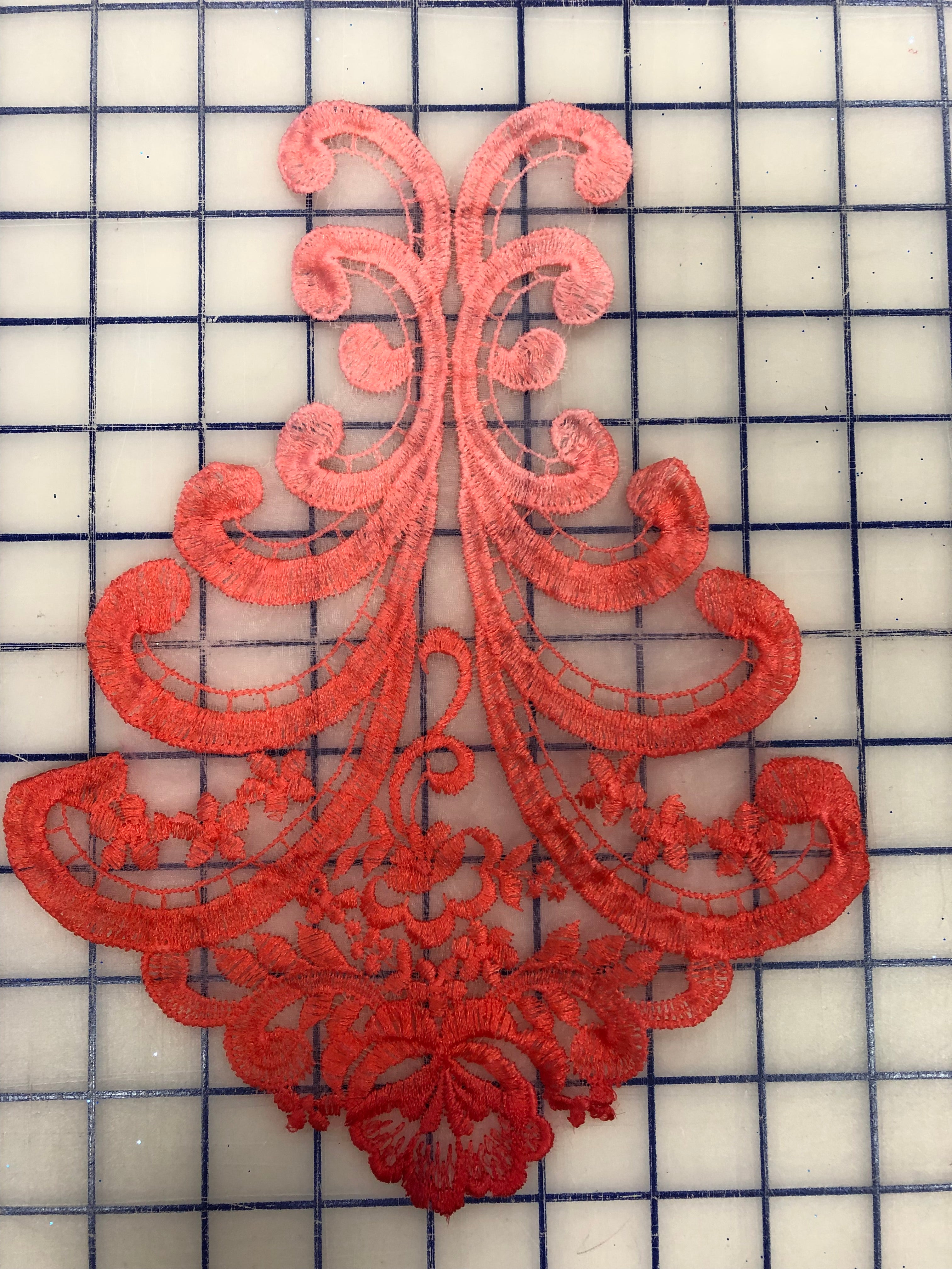 First Picture is whole applique on a grid for size. 2nd, 3rd, and 4th pictures are close-ups of the motif. 5th and 6th pictures are the same applique ombre-dyed with Rit Dye.
