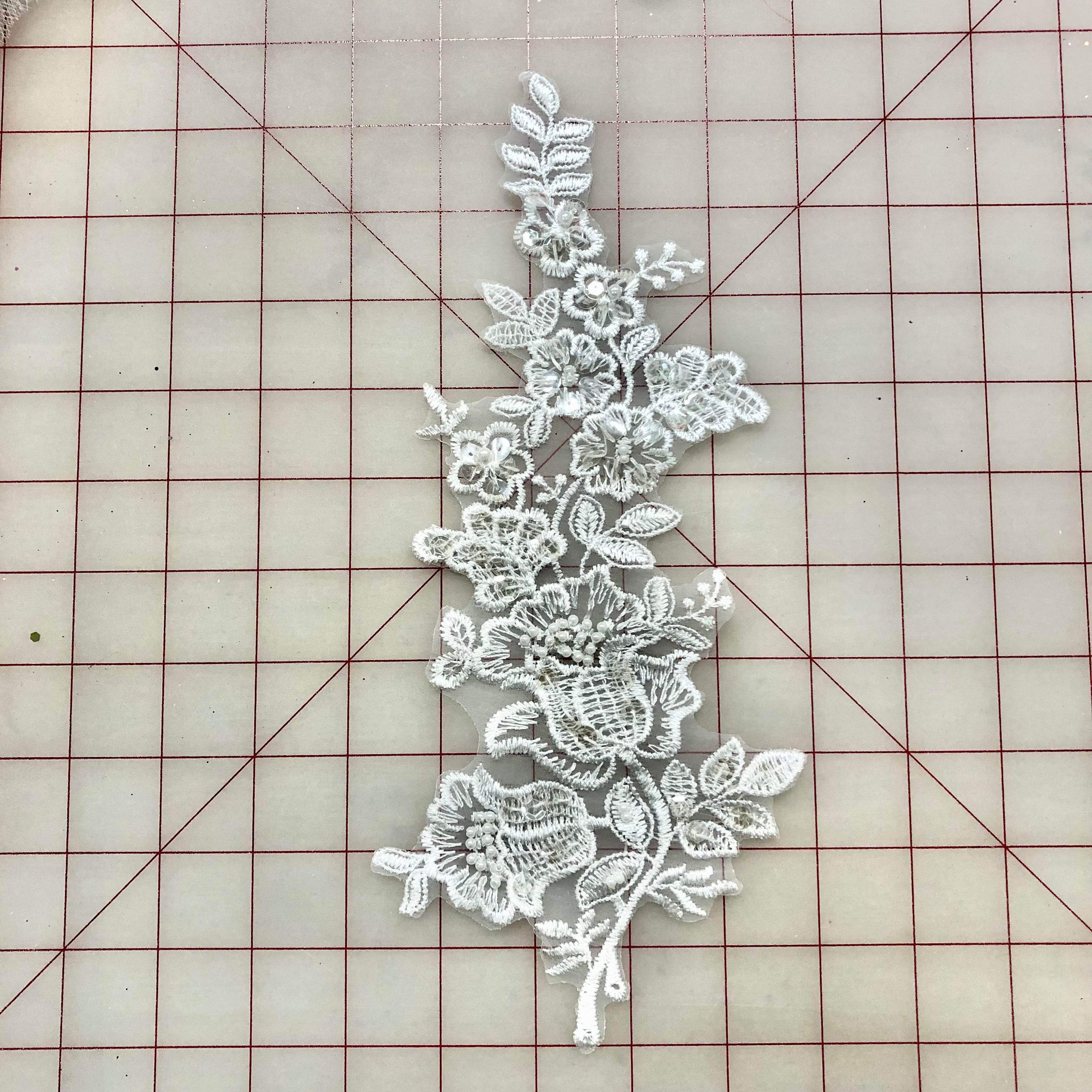 Priced per piece. White lace beaded and sequined applique. Easy to dye. 20% discount per dozen.For size: one square equals one inch.