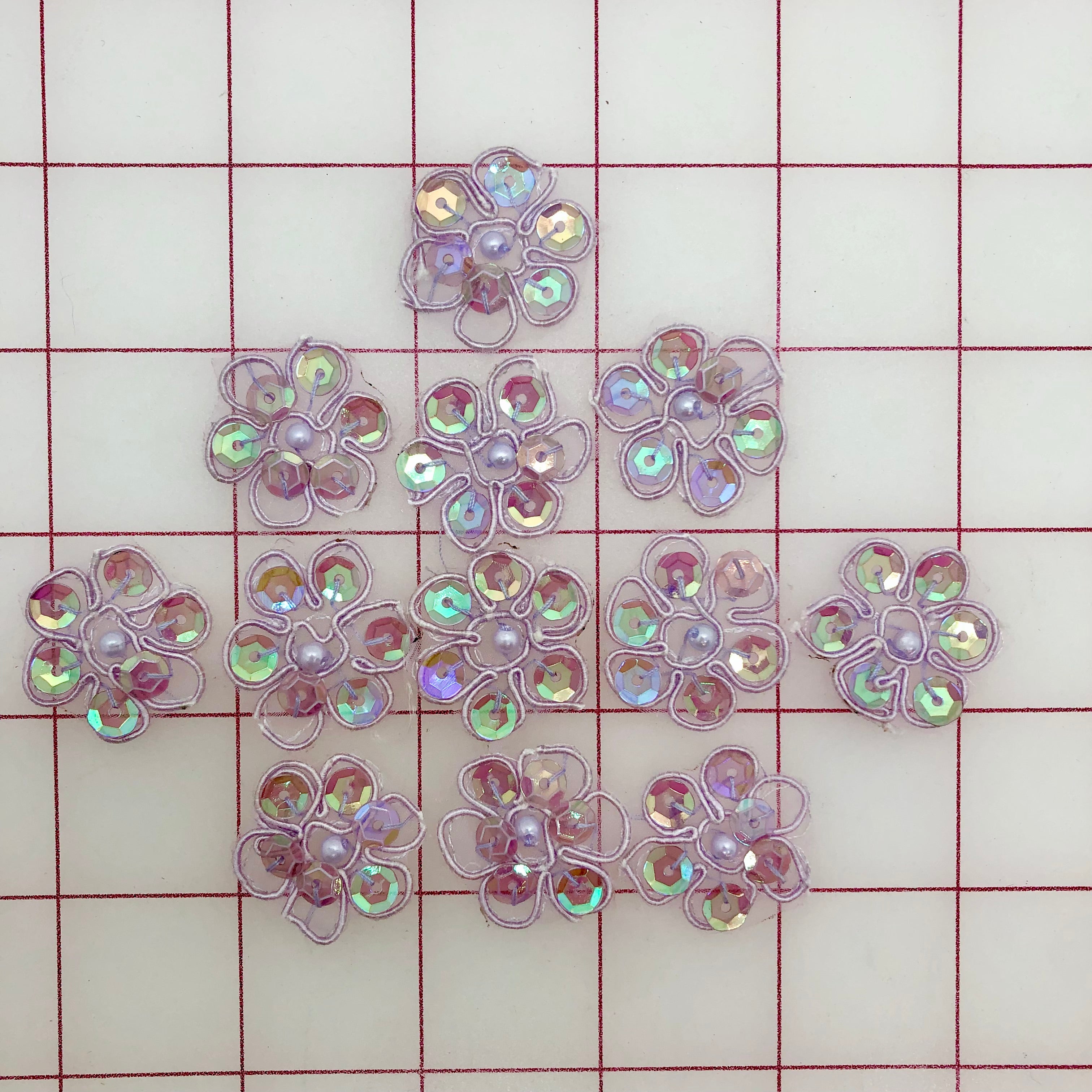 Priced per 12-pack (one dozen). Beautiful sequined flower trim. Lightweight. Lavender, 1-inch wide.