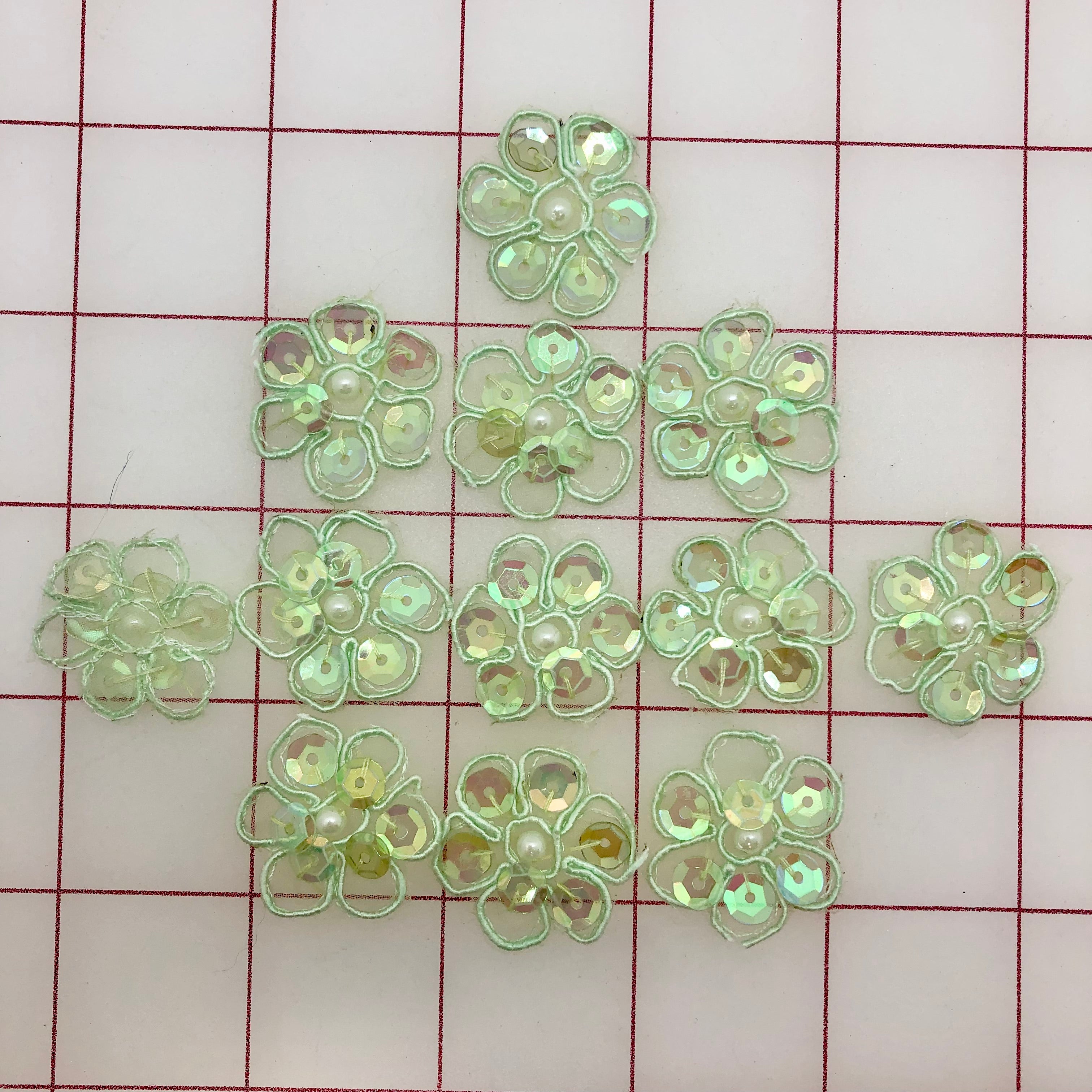 Priced per 12-pack (one dozen). Beautiful sequined flowers. Lightweight, perfect for embellishing many costumes. Mint Green, 1-inch wide.