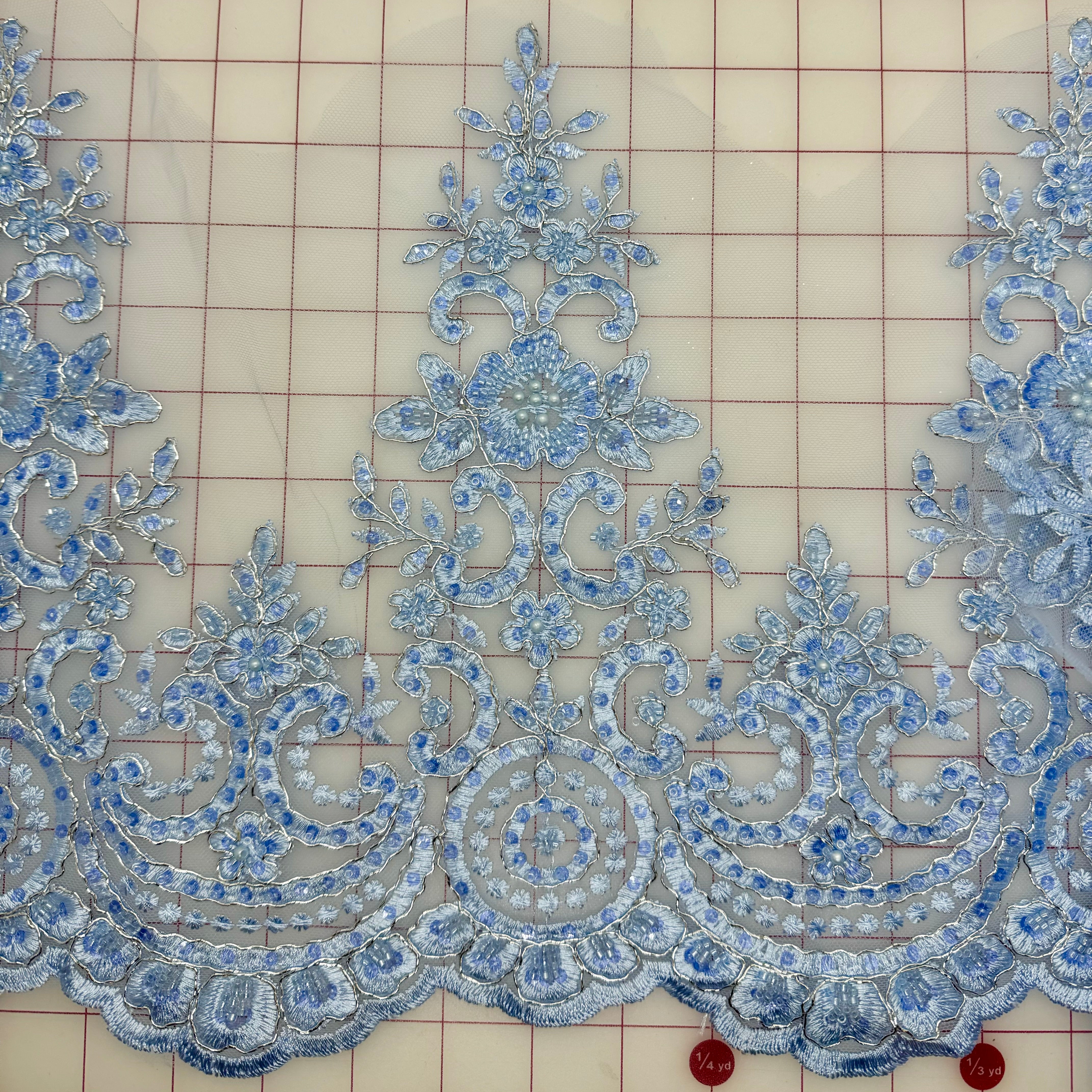 Priced per 3/4-yard pieces. Light blue, silver-corded, beaded, embroidered lace border.