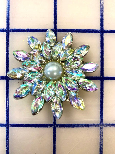 Priced per piece. Beautiful, Aurora Borealis rhinestone and pearl pin. Perfect for embellishing costumes and headpieces.