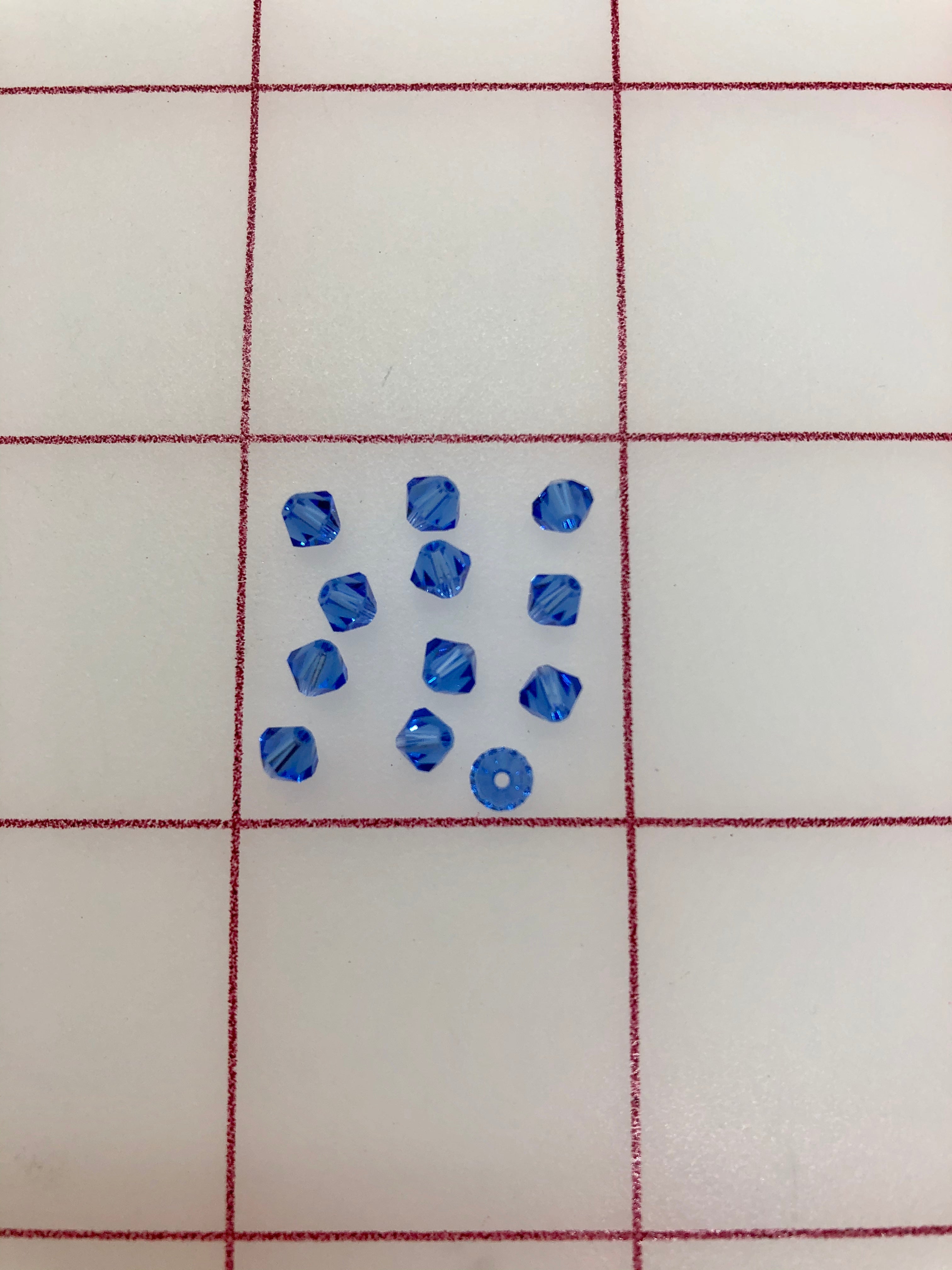 Priced per dozen.  Discount for one gross (144 pieces).  4mm Swarovski 5301/5328 bicone beads are beautiful, high-faceted beads.  They are machine-cut and have a hole drilled through the center, in which they can be sewn or wired together. These beads are perfect for tiara-making, jewelry and much more.  If using beads in tiaras to be worn on stage, Swarovski is really the only choice.  They are sparkly, elegant crystal beads and will be easily seen from the audience