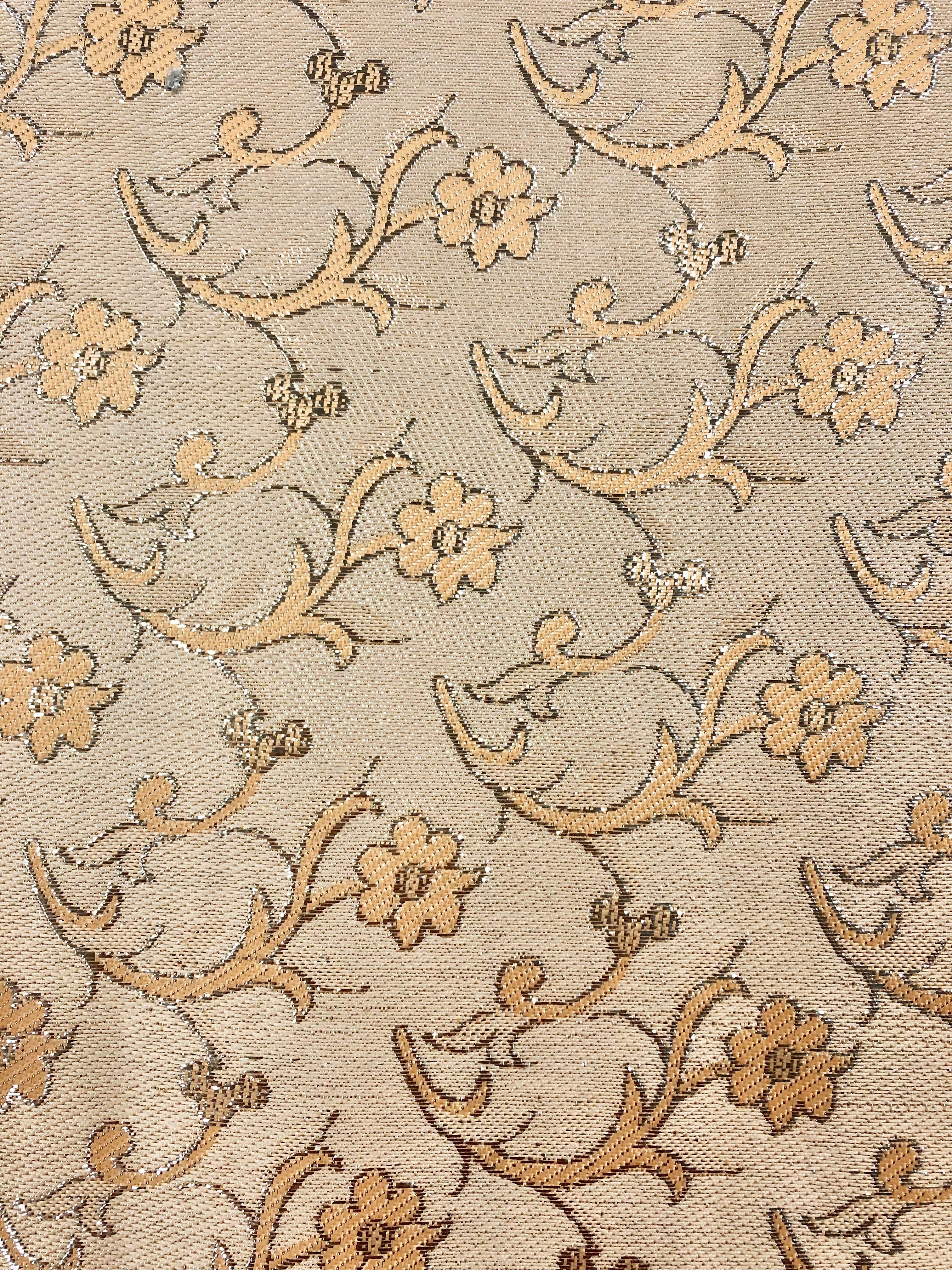 Priced per yard. Peach with silver metallic brocade with flower print. 45-inches wide. Great weight for ballet bodices. Beautiful, feminine print.