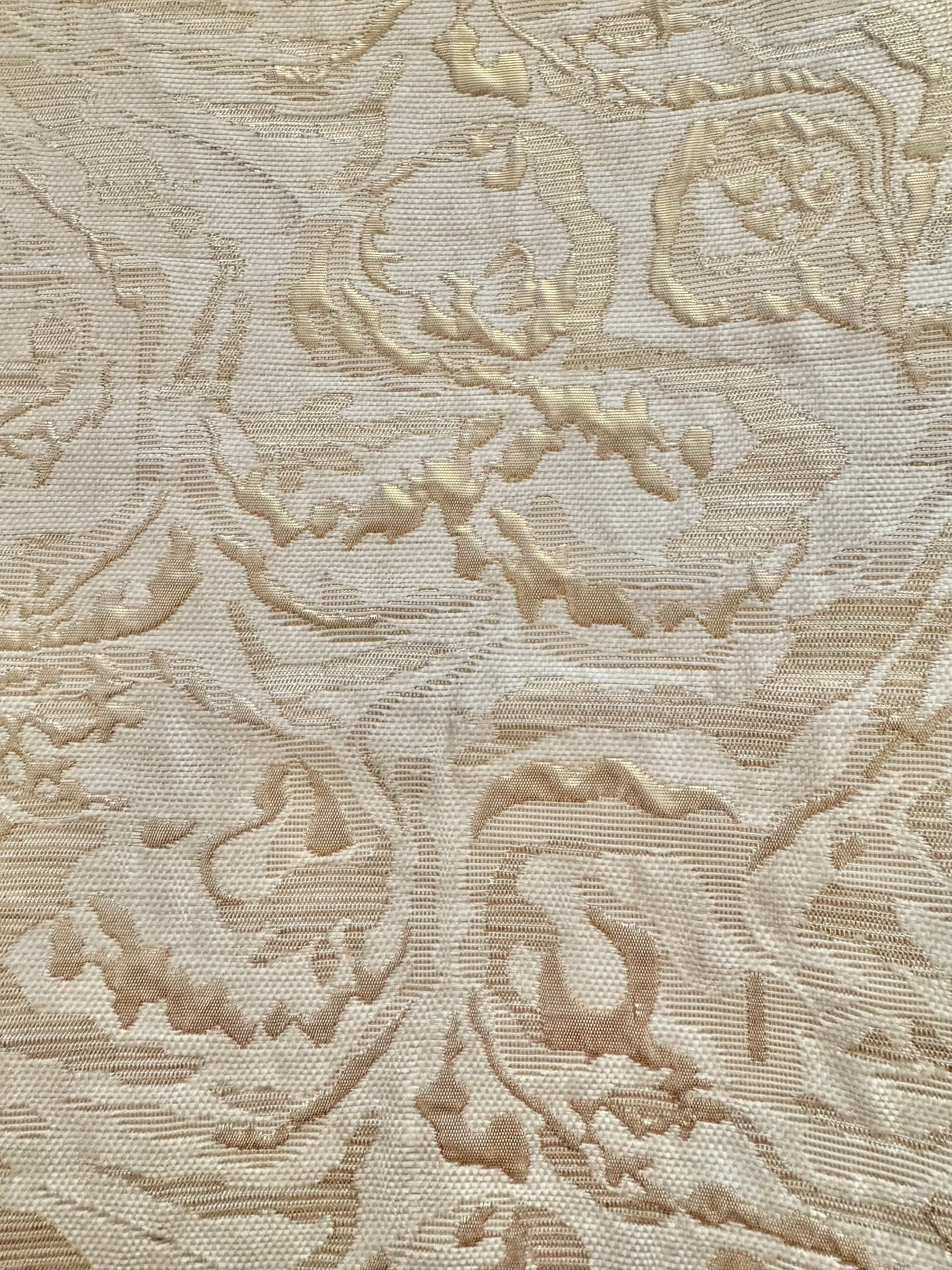 Priced per yard. Gorgeous, pale gold on ivory cream, reversible brocade. 52-inches wide.