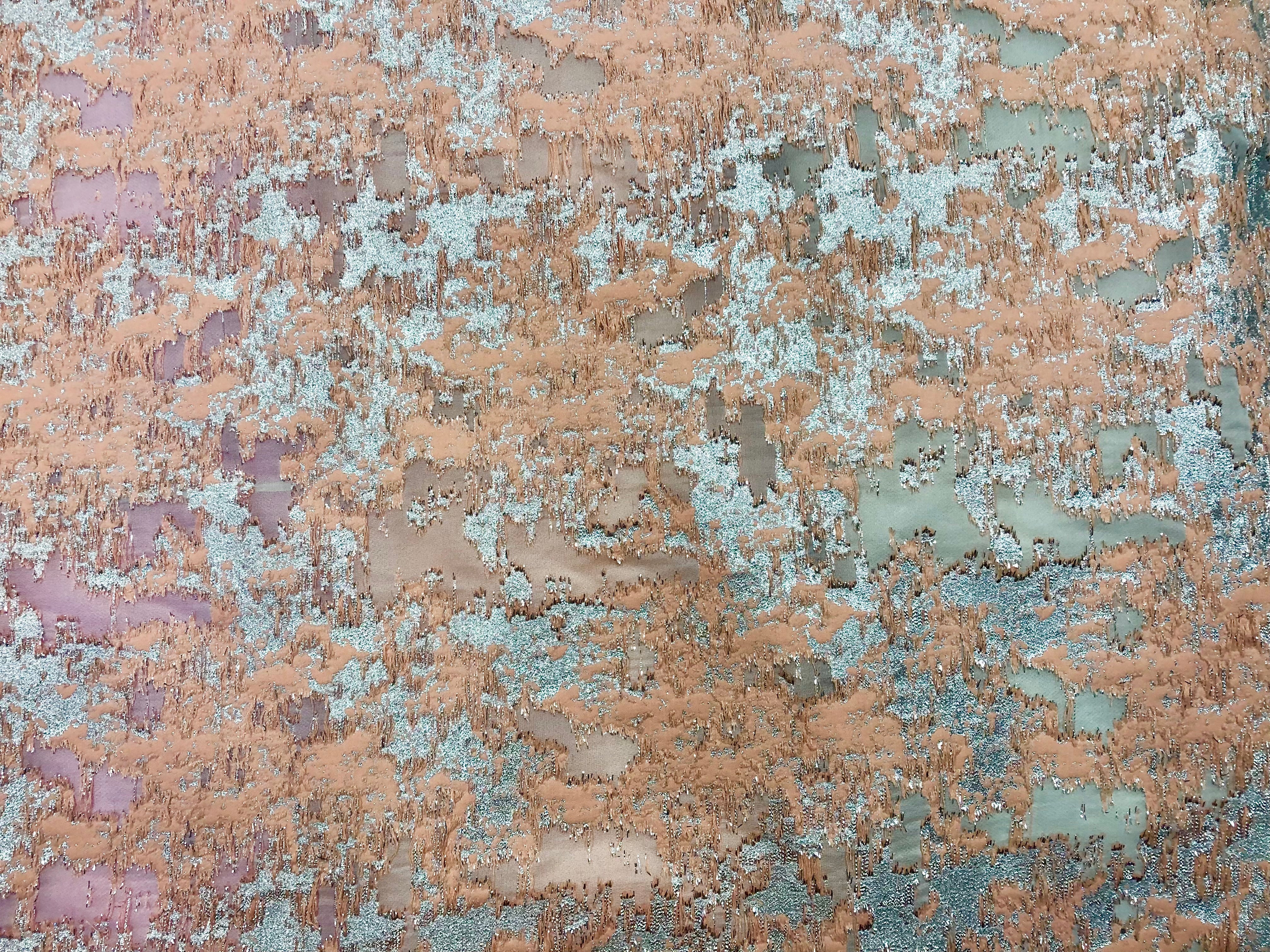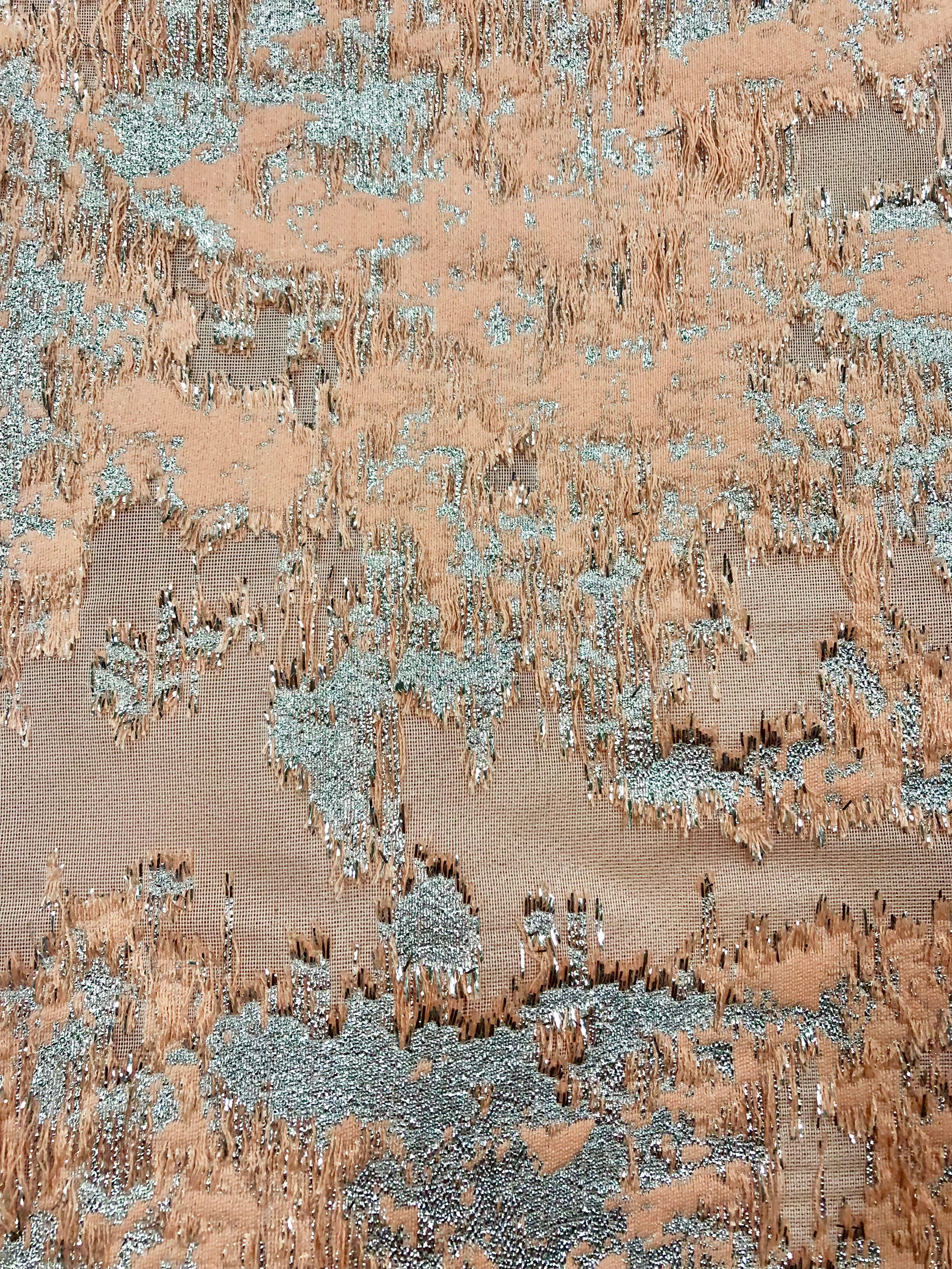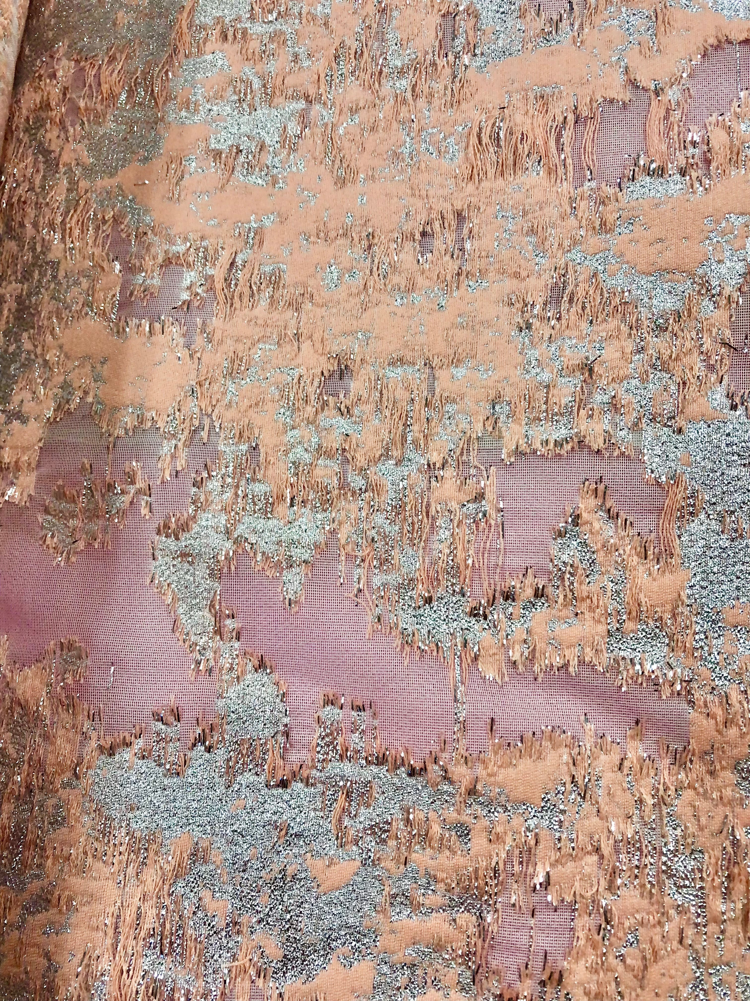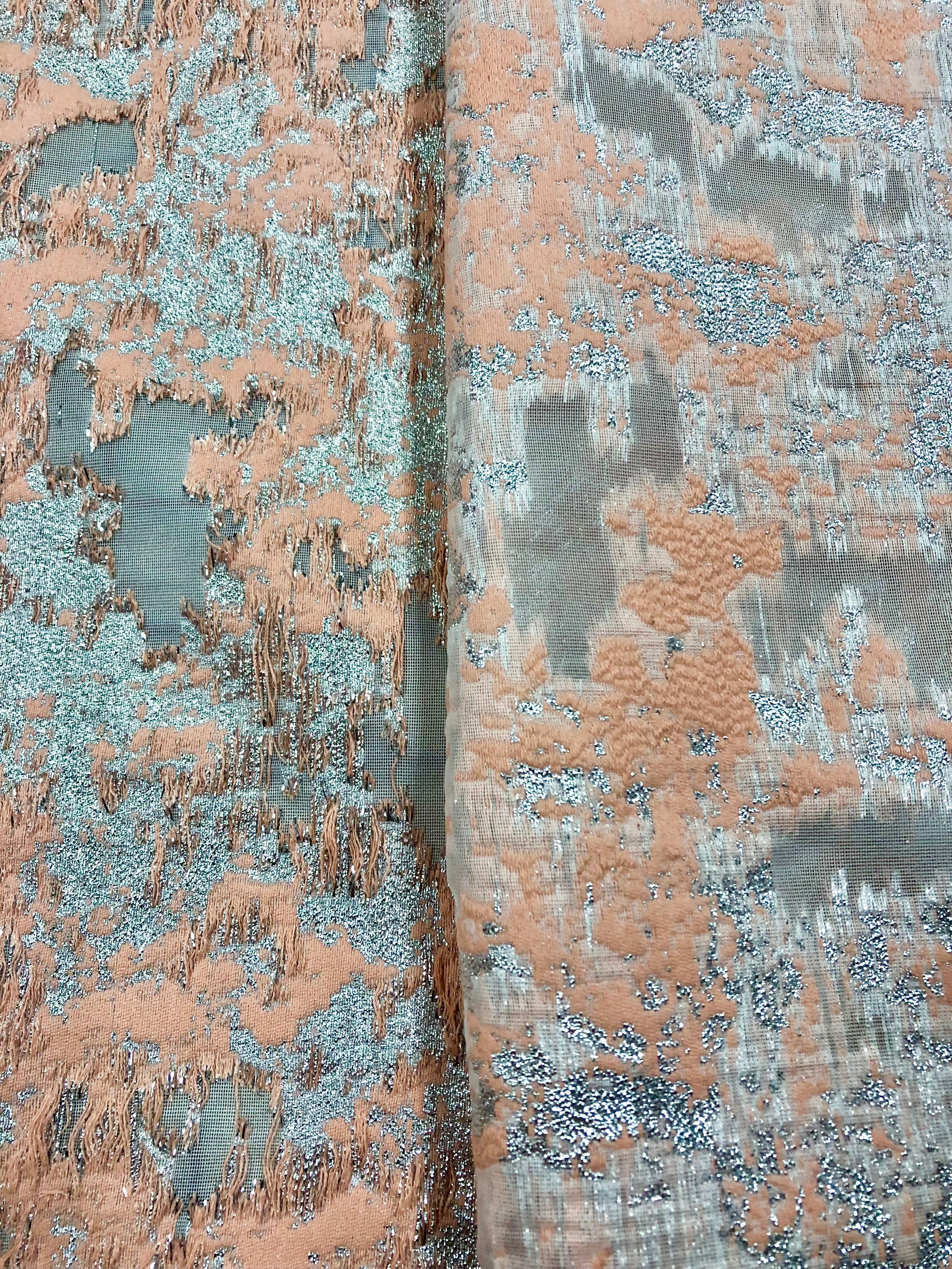 Priced per yard. Gorgeous, peach and white with palest metallic silver organza brocade. 60-inches wide.