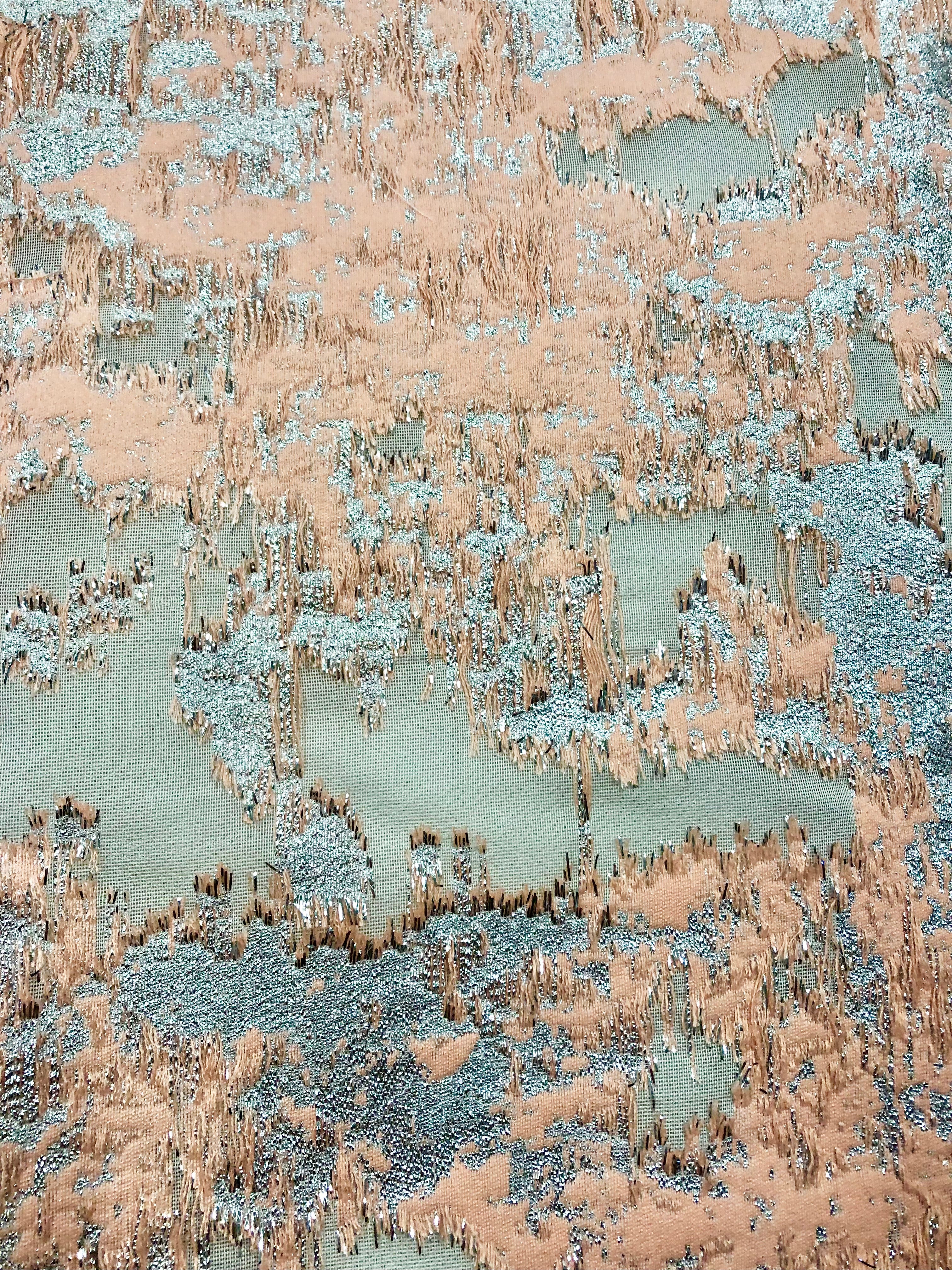 This fabric is similar to a burn-out velvet. It is brocade on a strong, stiff organza. Can be used alone, over a lining fabric, or on top of another fabric.